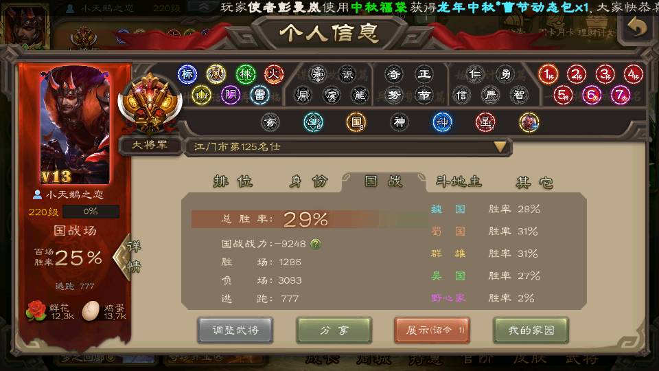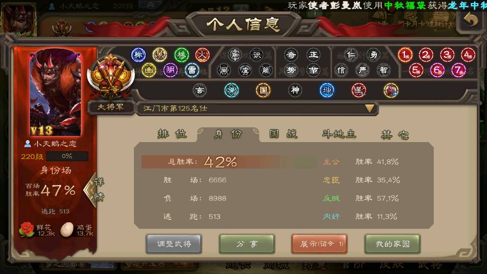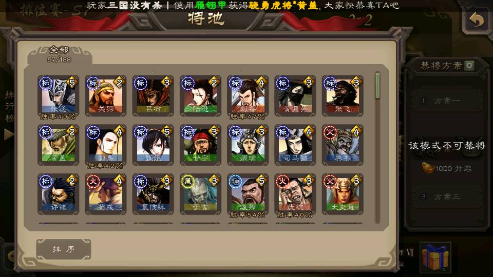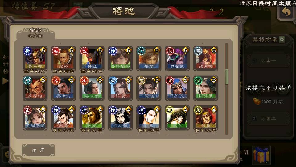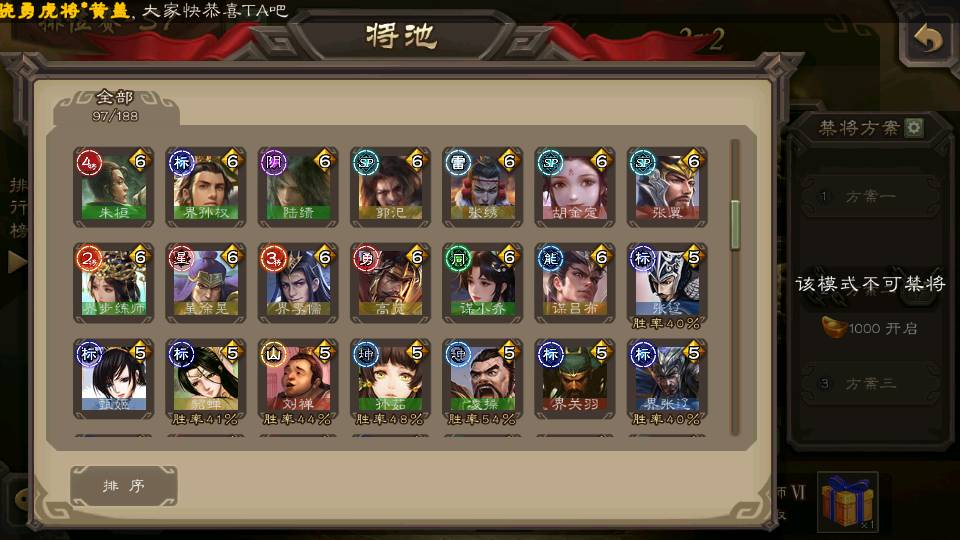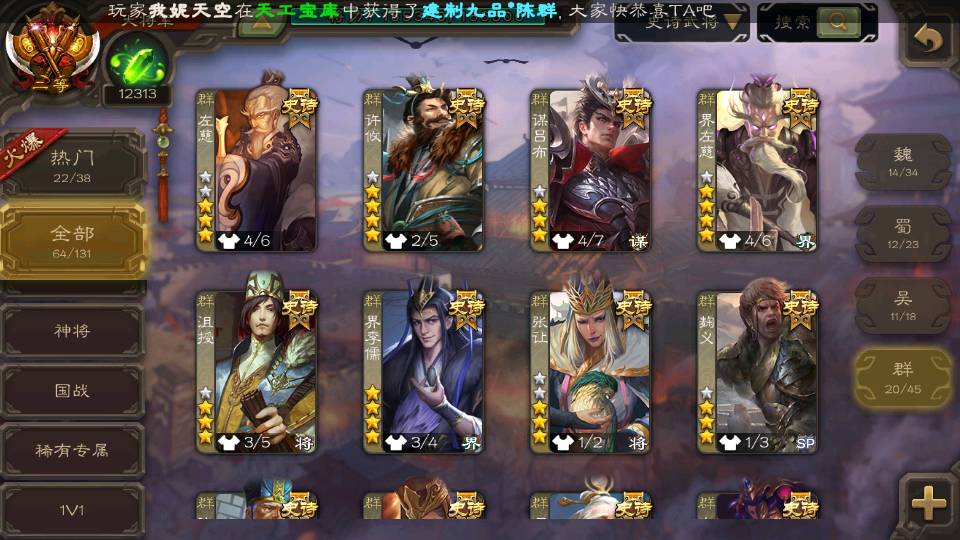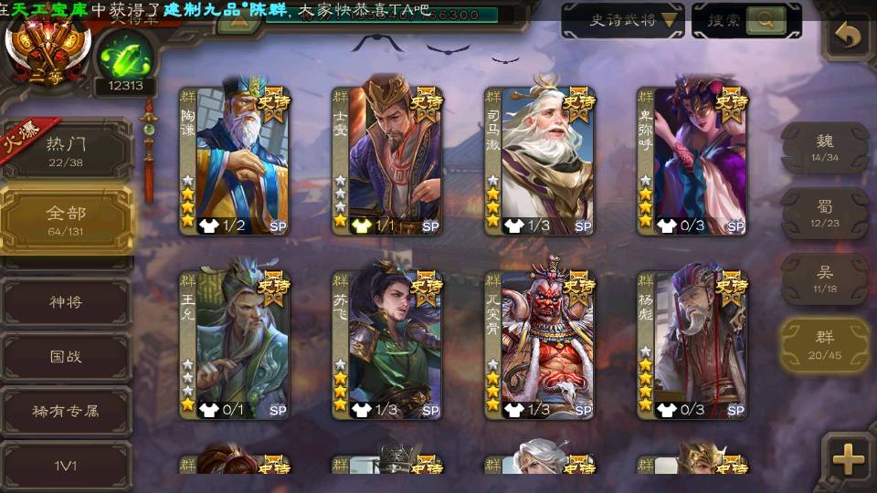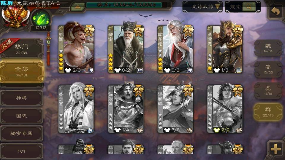 (群雄):杨彪,祢衡,界左慈,南华老仙,麴义,许攸,谋吕布,张让,界李儒,苏飞,卑弥呼,士燮,郑玄,王允,陶谦,司马徽,星黄忠,左慈,沮授,兀突骨