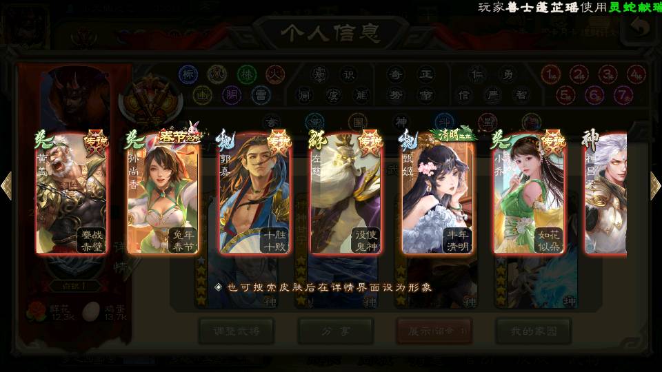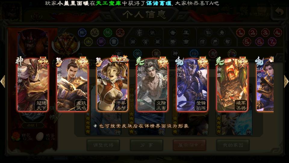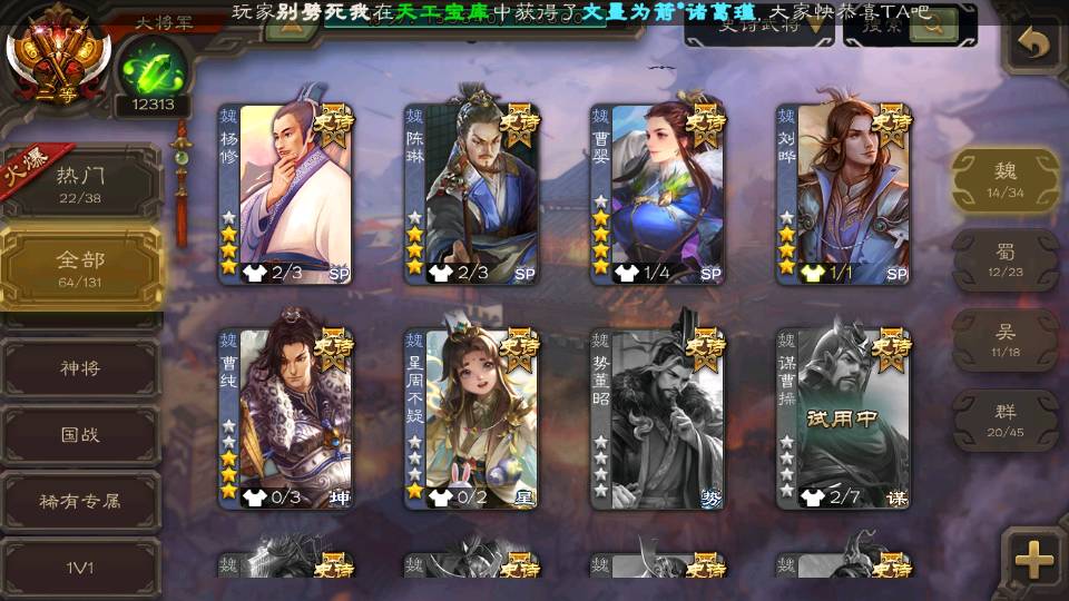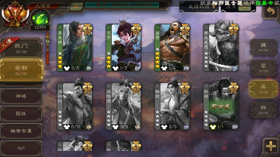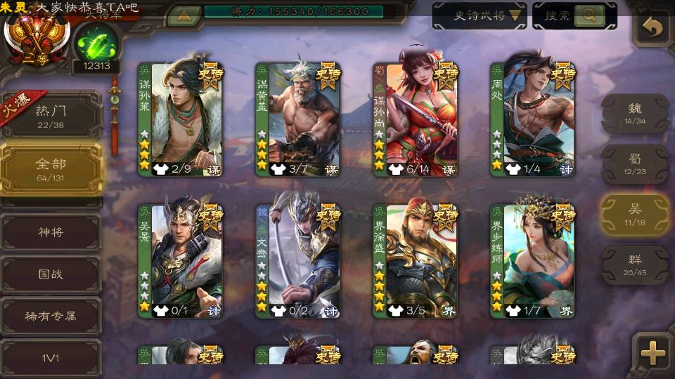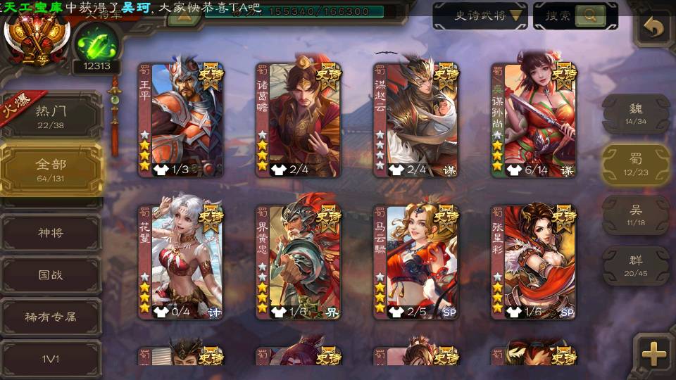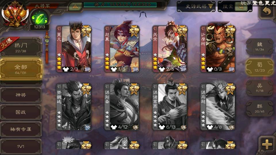 (蜀国):谋孙尚香,诸葛瞻,界黄忠,沙摩柯,花鬘,谋赵云,关索,张星彩,王平,马云騄,董允,赵襄