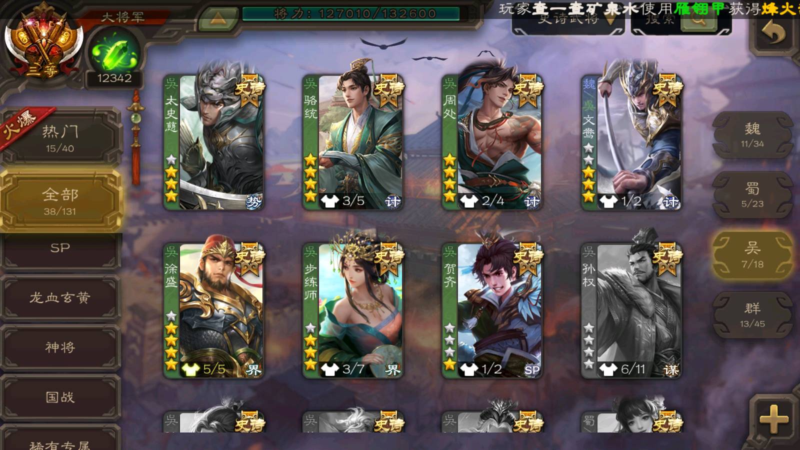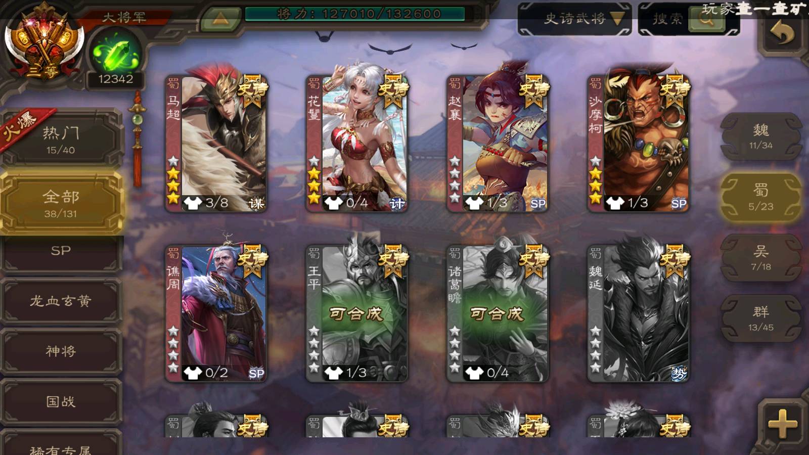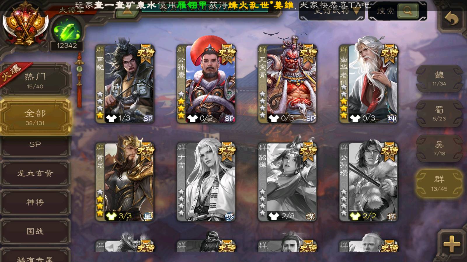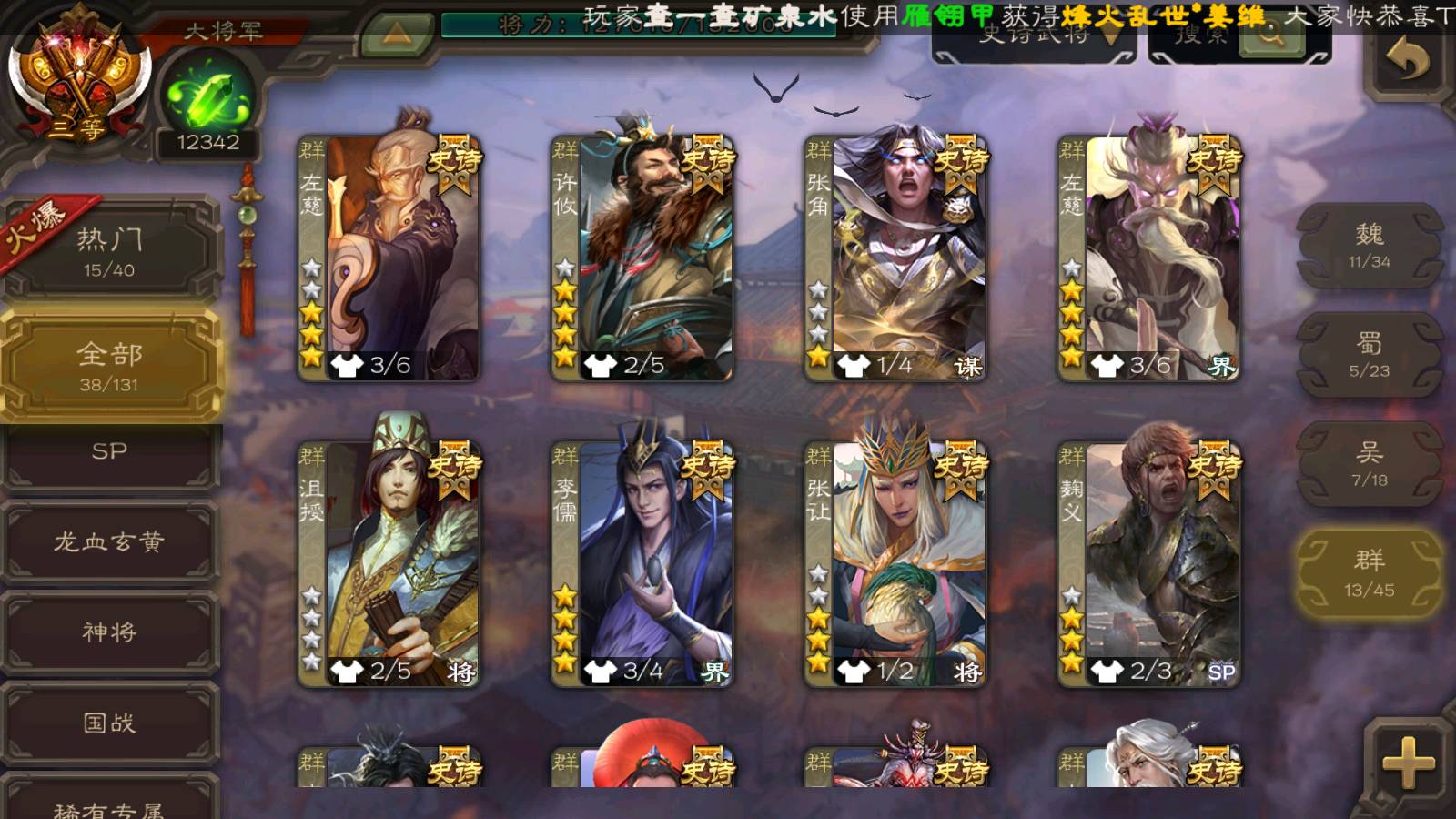 (群雄):南华老仙,界左慈,麴义,许攸,张让,界李儒,谋张角,公孙康,审配,星黄忠,左慈,沮授,兀突骨
