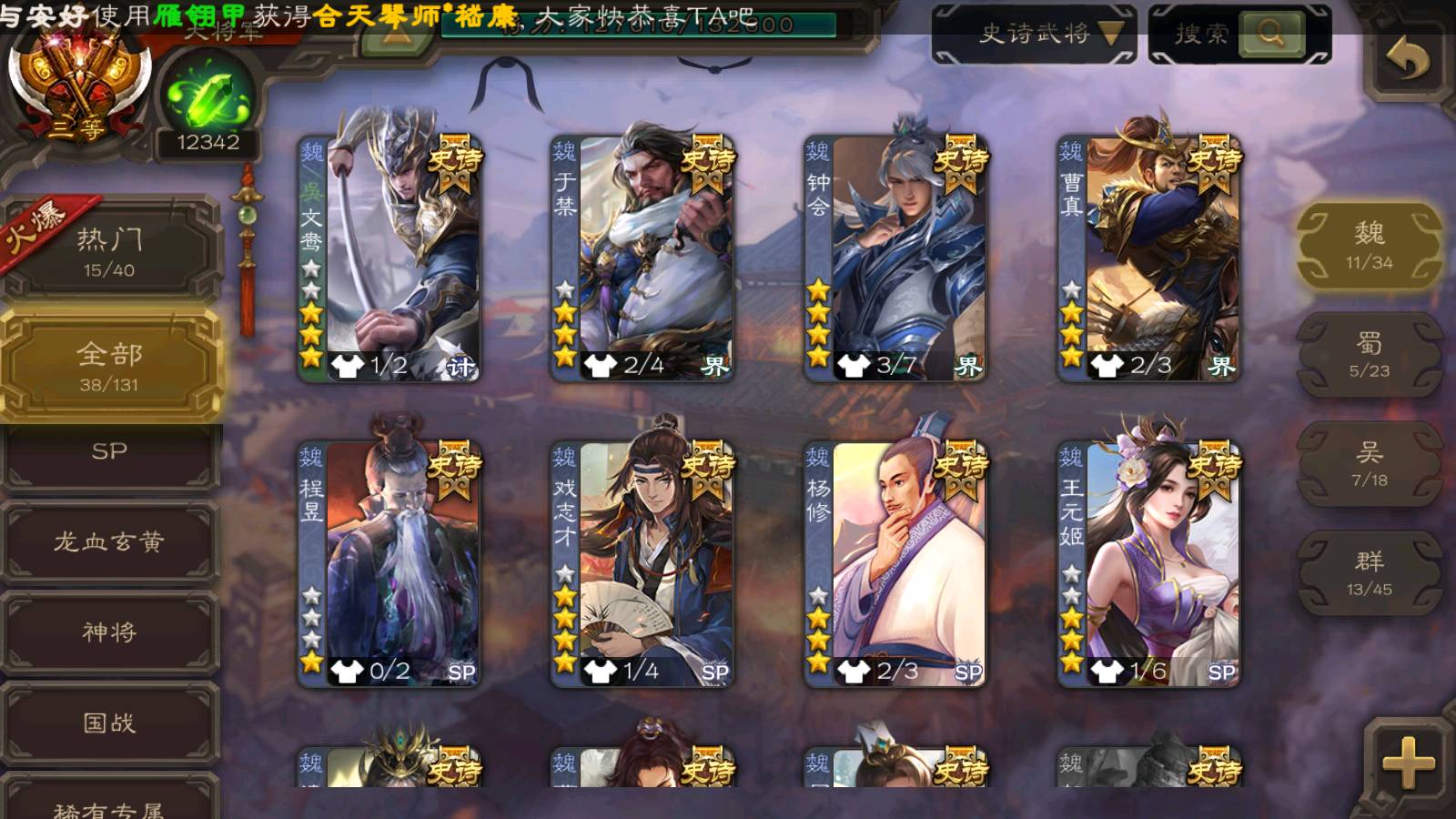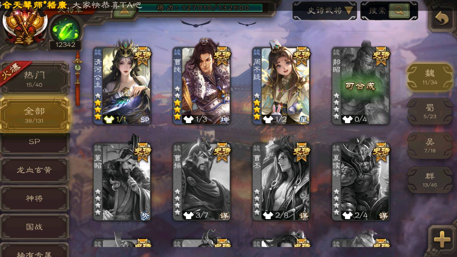 (魏国):文鸯,界钟会,界于禁,界曹真,清河公主,王元姬,戏志才,星周不疑,程昱,曹纯,杨修