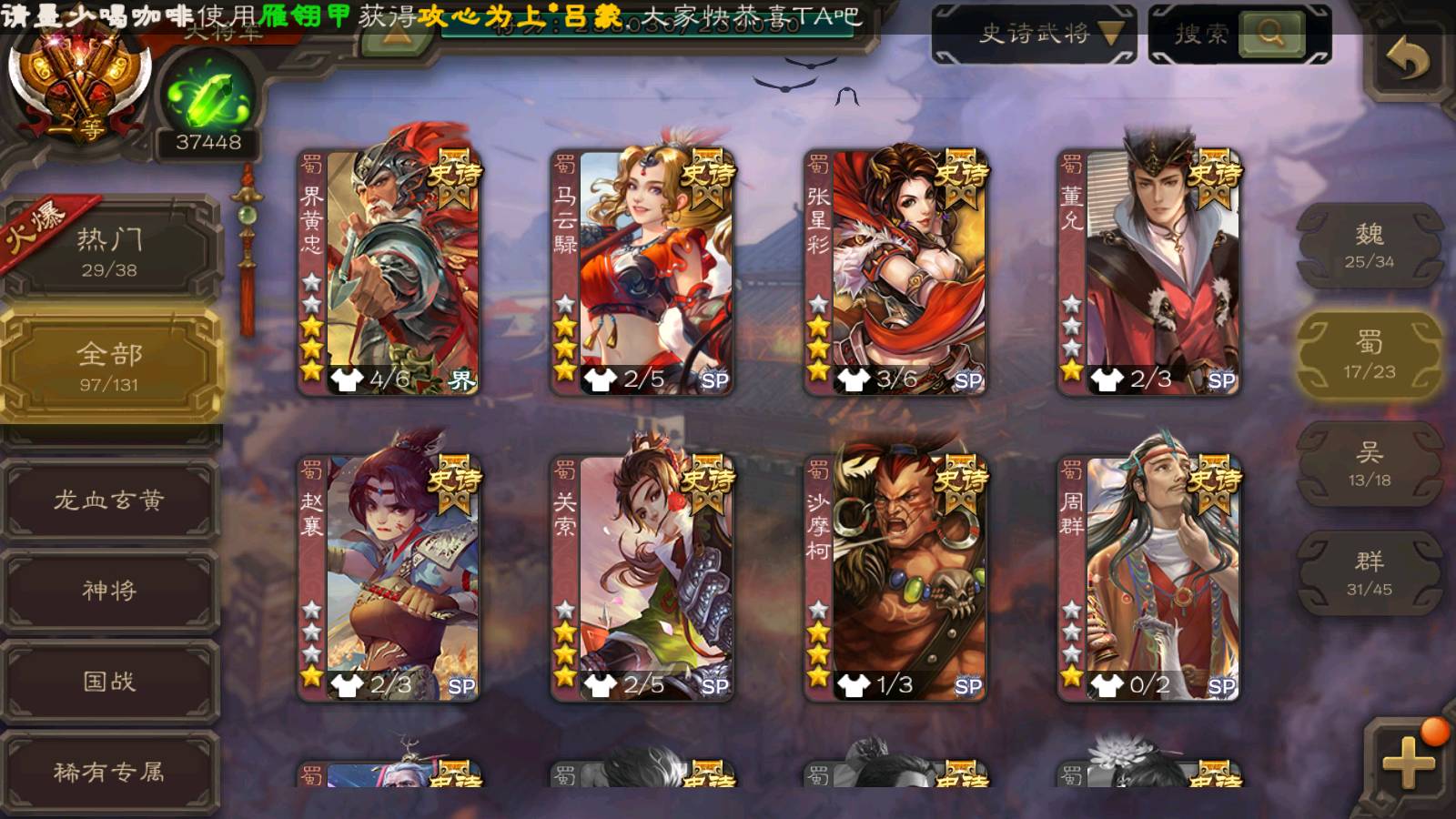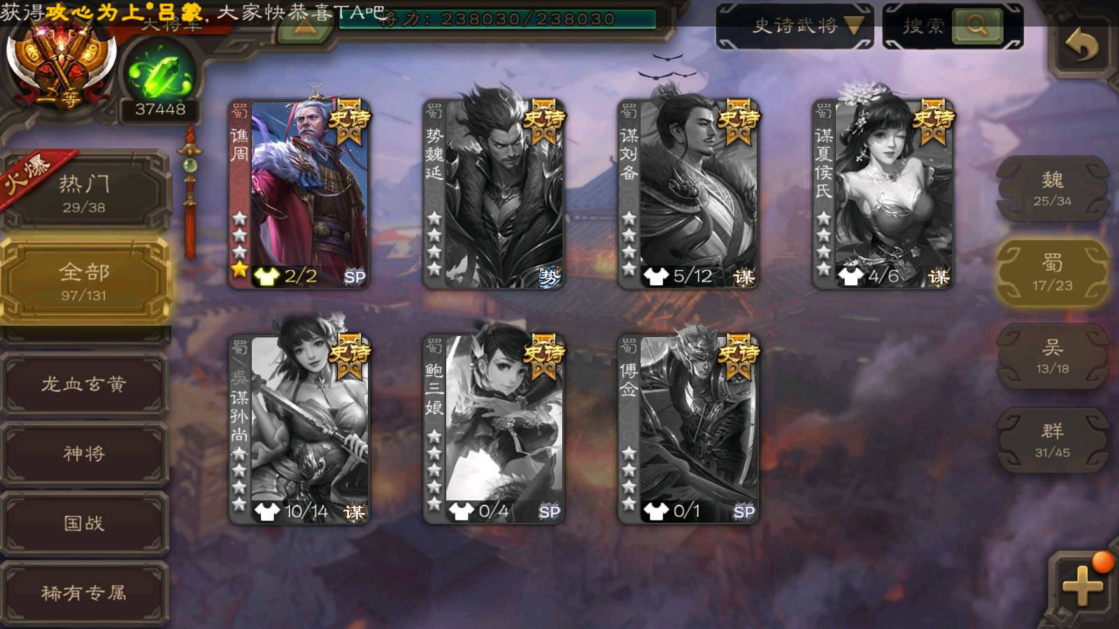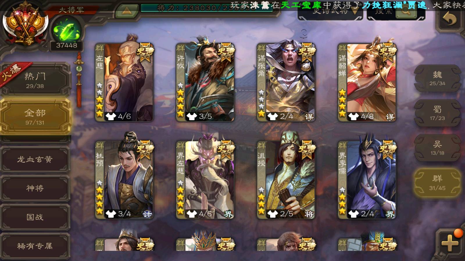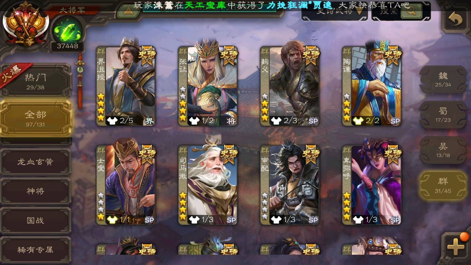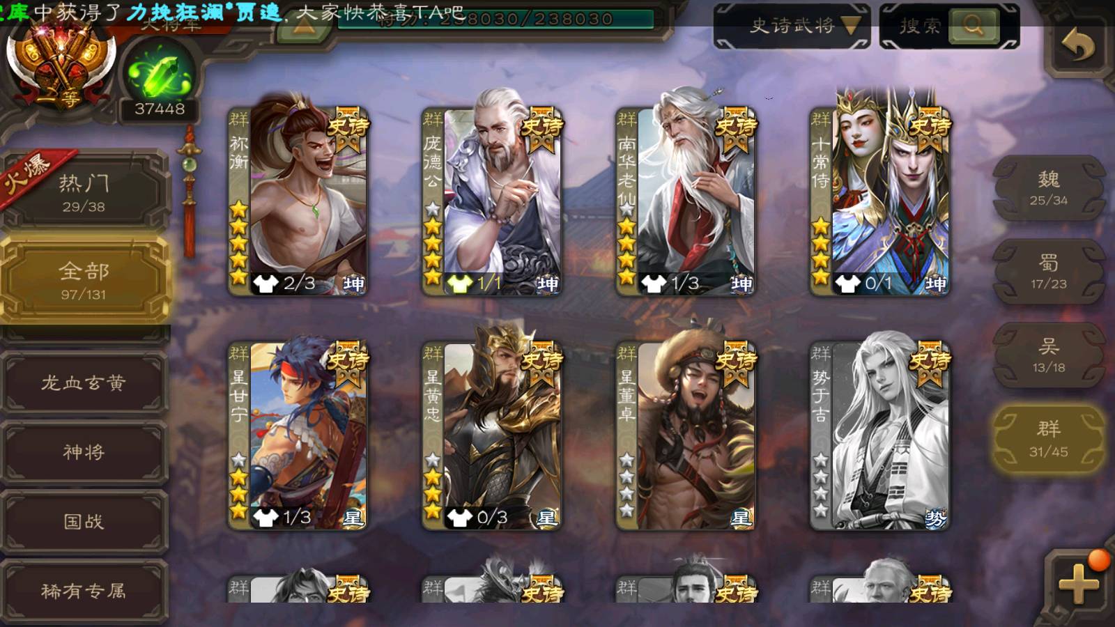 (群雄):刘焉,杜预,祢衡,界左慈,界沮授,南华老仙,麴义,许攸,十常侍,星董卓,谋貂蝉,司马昭,张让,界李儒,苏飞,庞德公,星甘宁,张琪瑛,裴秀,卑弥呼,士燮,谋张角,王允,公孙康,陶谦,审配,星黄忠,司马徽,左慈,沮授,兀突骨