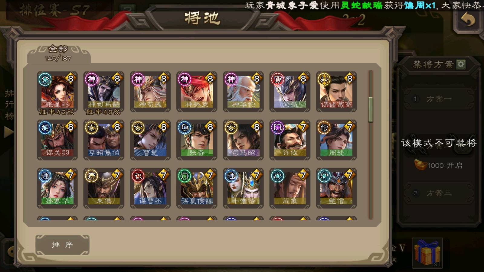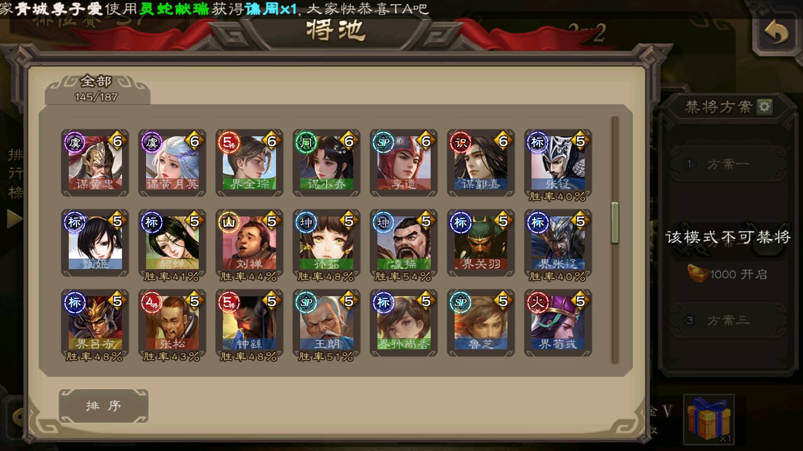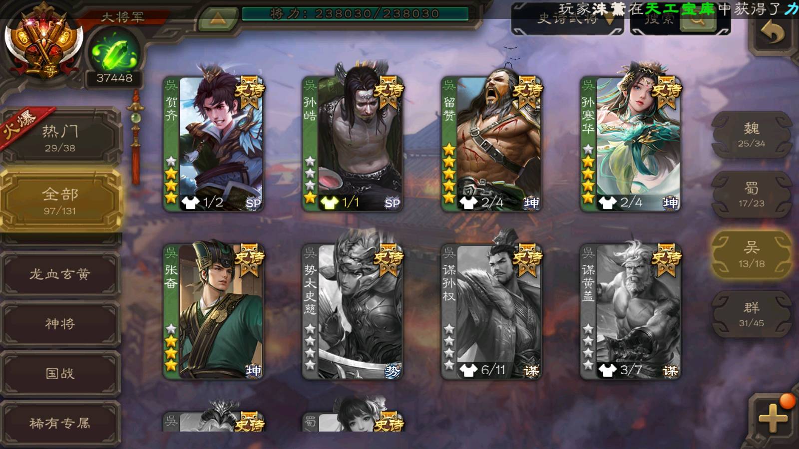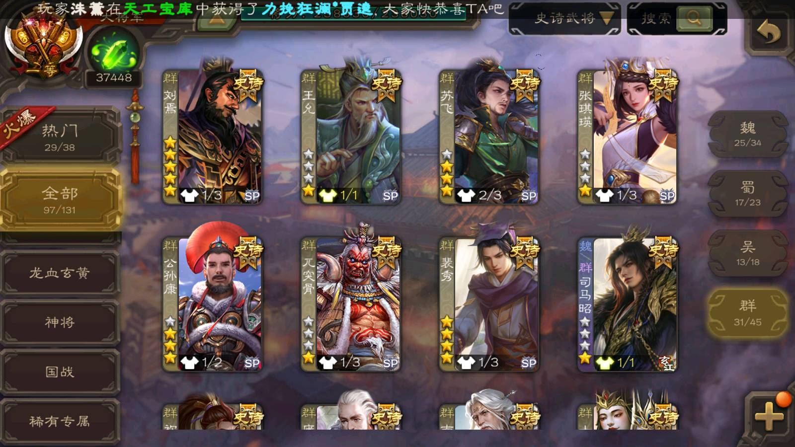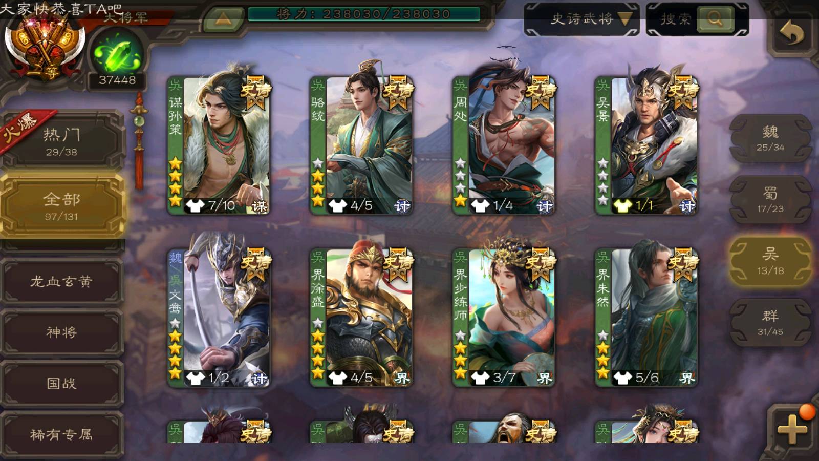 (群雄):刘焉,杜预,祢衡,界左慈,界沮授,南华老仙,麴义,许攸,十常侍,星董卓,谋貂蝉,司马昭,张让,界李儒,苏飞,庞德公,星甘宁,张琪瑛,裴秀,卑弥呼,士燮,谋张角,王允,公孙康,陶谦,审配,星黄忠,司马徽,左慈,沮授,兀突骨