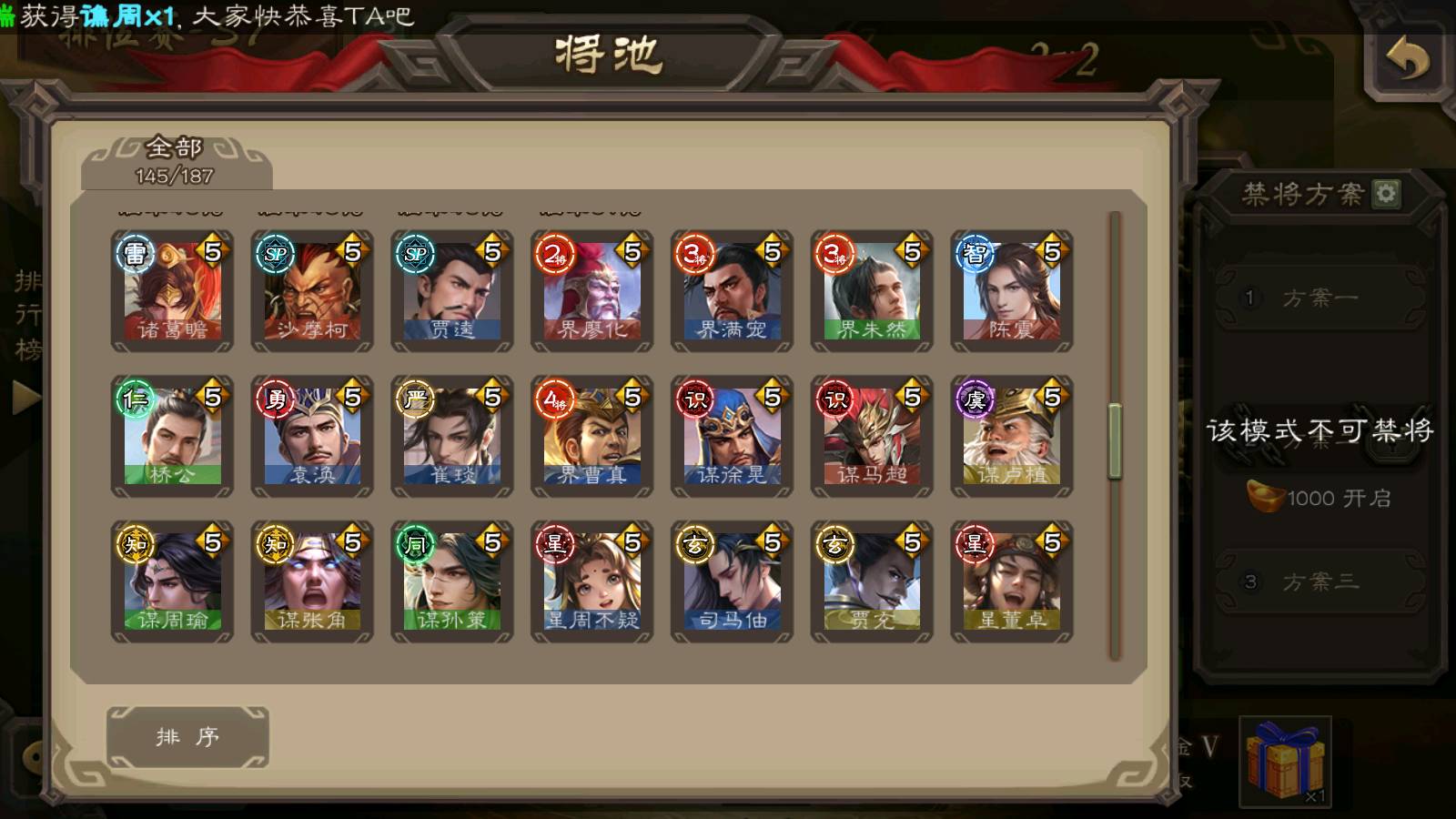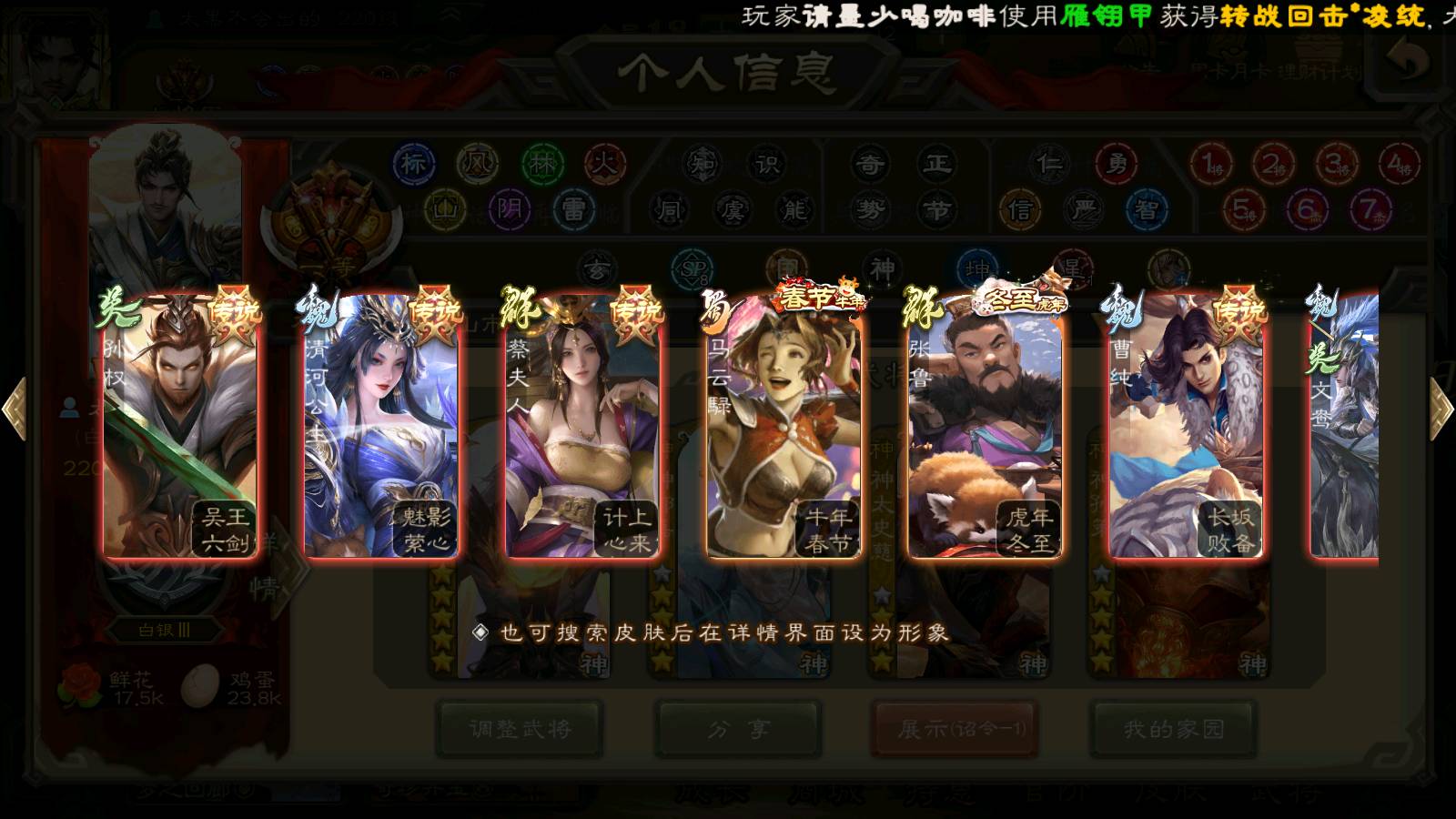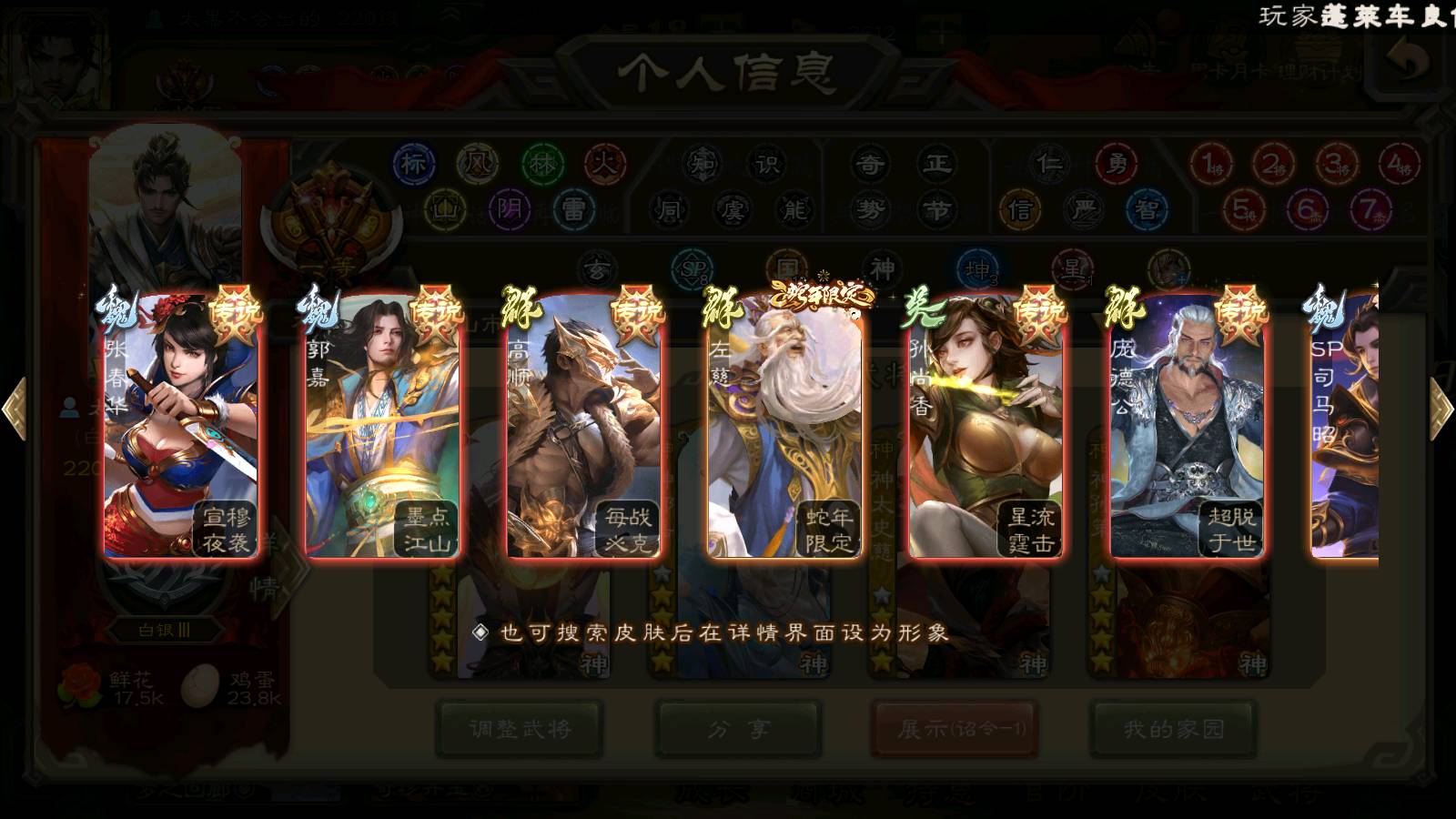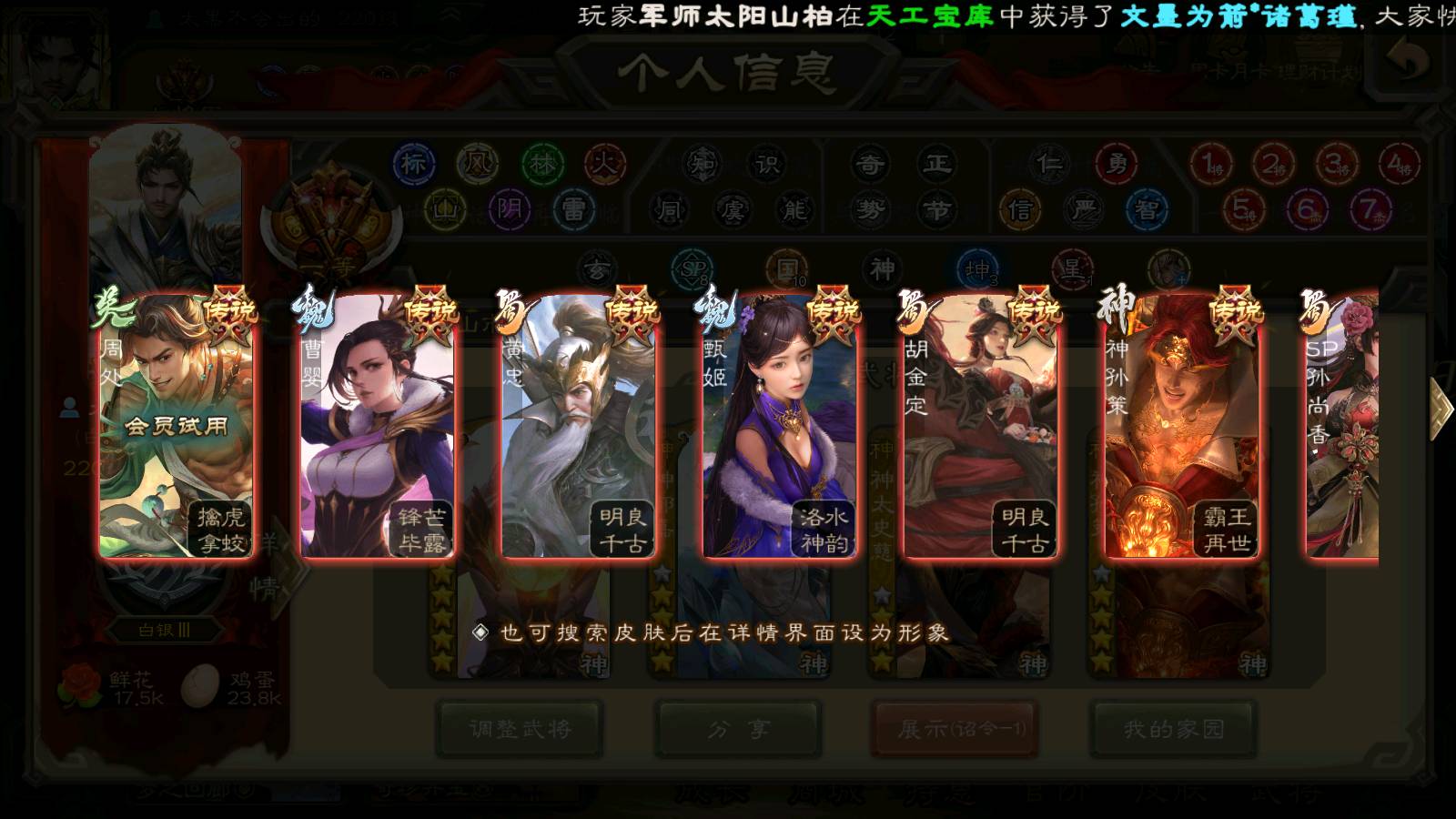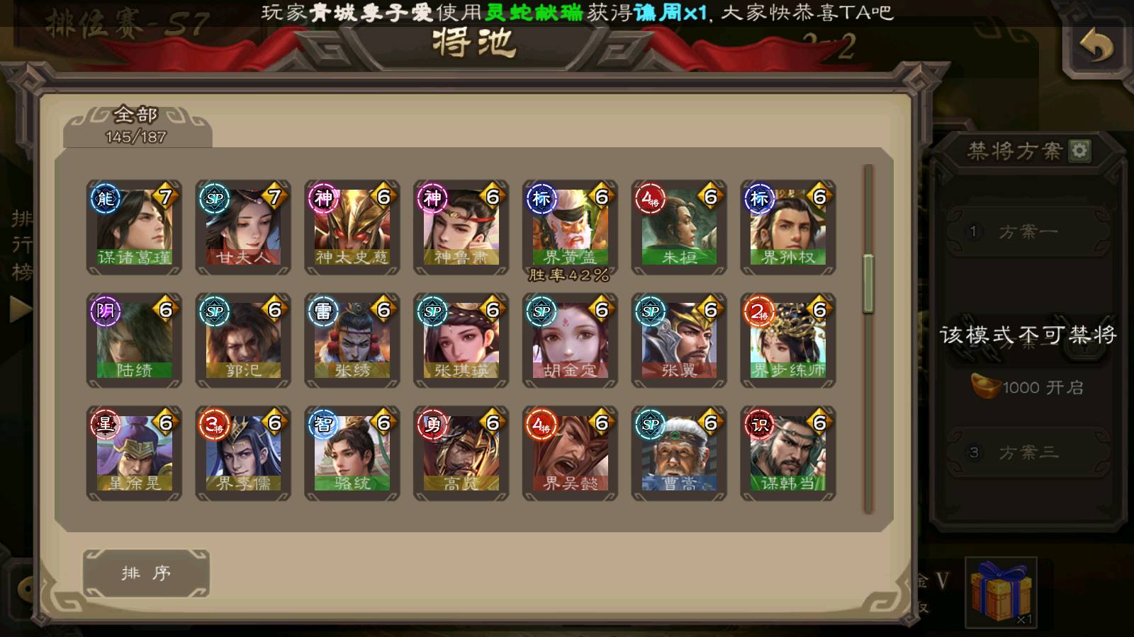 (群雄):刘焉,杜预,祢衡,界左慈,界沮授,南华老仙,麴义,许攸,十常侍,星董卓,谋貂蝉,司马昭,张让,界李儒,苏飞,庞德公,星甘宁,张琪瑛,裴秀,卑弥呼,士燮,谋张角,王允,公孙康,陶谦,审配,星黄忠,司马徽,左慈,沮授,兀突骨