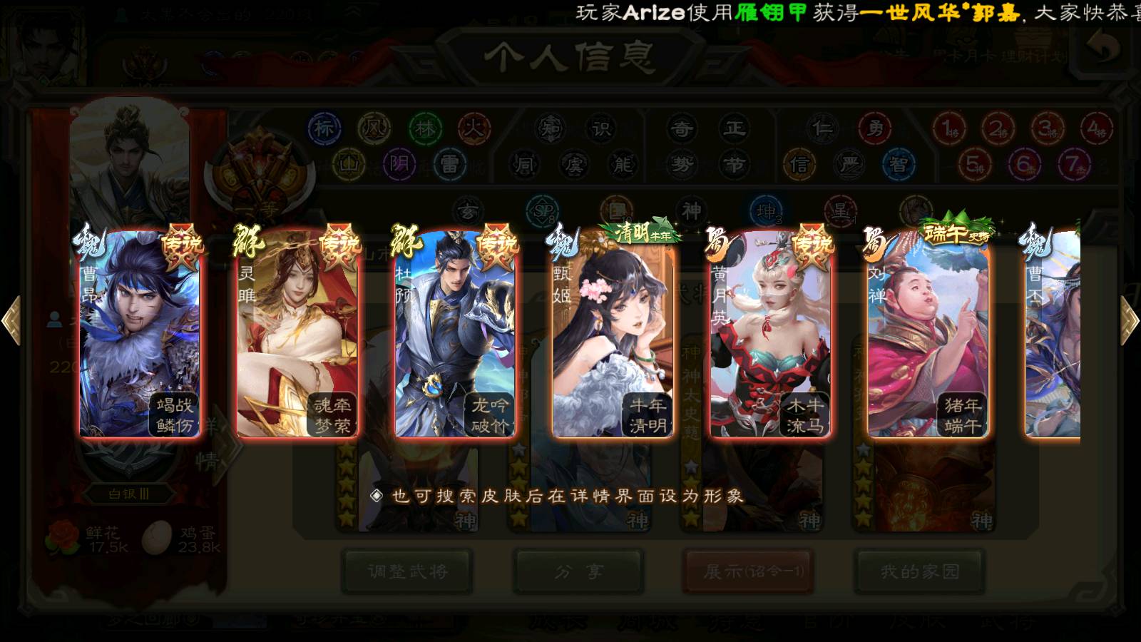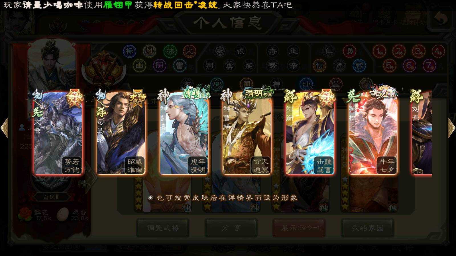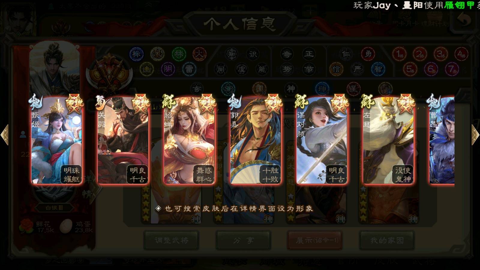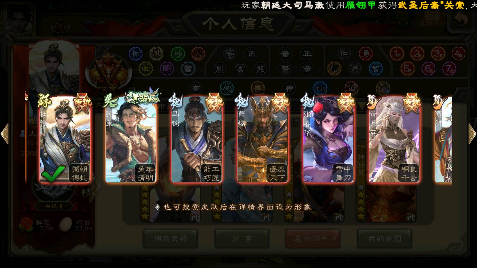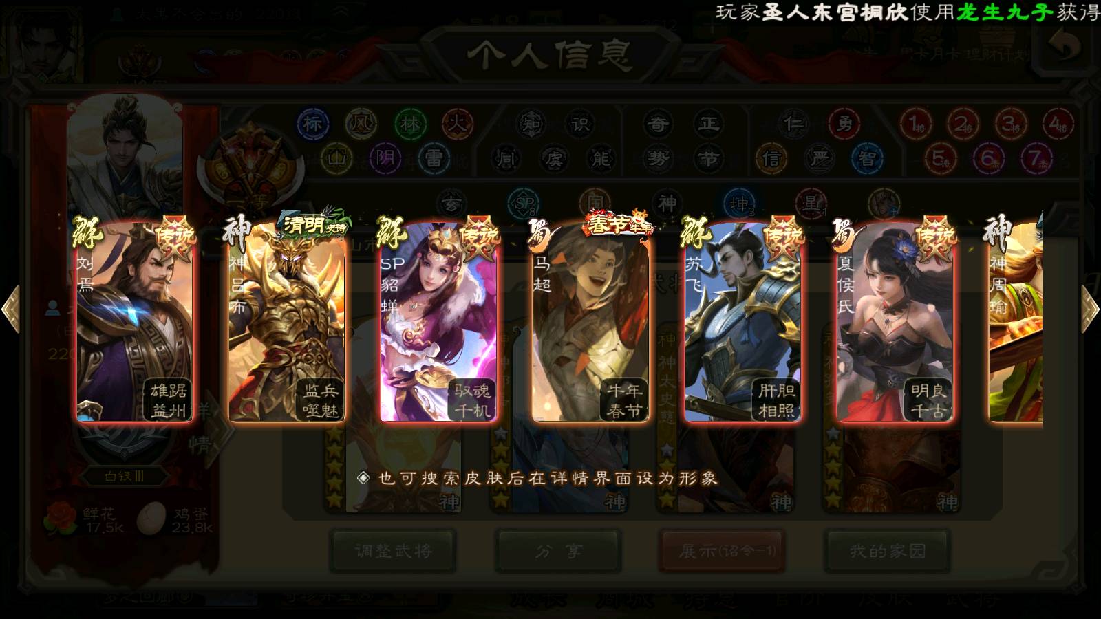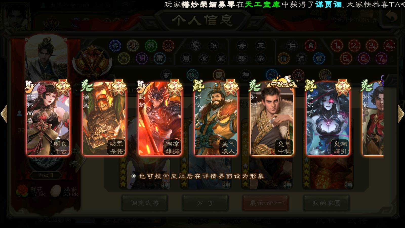 (群雄):刘焉,杜预,祢衡,界左慈,界沮授,南华老仙,麴义,许攸,十常侍,星董卓,谋貂蝉,司马昭,张让,界李儒,苏飞,庞德公,星甘宁,张琪瑛,裴秀,卑弥呼,士燮,谋张角,王允,公孙康,陶谦,审配,星黄忠,司马徽,左慈,沮授,兀突骨