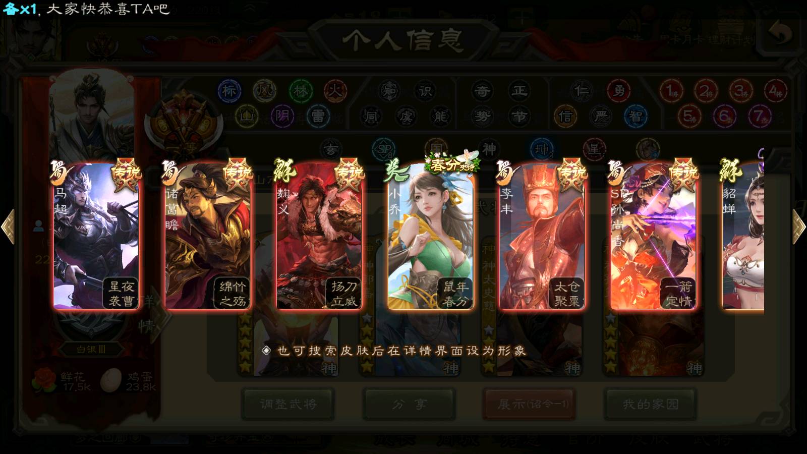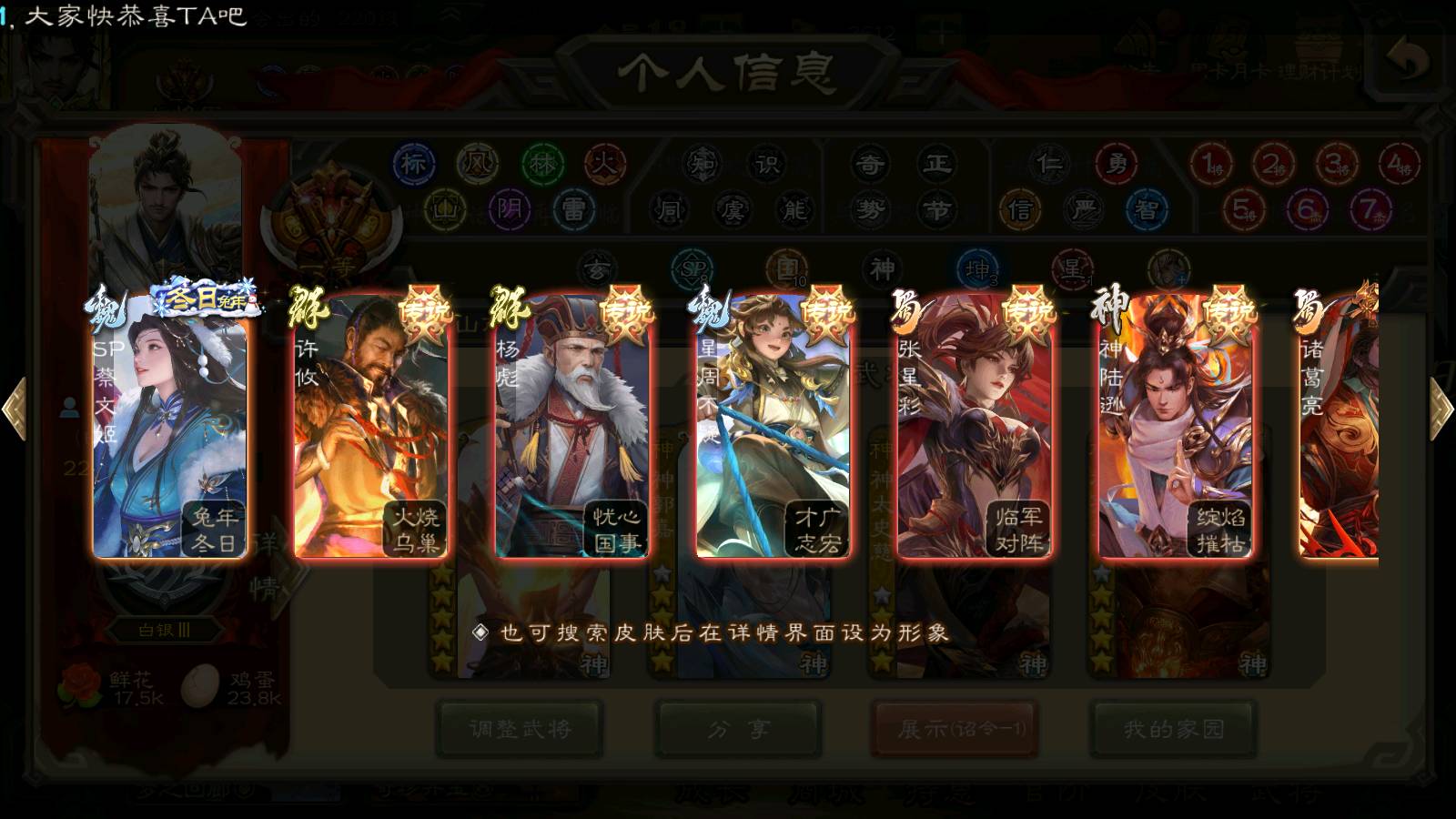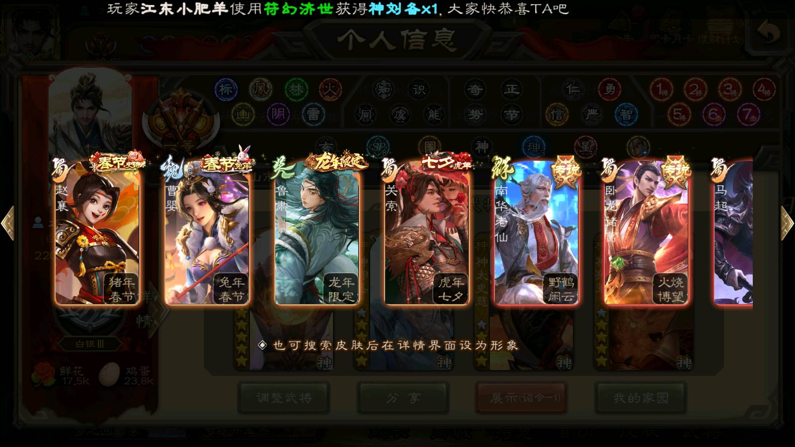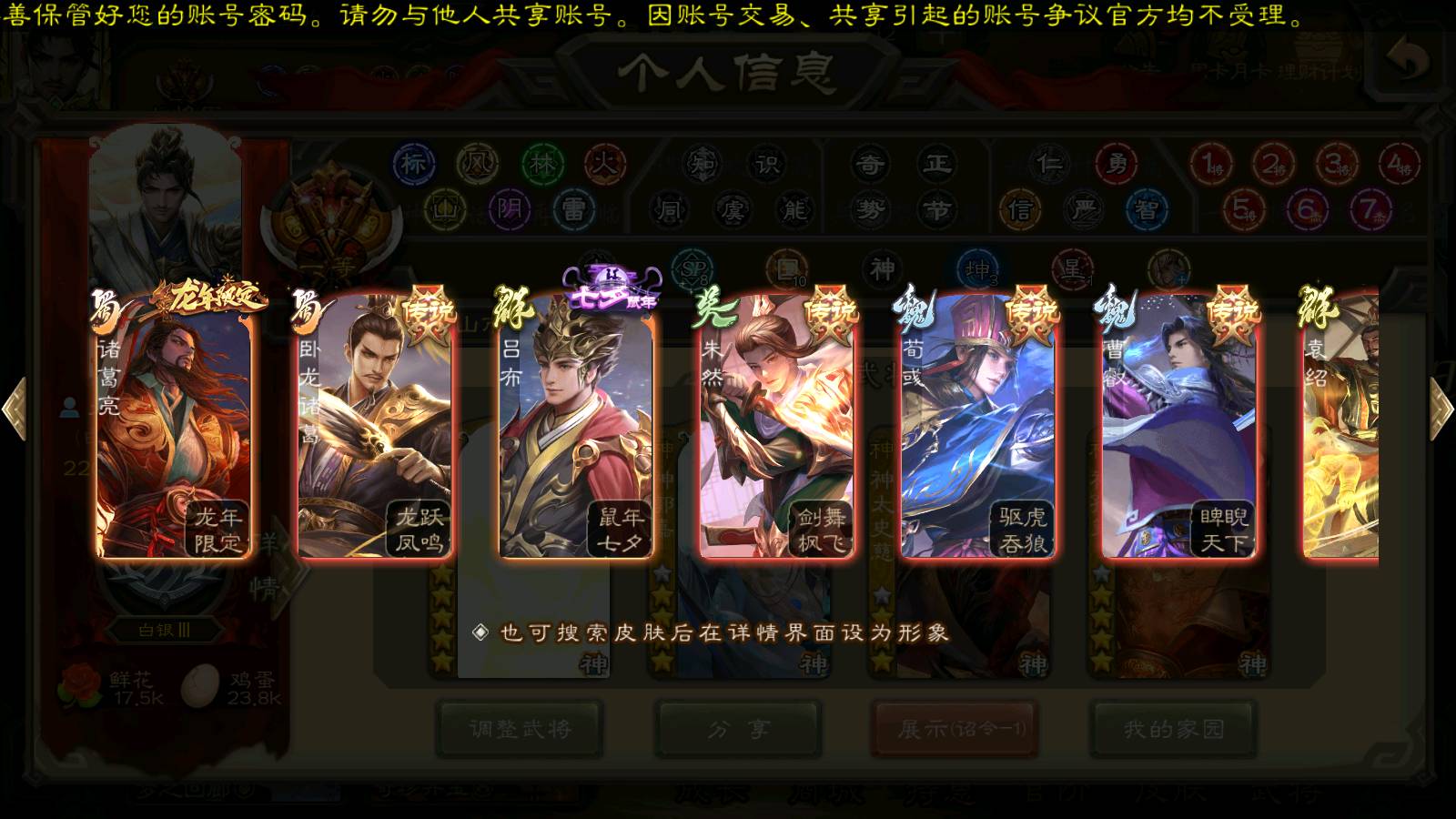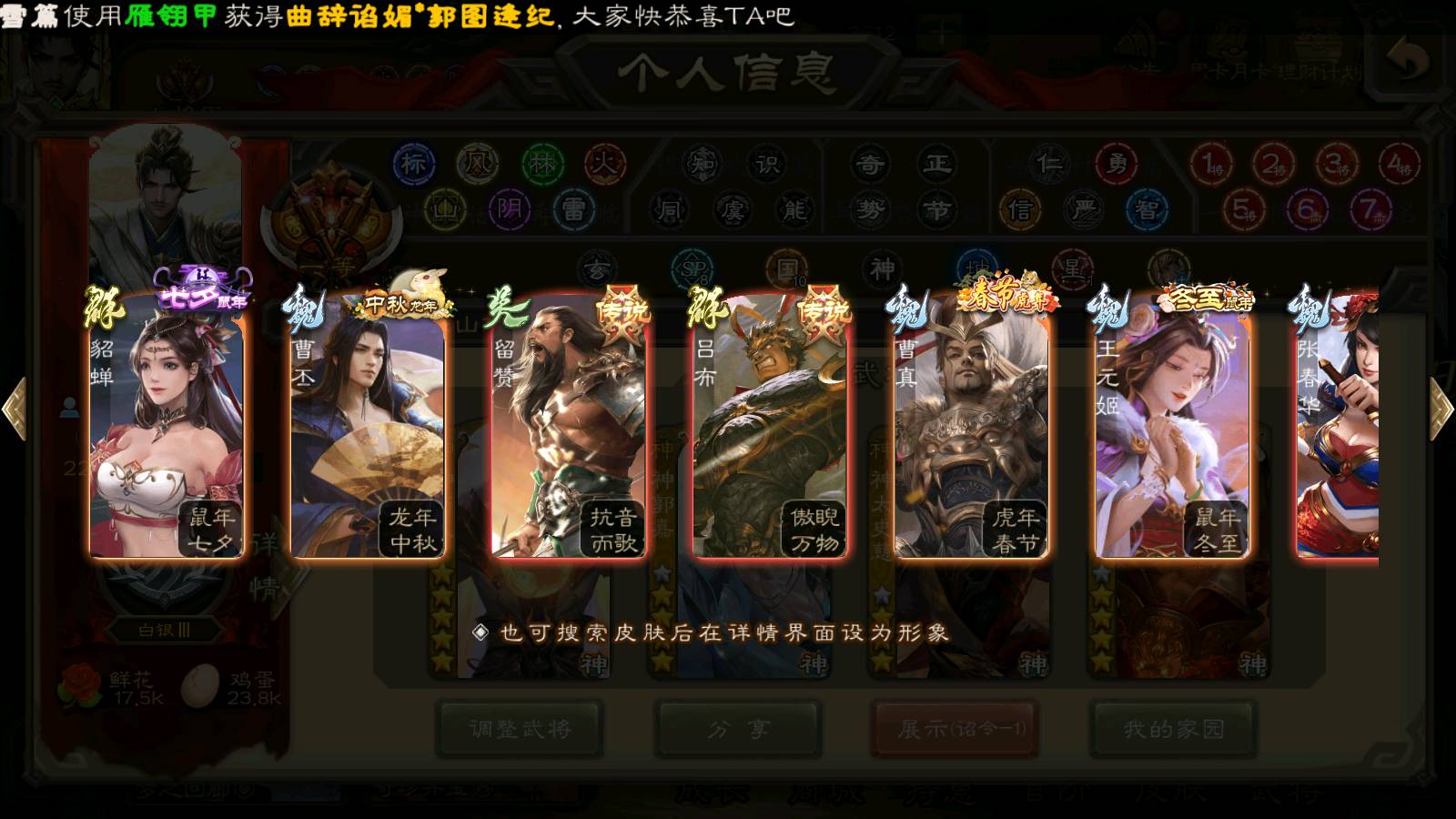(群雄):刘焉,杜预,祢衡,界左慈,界沮授,南华老仙,麴义,许攸,十常侍,星董卓,谋貂蝉,司马昭,张让,界李儒,苏飞,庞德公,星甘宁,张琪瑛,裴秀,卑弥呼,士燮,谋张角,王允,公孙康,陶谦,审配,星黄忠,司马徽,左慈,沮授,兀突骨