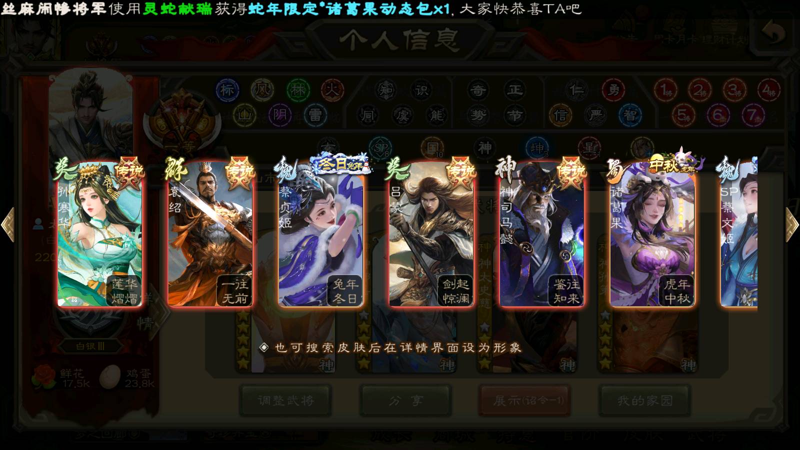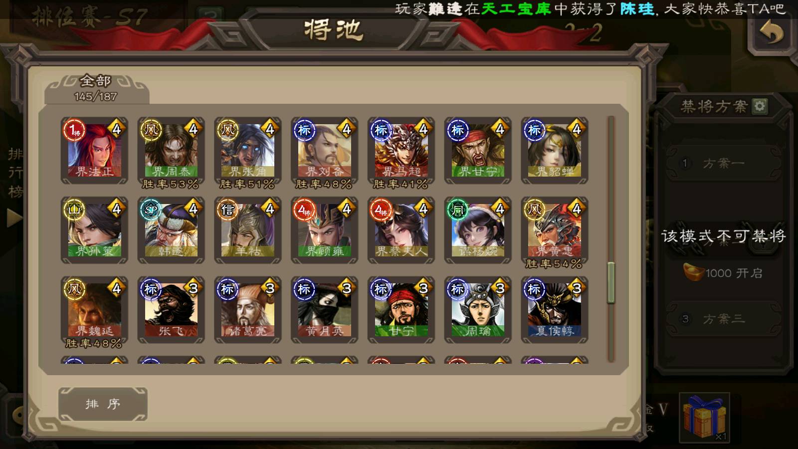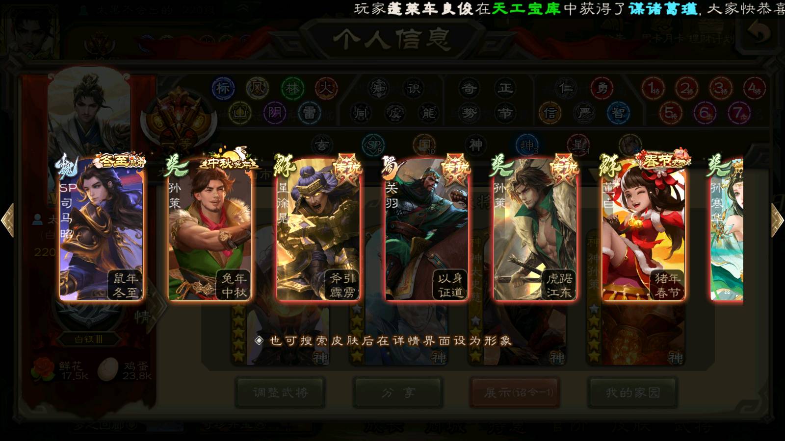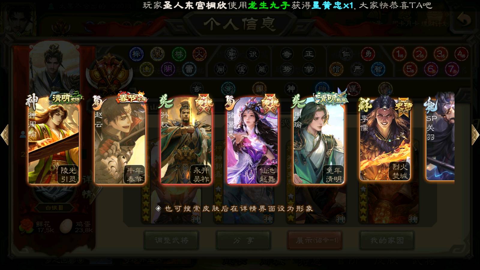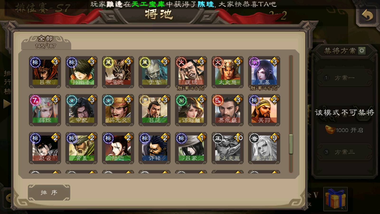 (群雄):刘焉,杜预,祢衡,界左慈,界沮授,南华老仙,麴义,许攸,十常侍,星董卓,谋貂蝉,司马昭,张让,界李儒,苏飞,庞德公,星甘宁,张琪瑛,裴秀,卑弥呼,士燮,谋张角,王允,公孙康,陶谦,审配,星黄忠,司马徽,左慈,沮授,兀突骨