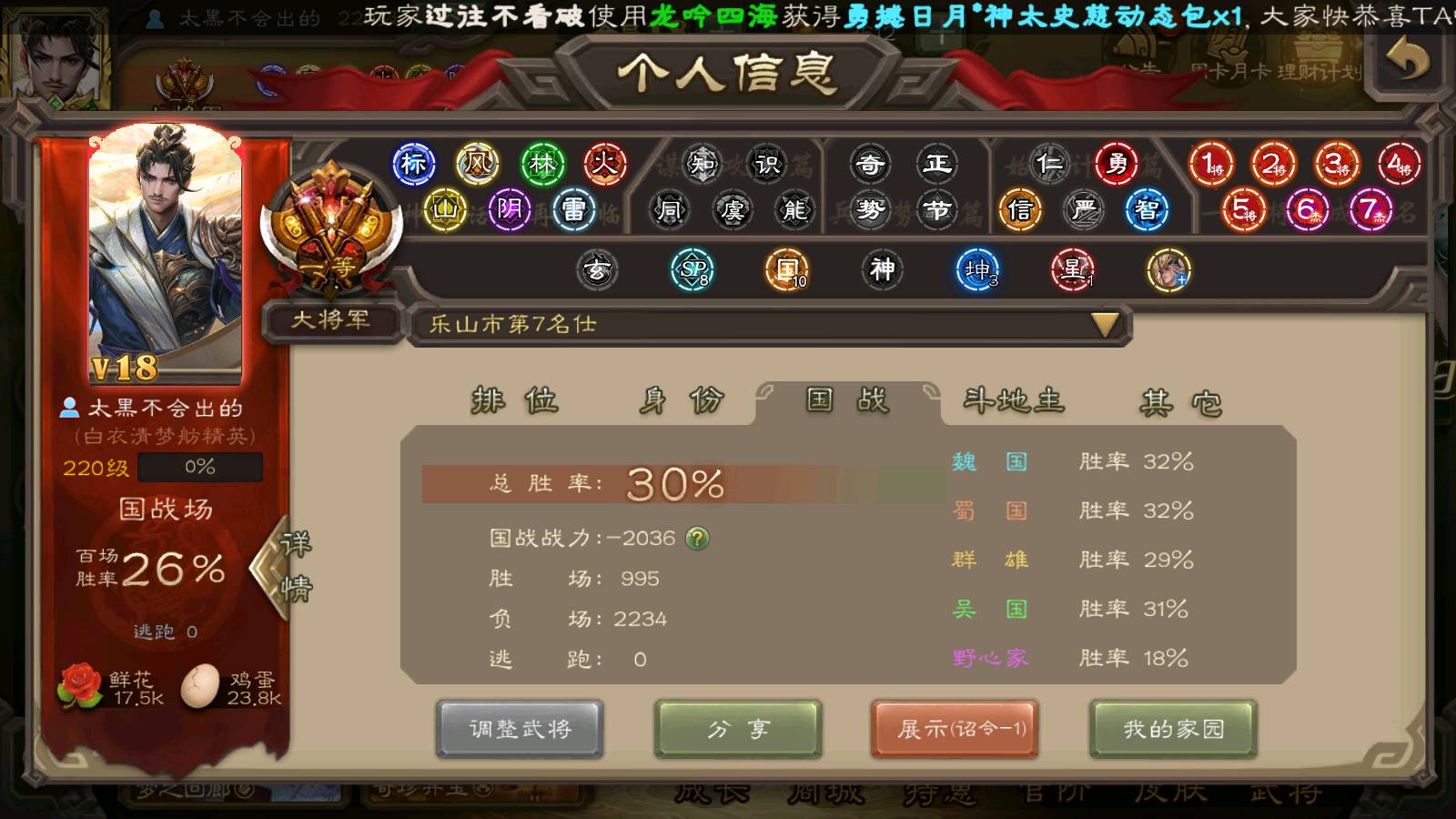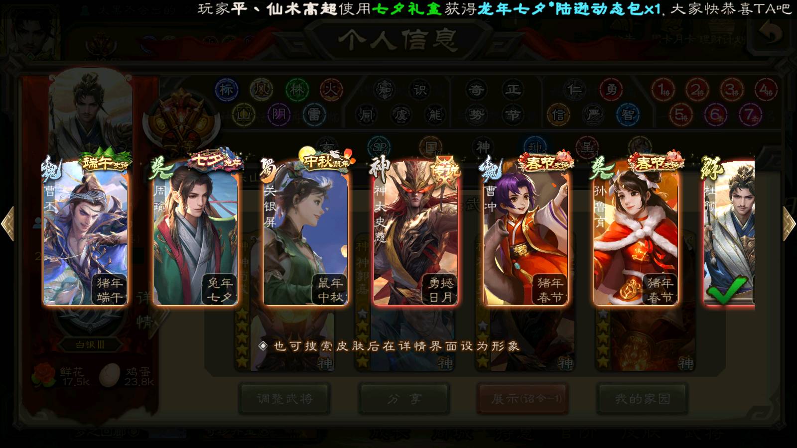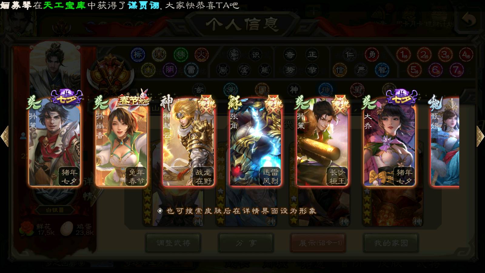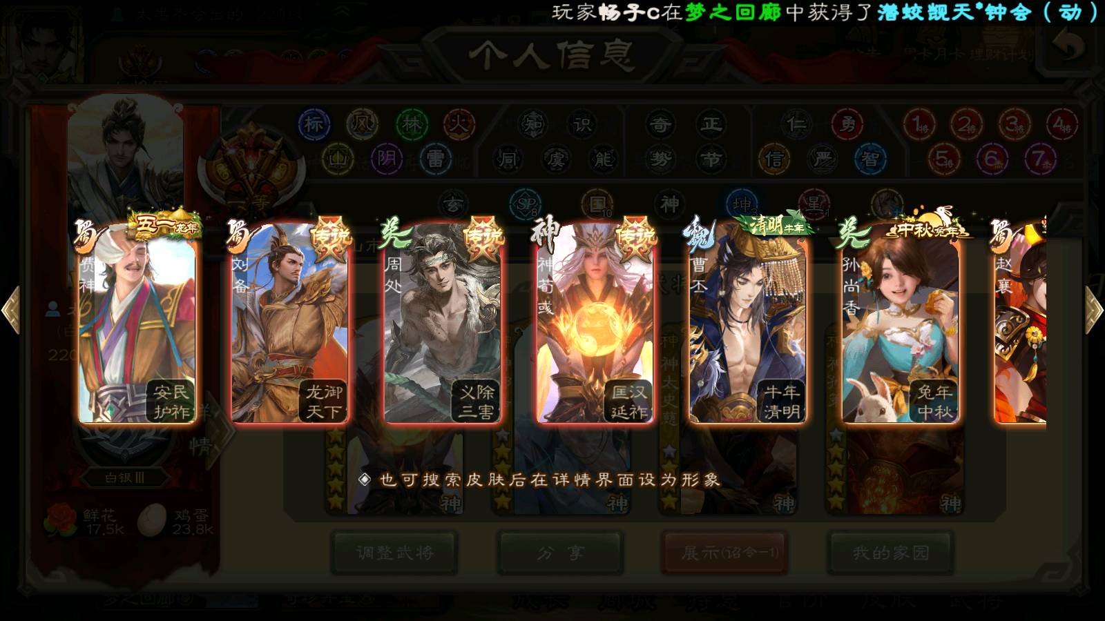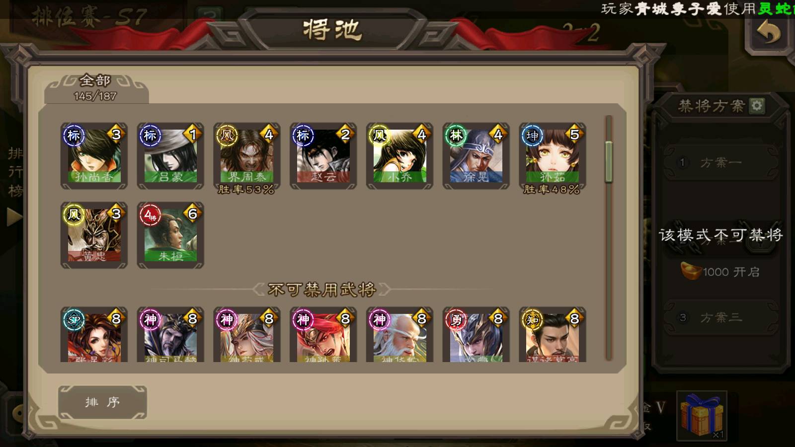 (群雄):刘焉,杜预,祢衡,界左慈,界沮授,南华老仙,麴义,许攸,十常侍,星董卓,谋貂蝉,司马昭,张让,界李儒,苏飞,庞德公,星甘宁,张琪瑛,裴秀,卑弥呼,士燮,谋张角,王允,公孙康,陶谦,审配,星黄忠,司马徽,左慈,沮授,兀突骨