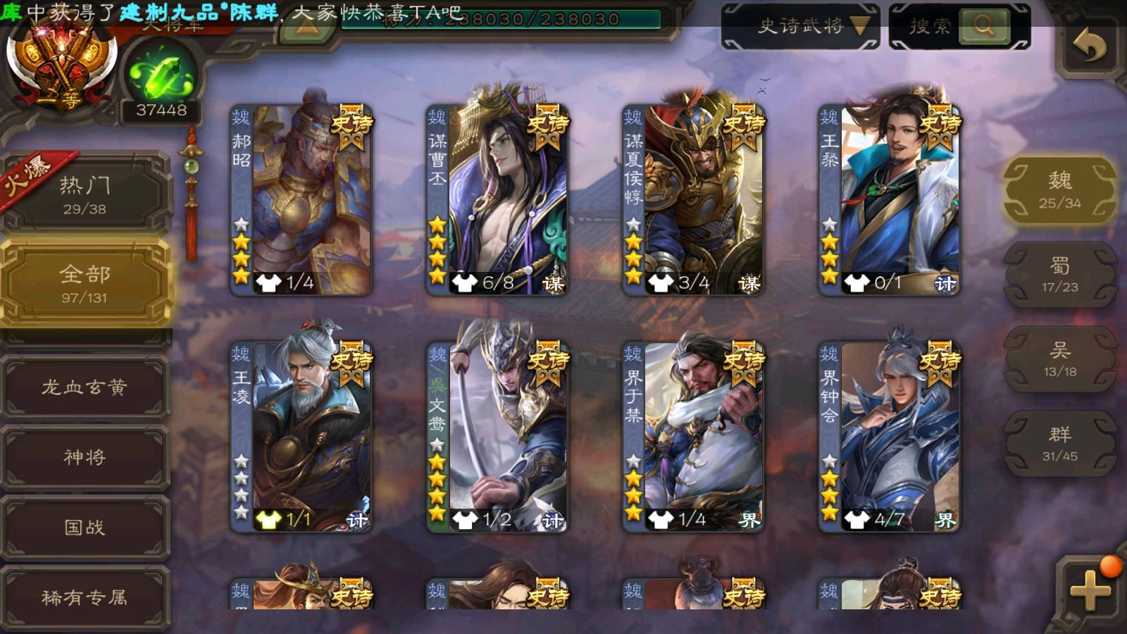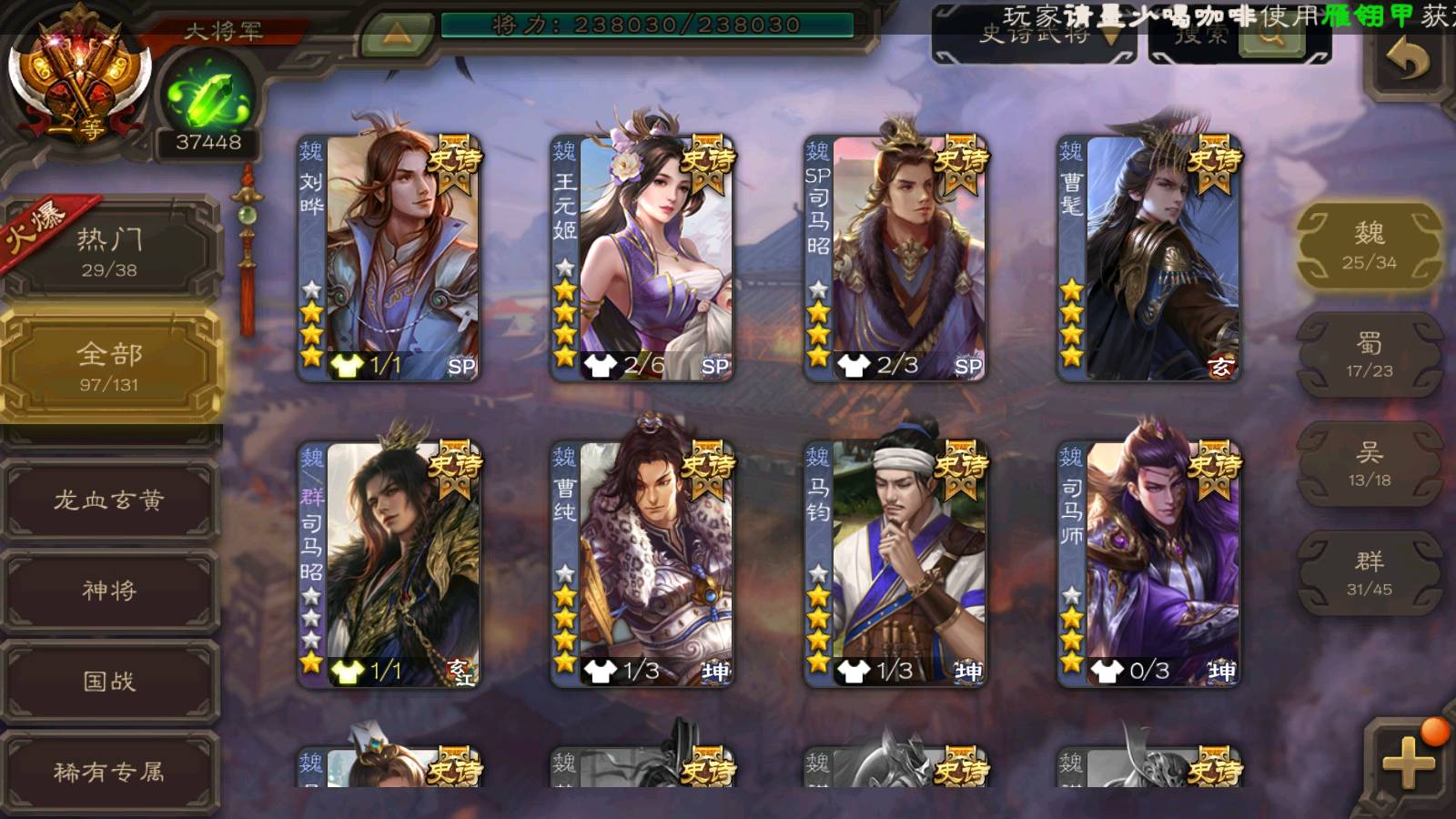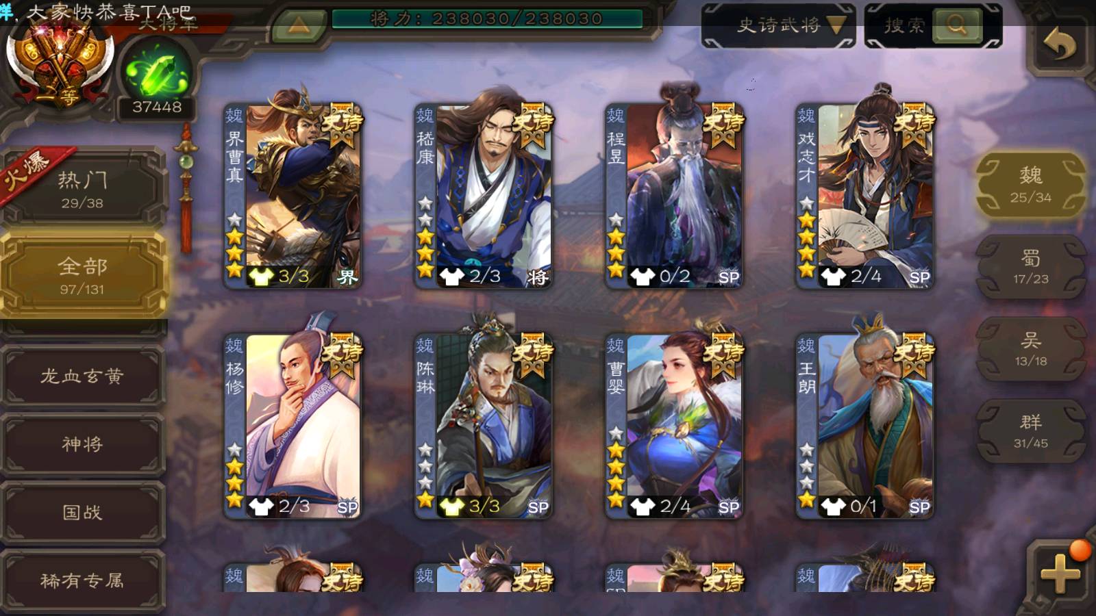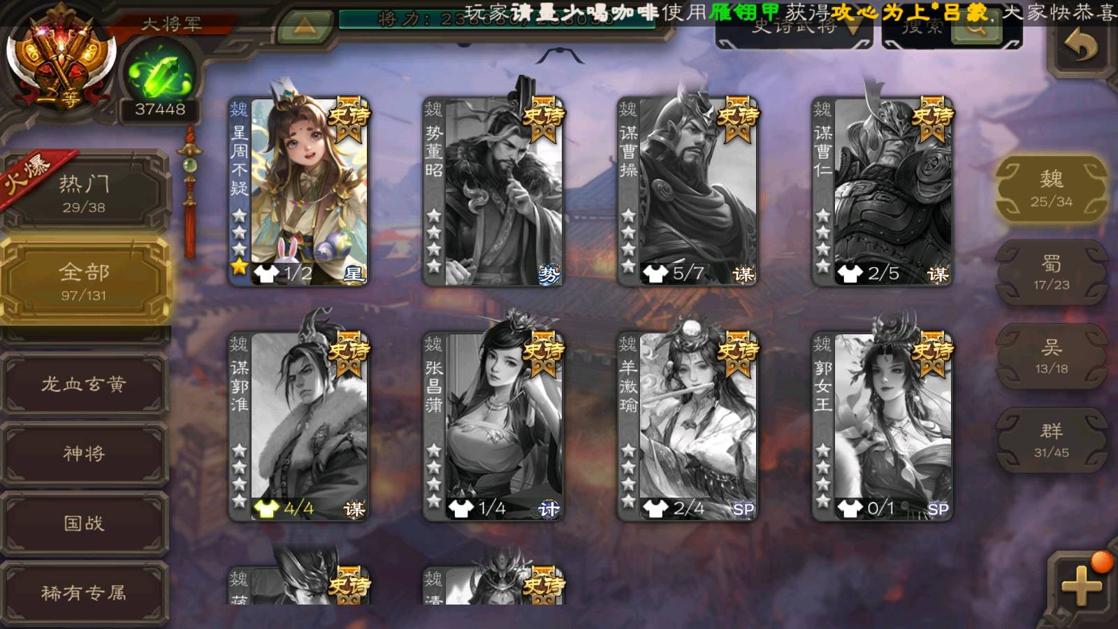 (魏国):曹婴,马钧,王元姬,文鸯,戏志才,界钟会,曹髦,SP司马昭,司马师,王朗,谋曹丕,界于禁,谋夏侯惇,郝昭,王粲,界曹真,王凌,星周不疑,程昱,曹纯,杨修,陈琳,嵇康,刘晔