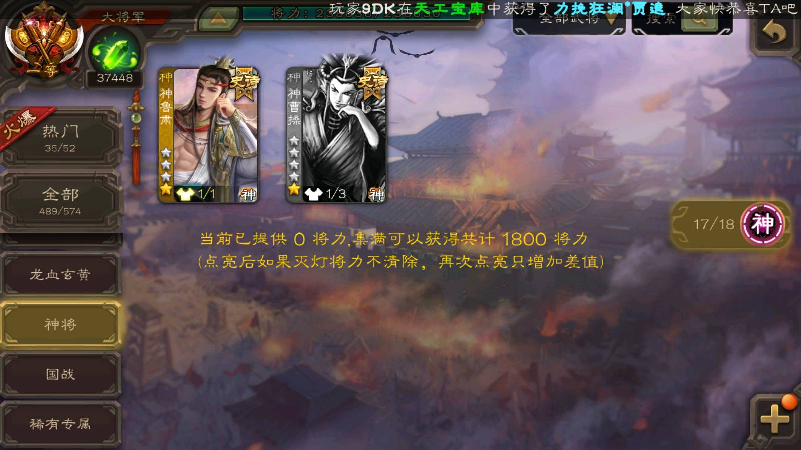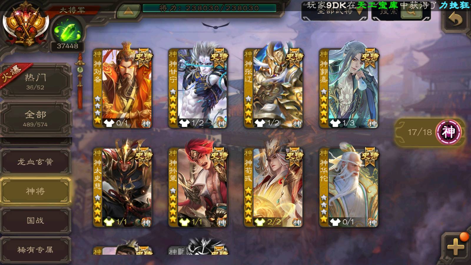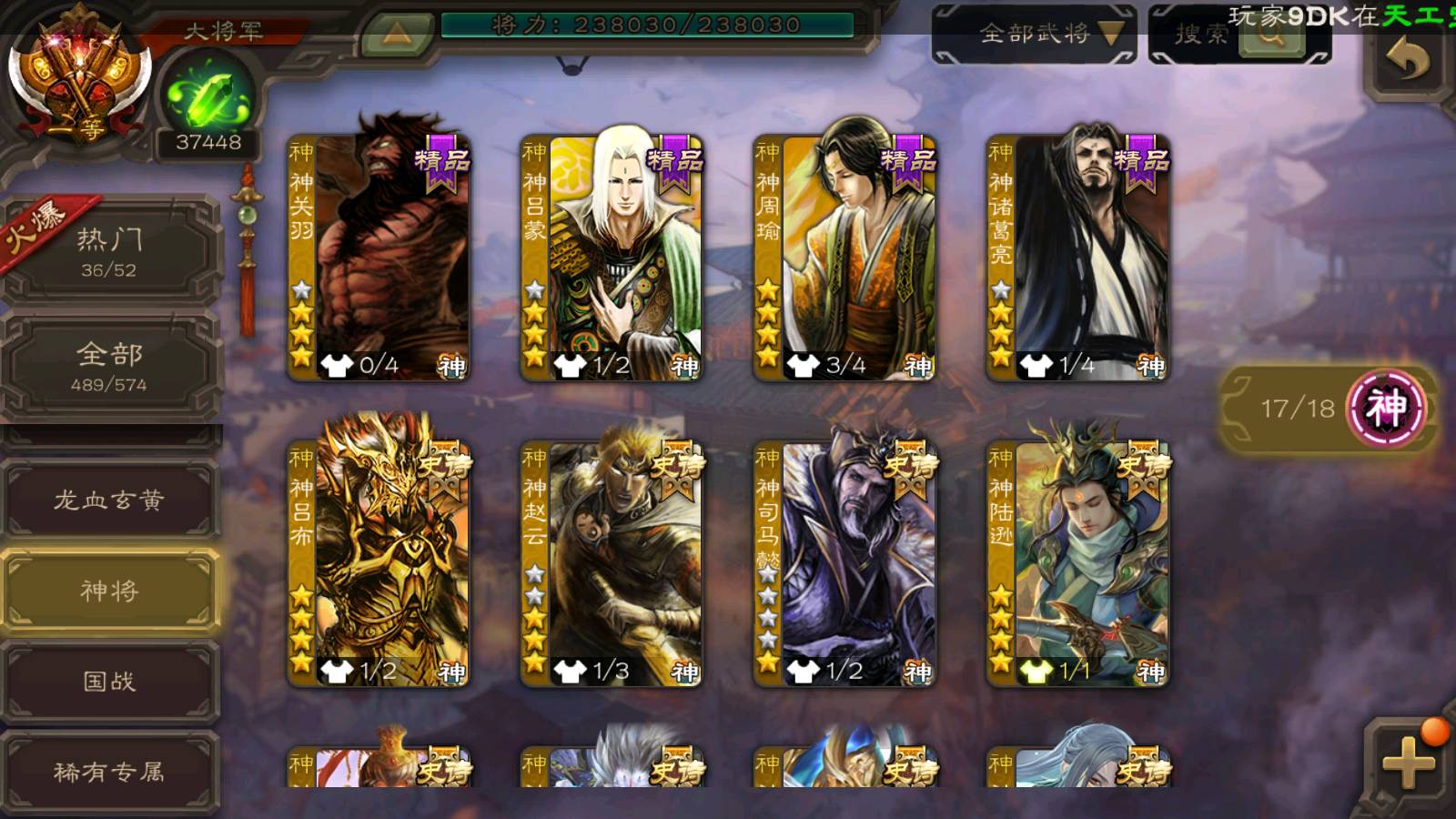 (神将):神荀彧,神郭嘉,神甘宁,神孙策,神鲁肃,神华佗,神司马懿,神太史慈,神陆逊,神赵云,神吕布,神刘备,神张辽
