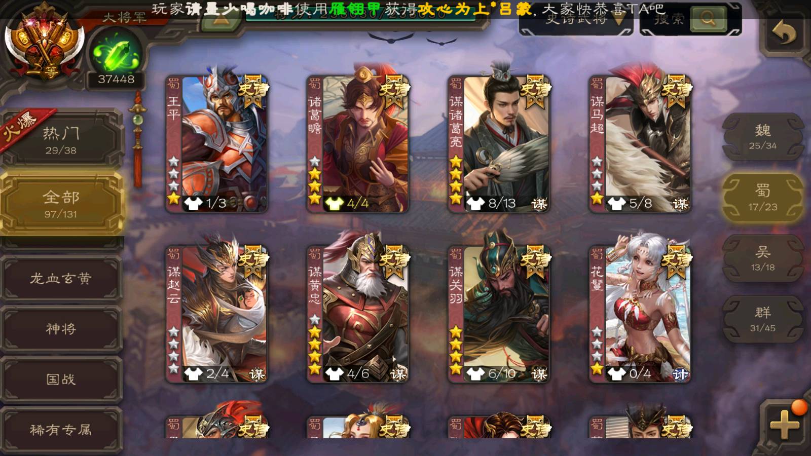 (蜀国):界黄忠,周群,谋黄忠,谋诸葛亮,谋关羽,诸葛瞻,谋赵云,花鬘,沙摩柯,谯周,谋马超,关索,张星彩,王平,马云騄,董允,赵襄