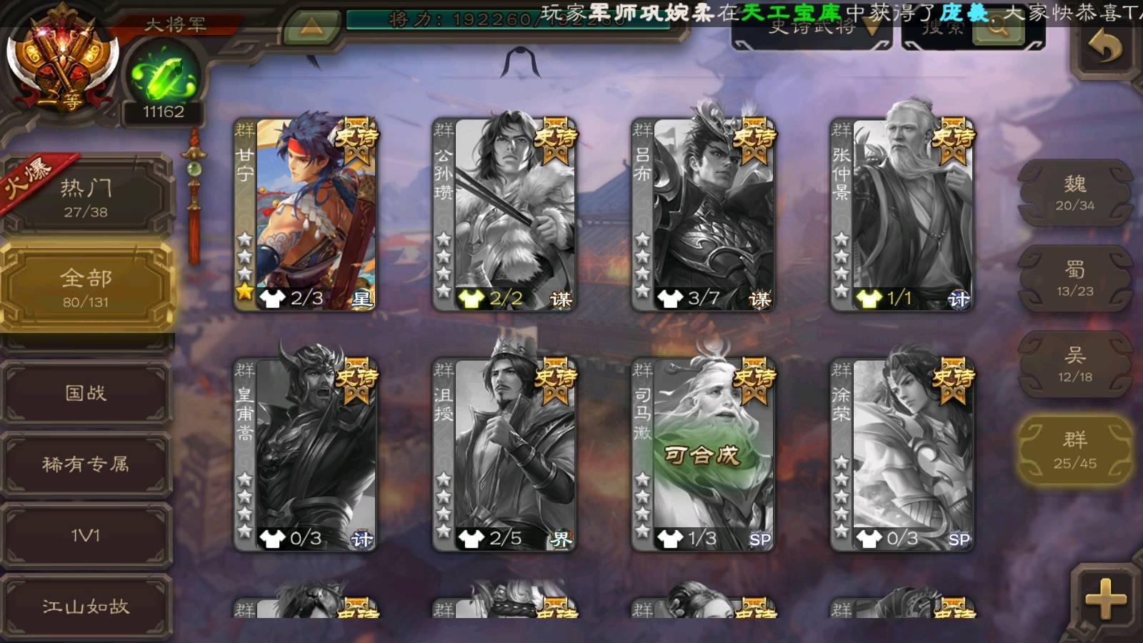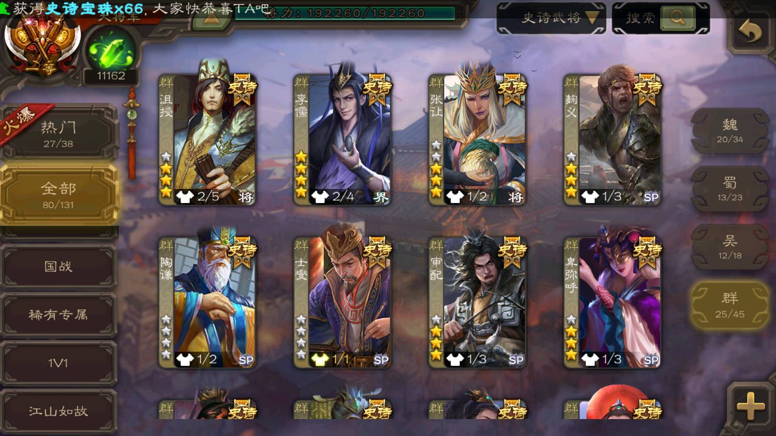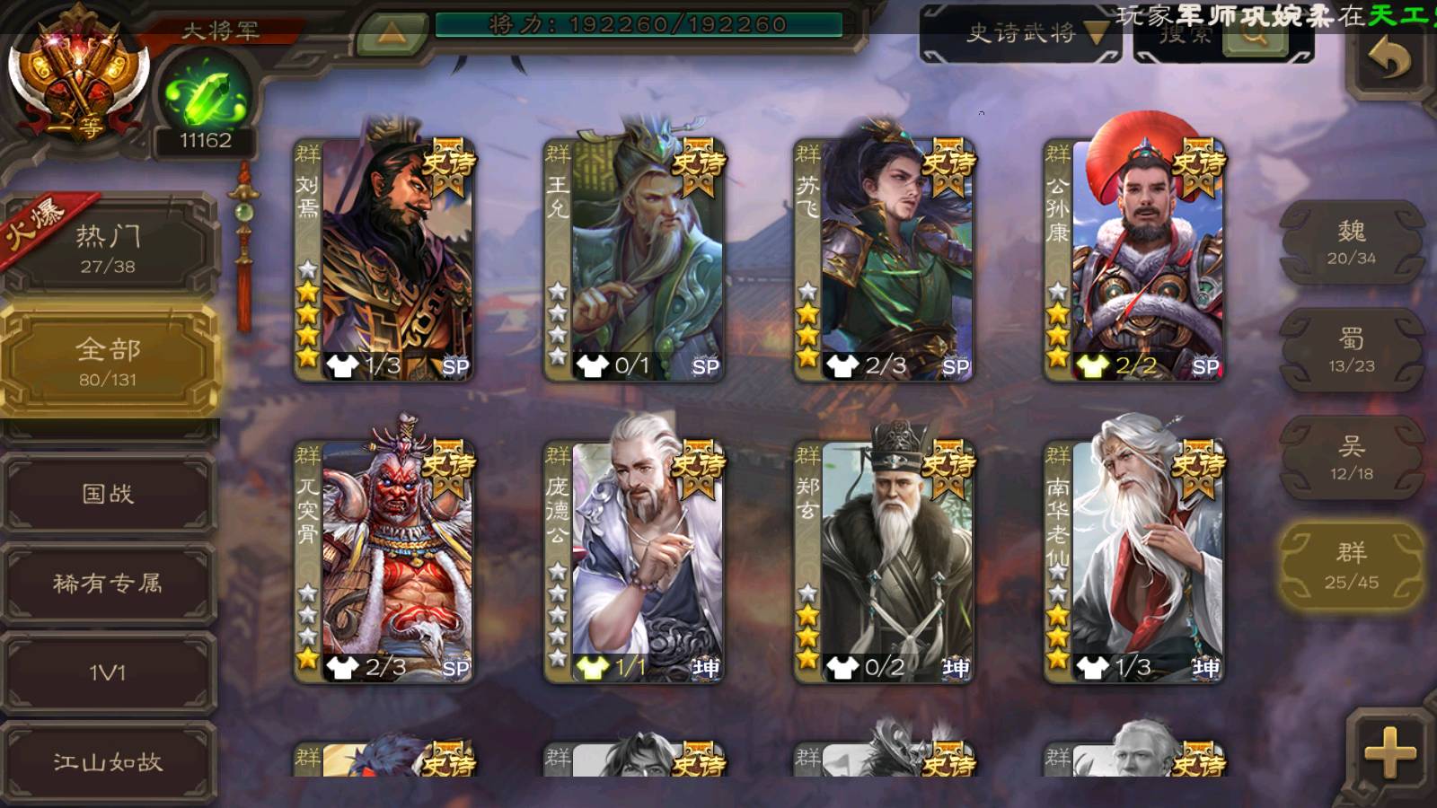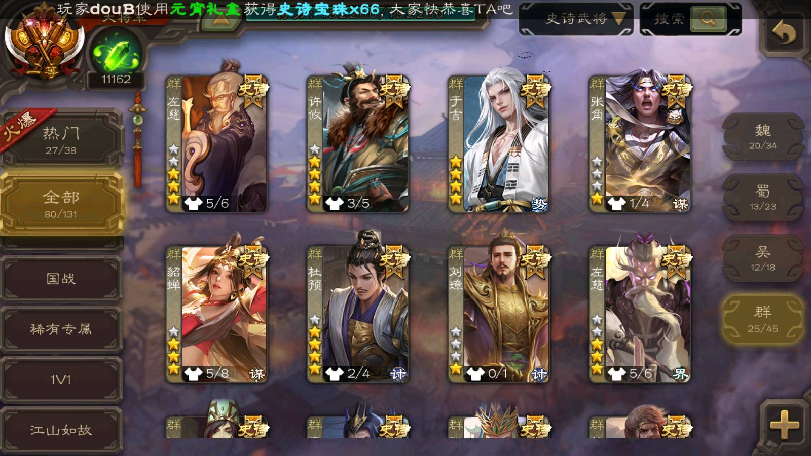 (群雄):刘焉,杜预,界左慈,南华老仙,麴义,许攸,谋貂蝉,张让,界李儒,苏飞,庞德公,星甘宁,势于吉,卑弥呼,士燮,谋张角,王允,公孙康,刘璋,郑玄,陶谦,审配,左慈,沮授,兀突骨