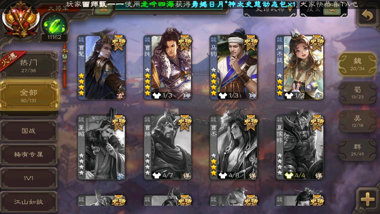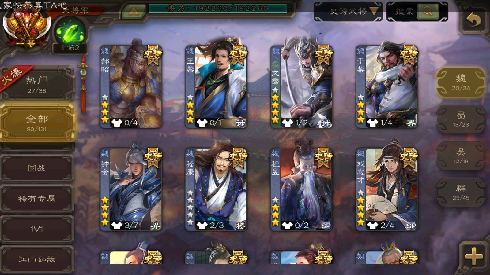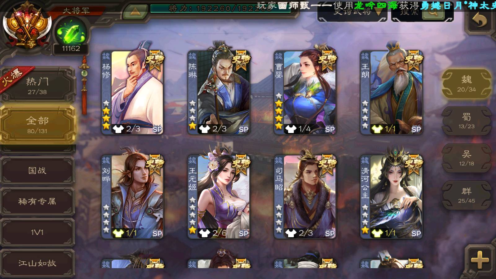 (魏国):曹婴,马钧,王元姬,文鸯,戏志才,界钟会,曹髦,SP司马昭,王朗,清河公主,界于禁,郝昭,王粲,星周不疑,程昱,曹纯,杨修,陈琳,嵇康,刘晔