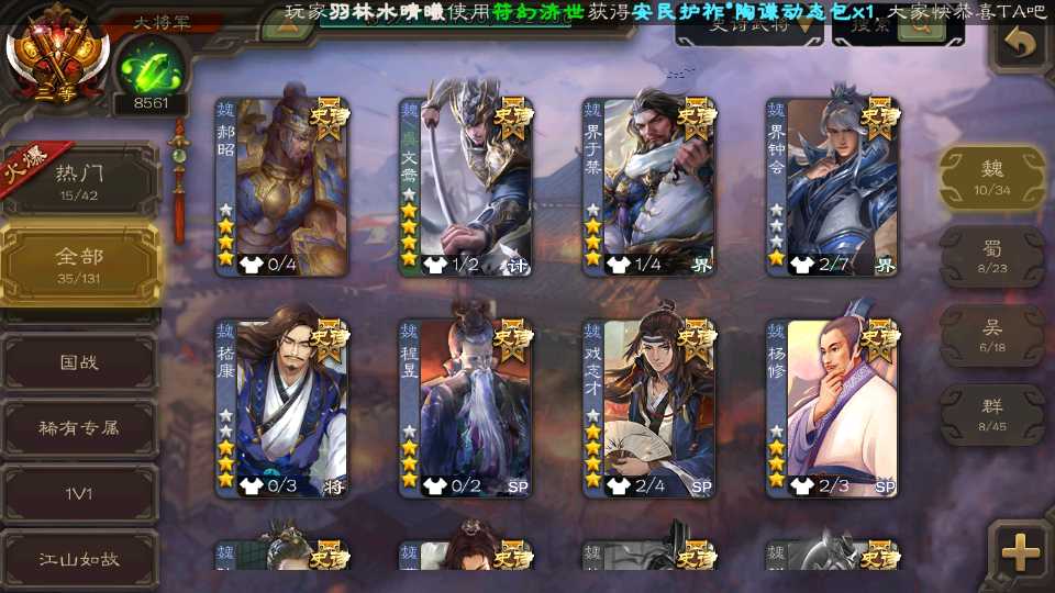 (魏国):文鸯,戏志才,界钟会,界于禁,郝昭,程昱,曹纯,杨修,陈琳,嵇康