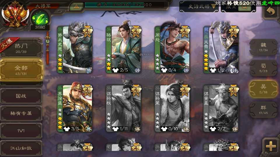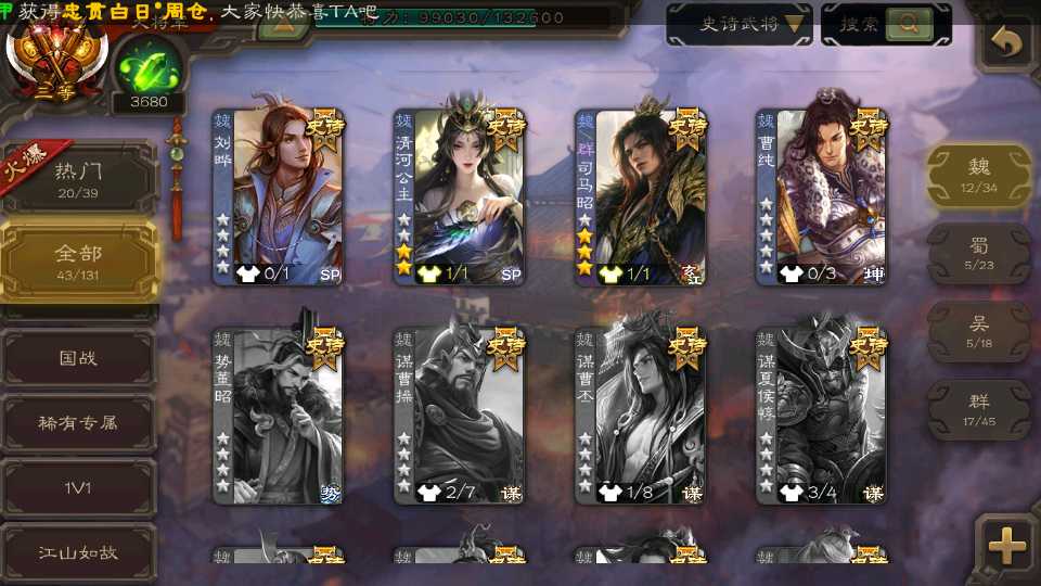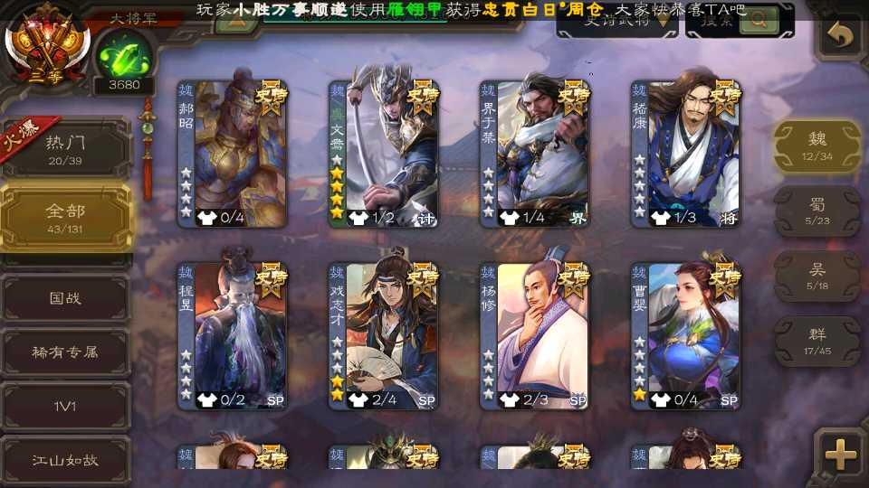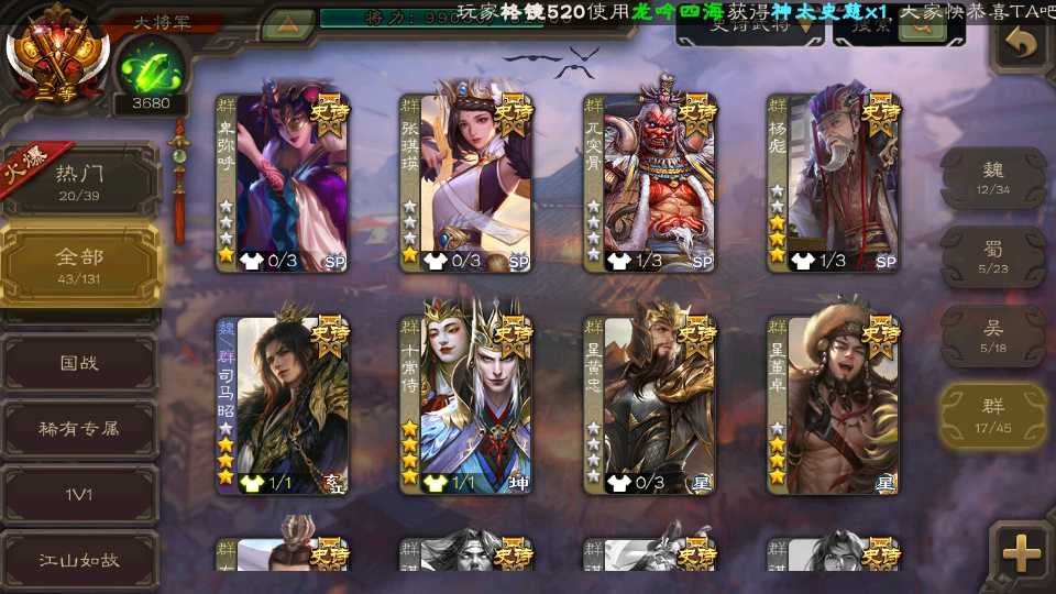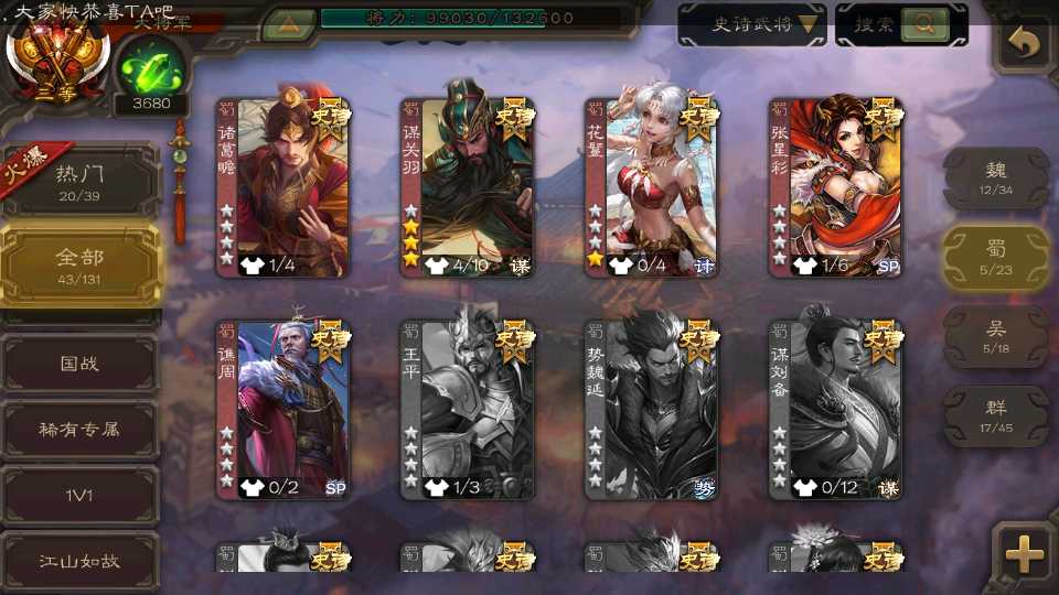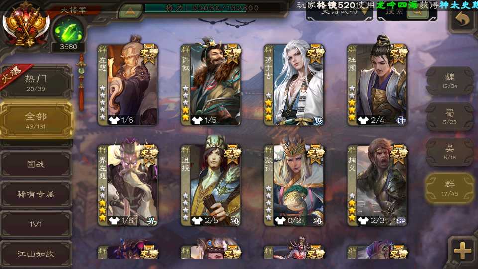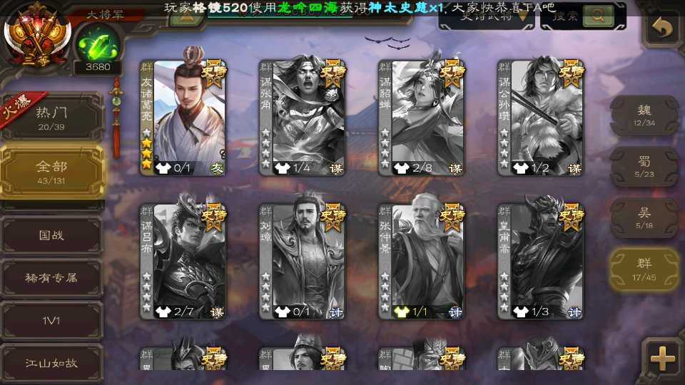 (群雄):杨彪,杜预,友诸葛亮,界左慈,麴义,许攸,十常侍,星董卓,司马昭,张让,势于吉,张琪瑛,卑弥呼,星黄忠,左慈,沮授,兀突骨