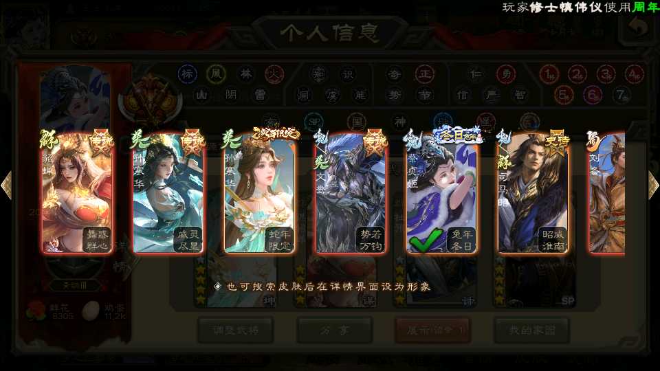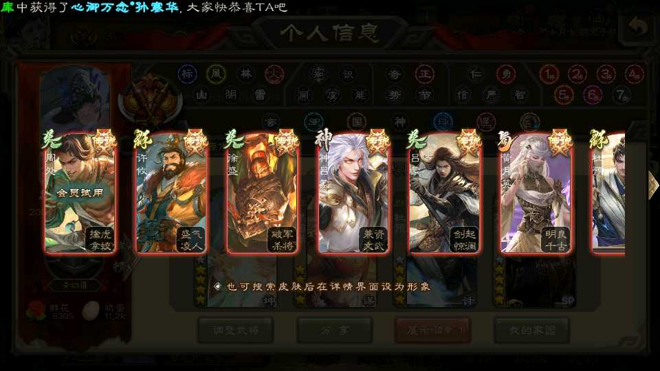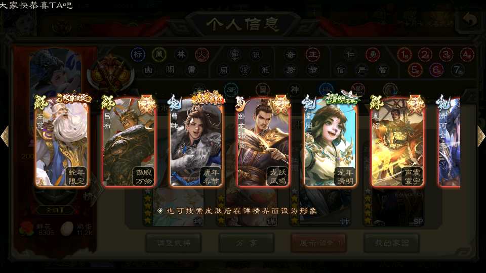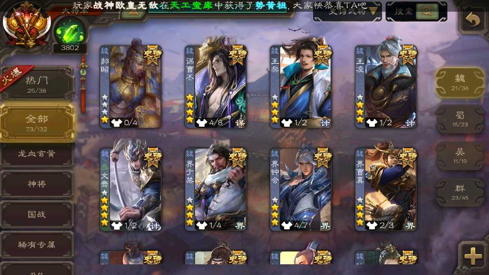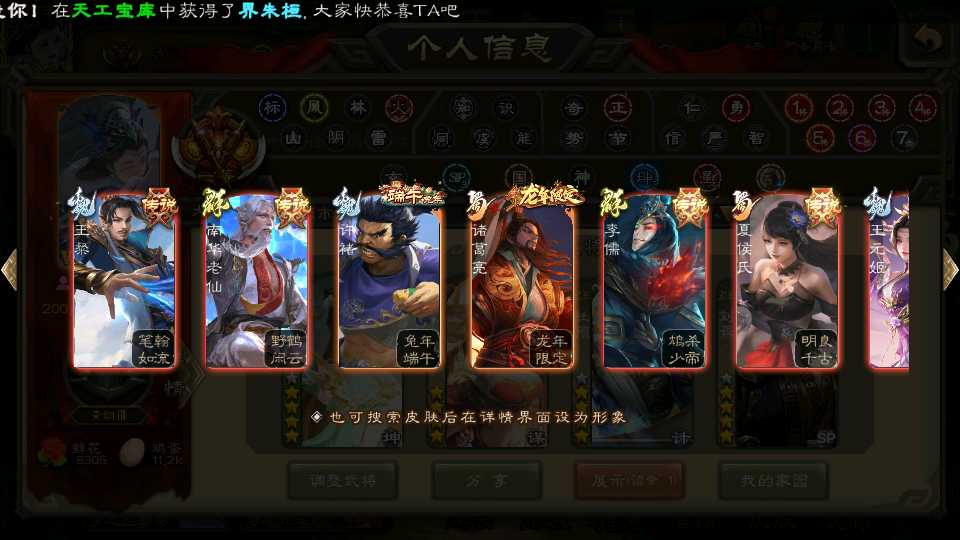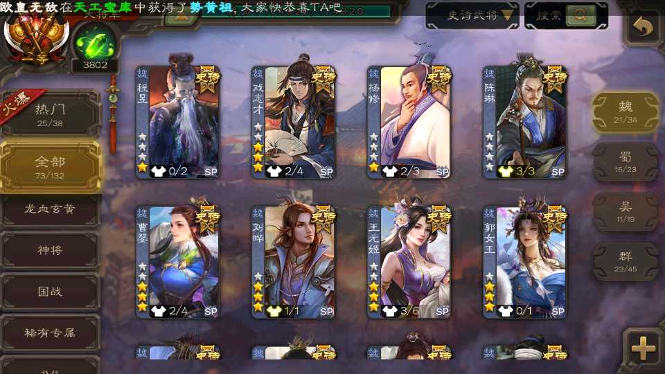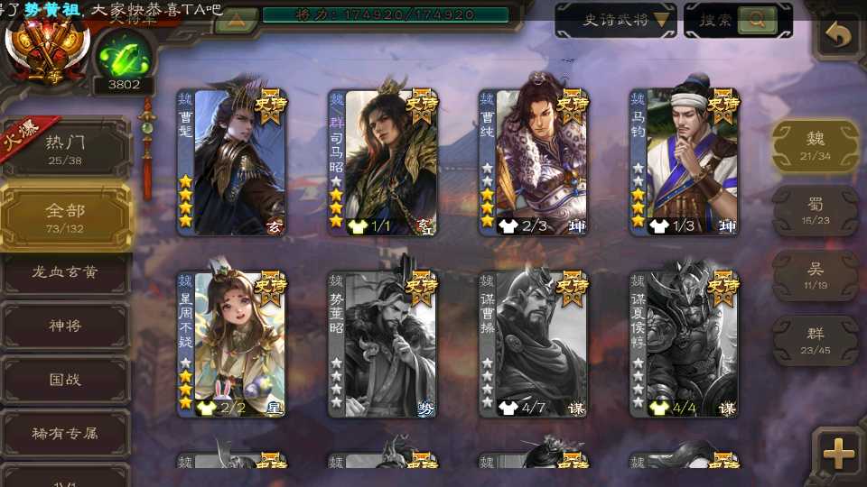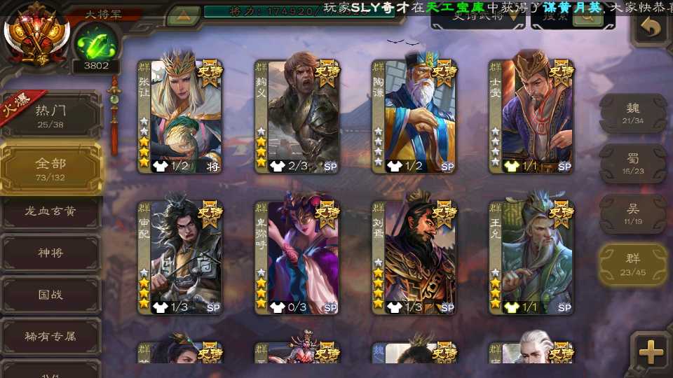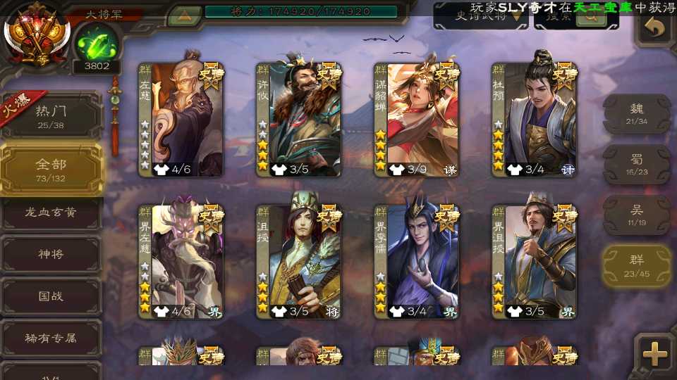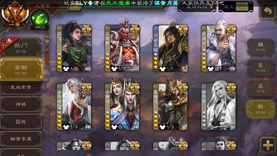 (群雄):刘焉,杜预,界左慈,界沮授,南华老仙,麴义,许攸,十常侍,谋貂蝉,司马昭,张让,界李儒,苏飞,庞德公,卑弥呼,士燮,王允,陶谦,审配,星黄忠,左慈,沮授,兀突骨