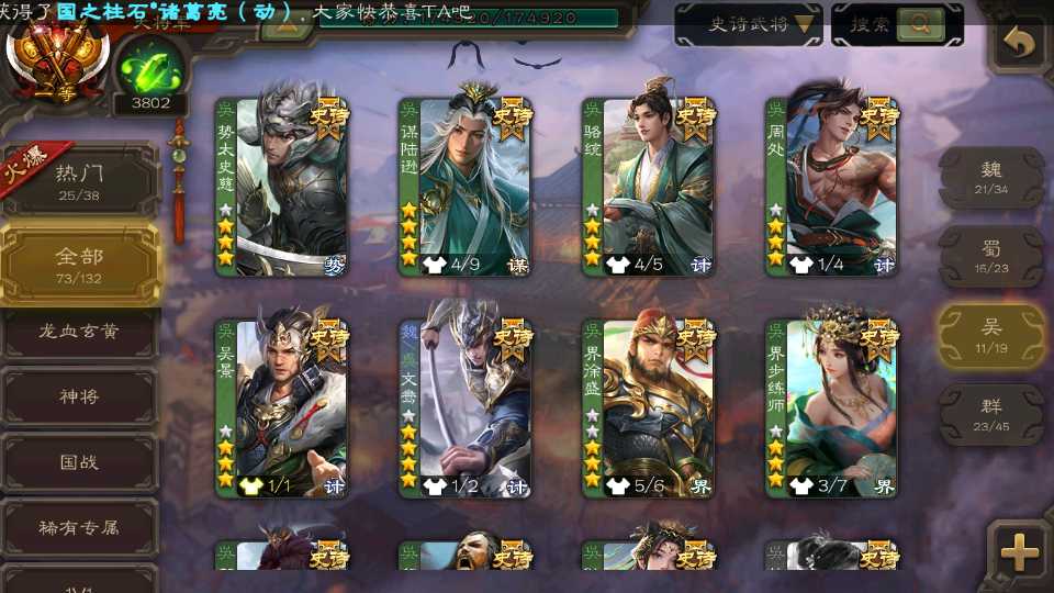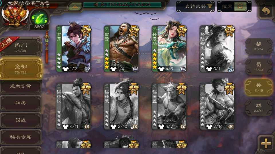 (吴国):界徐盛,留赞,孙寒华,势太史慈,周处,骆统,谋陆逊,界步练师,吴景,贺齐