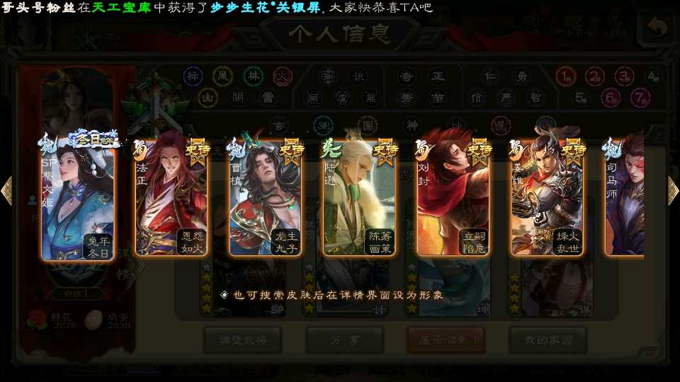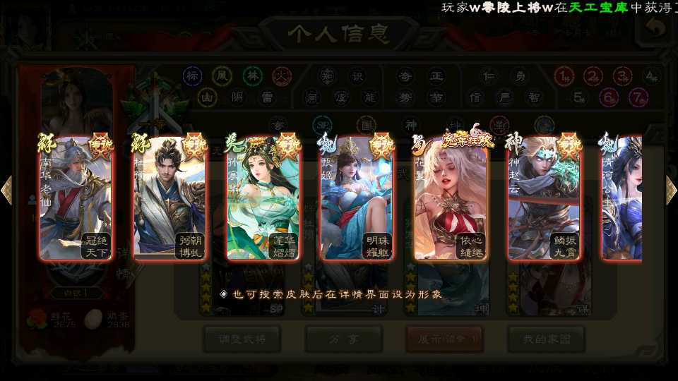 商品编号22254 全部皮肤355,动态皮肤25,全部武将329,排位武将97,国战武将89,史诗武将38,杜预新回廊,孙寒华双回廊,神赵云回廊,杨彪动皮,谋关羽动皮,雁翎7.9w,将魂7.7k,元宝1w