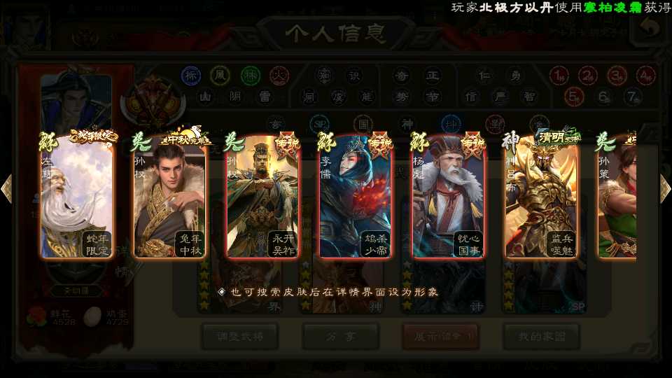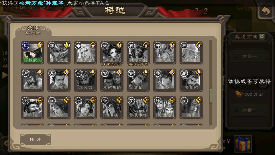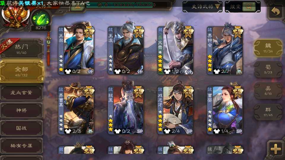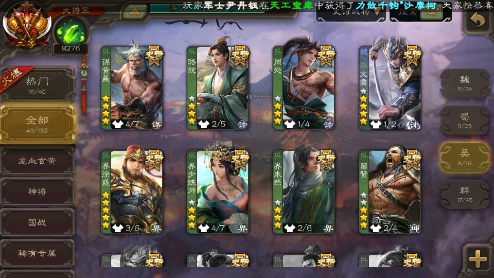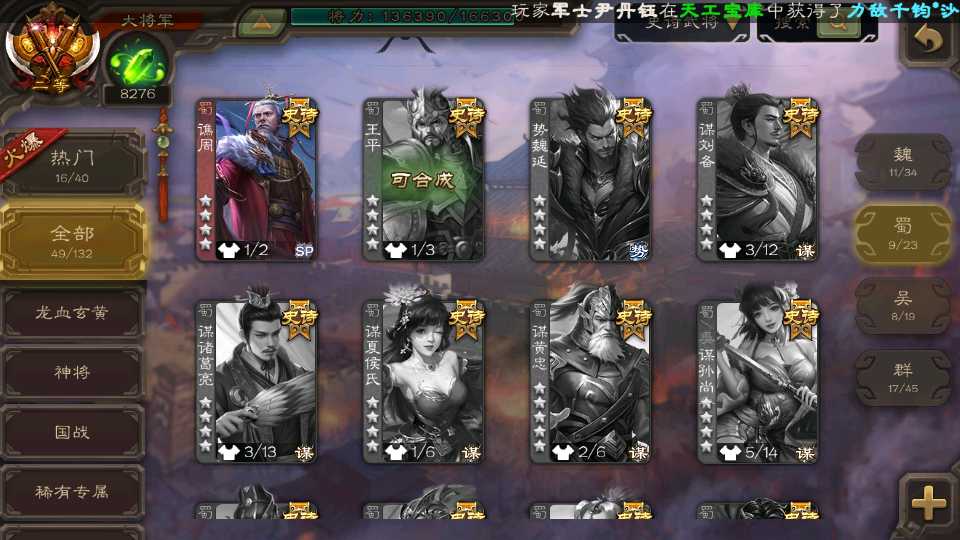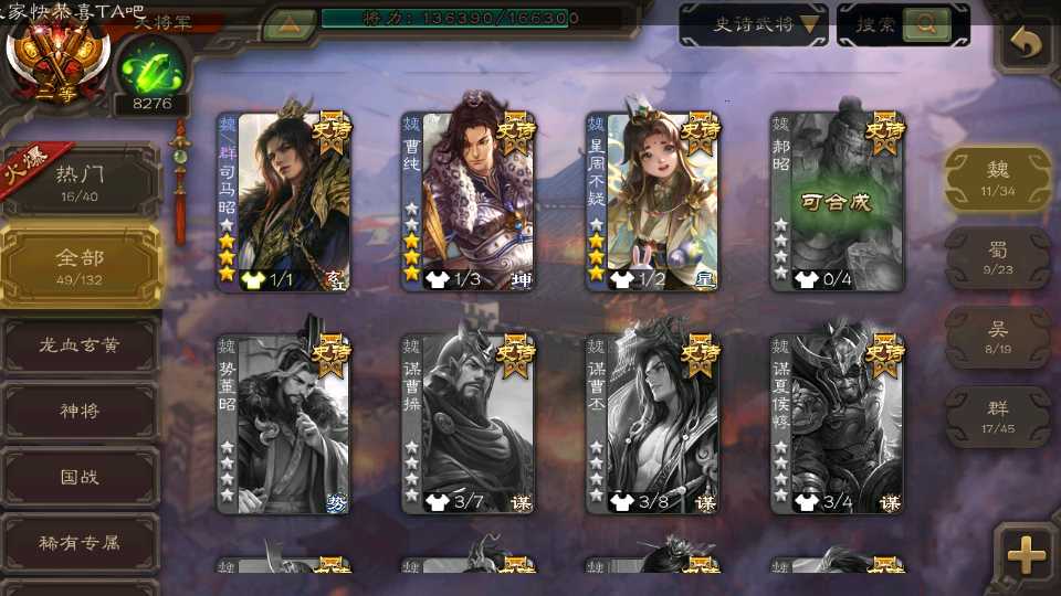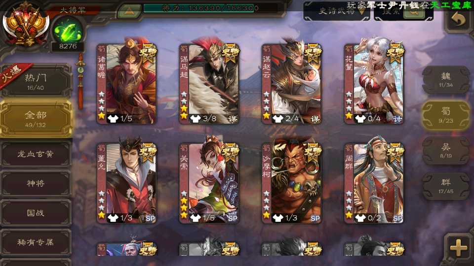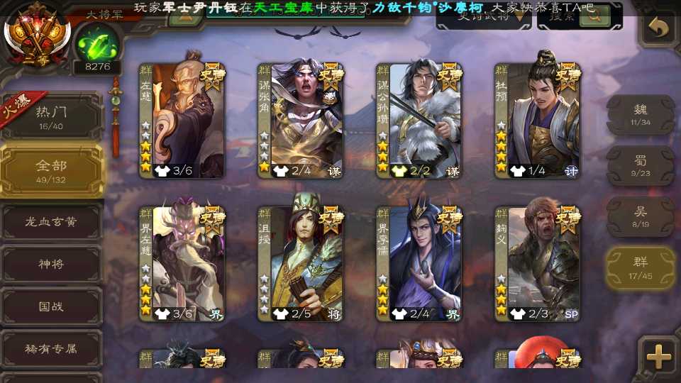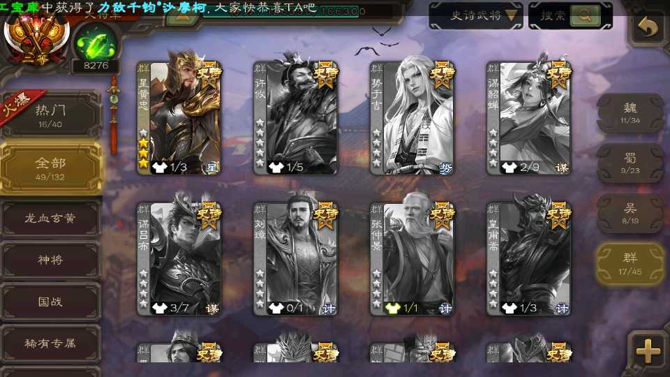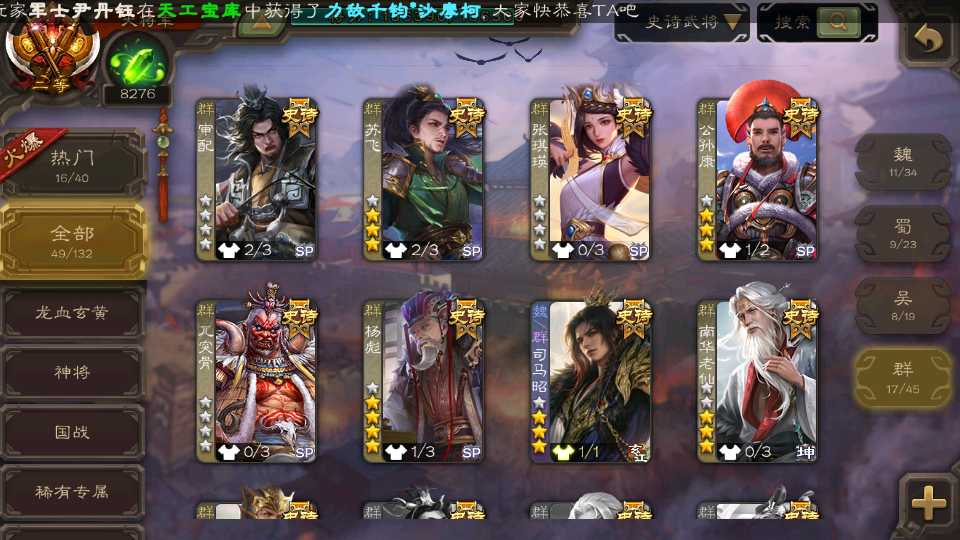 (群雄):杨彪,杜预,界左慈,南华老仙,麴义,司马昭,界李儒,苏飞,谋公孙瓒,张琪瑛,谋张角,公孙康,审配,星黄忠,左慈,沮授,兀突骨