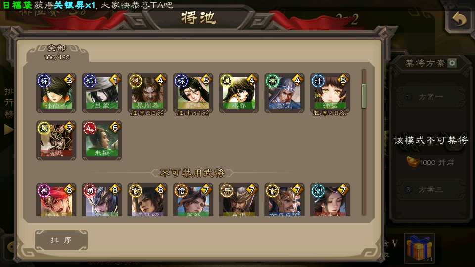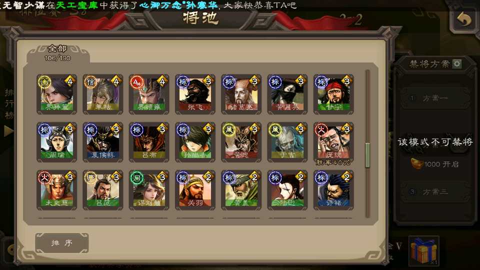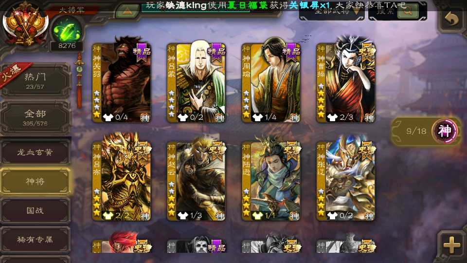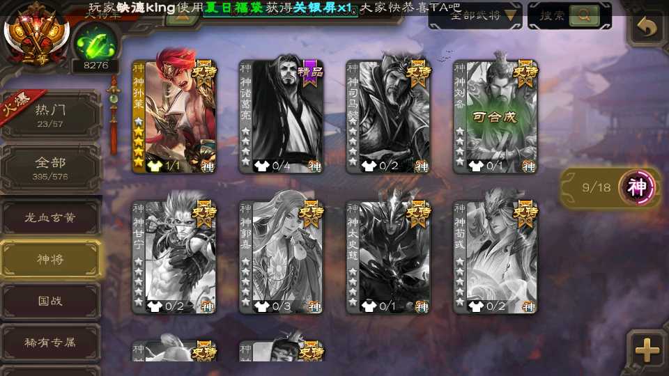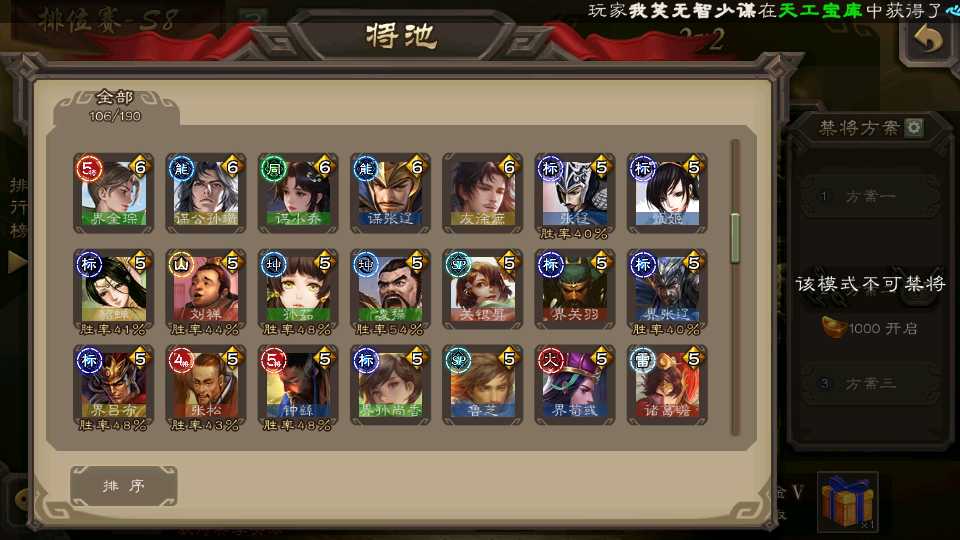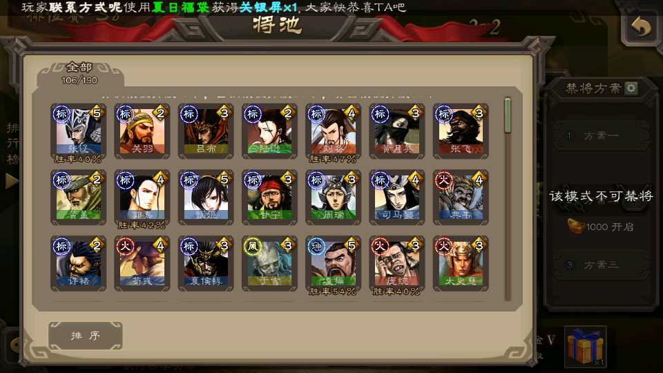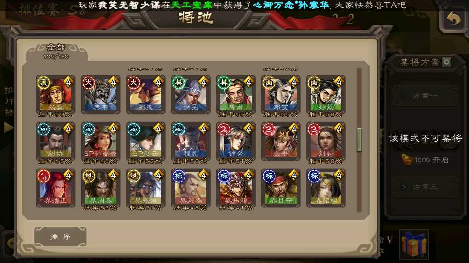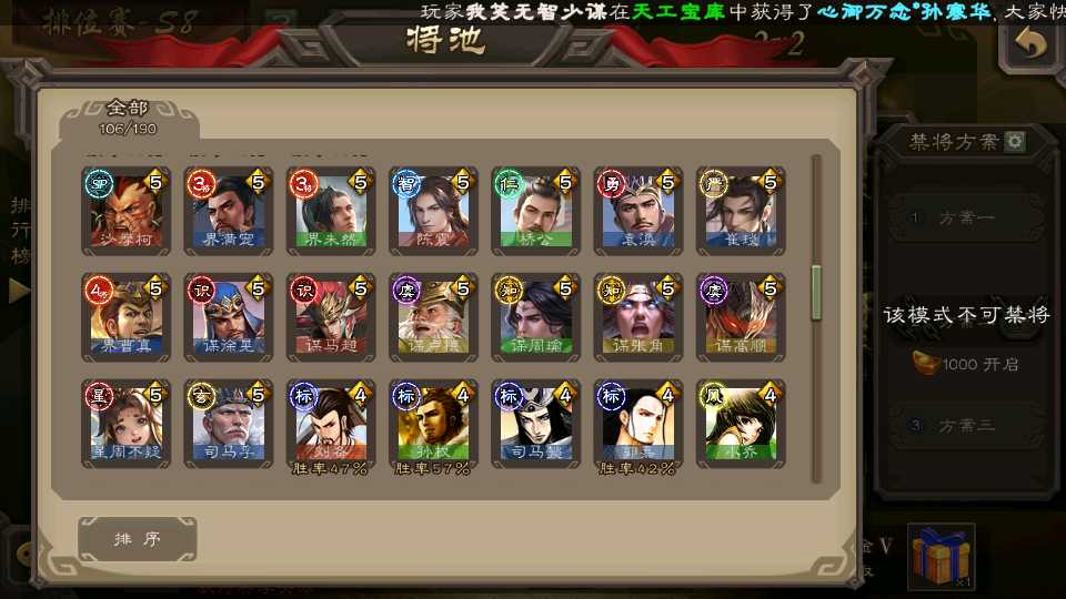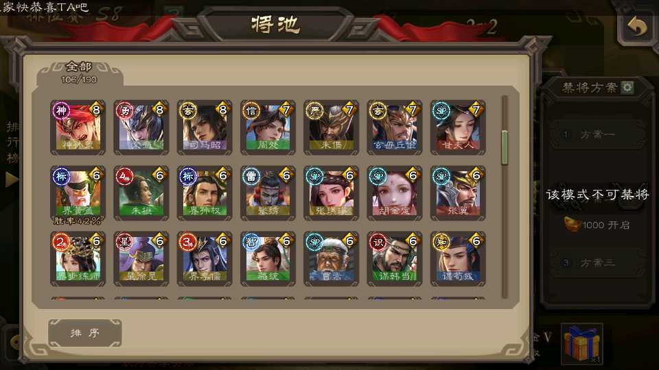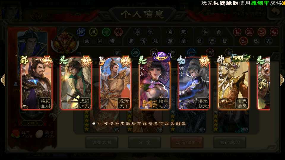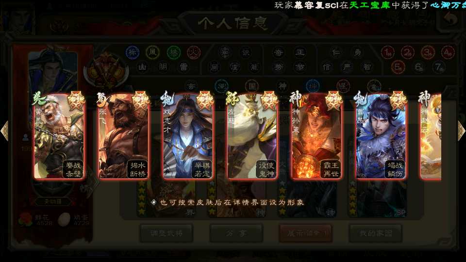 (群雄):杨彪,杜预,界左慈,南华老仙,麴义,司马昭,界李儒,苏飞,谋公孙瓒,张琪瑛,谋张角,公孙康,审配,星黄忠,左慈,沮授,兀突骨