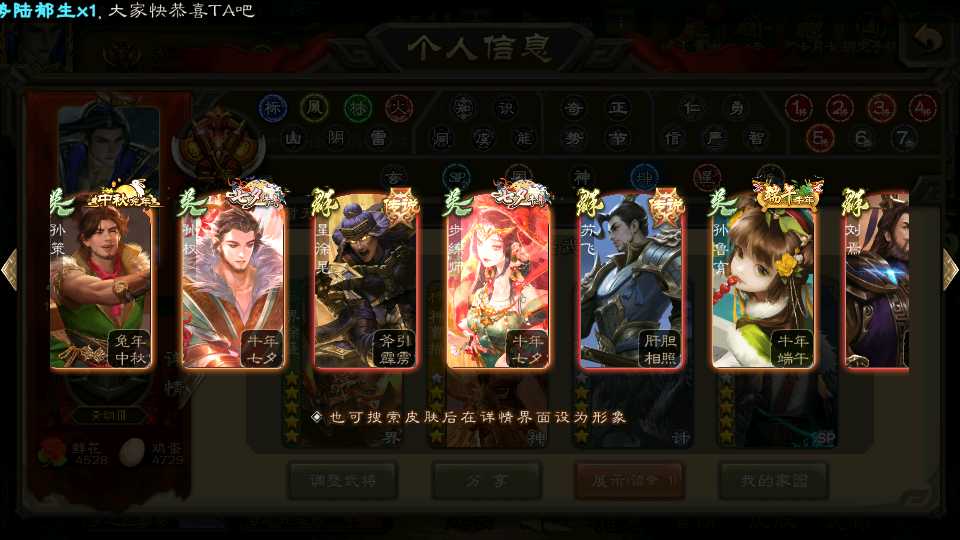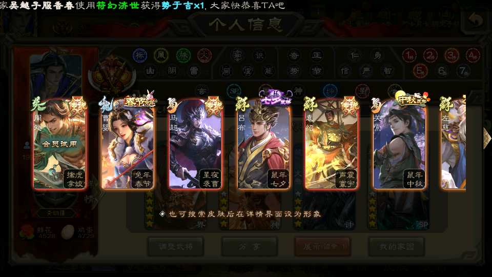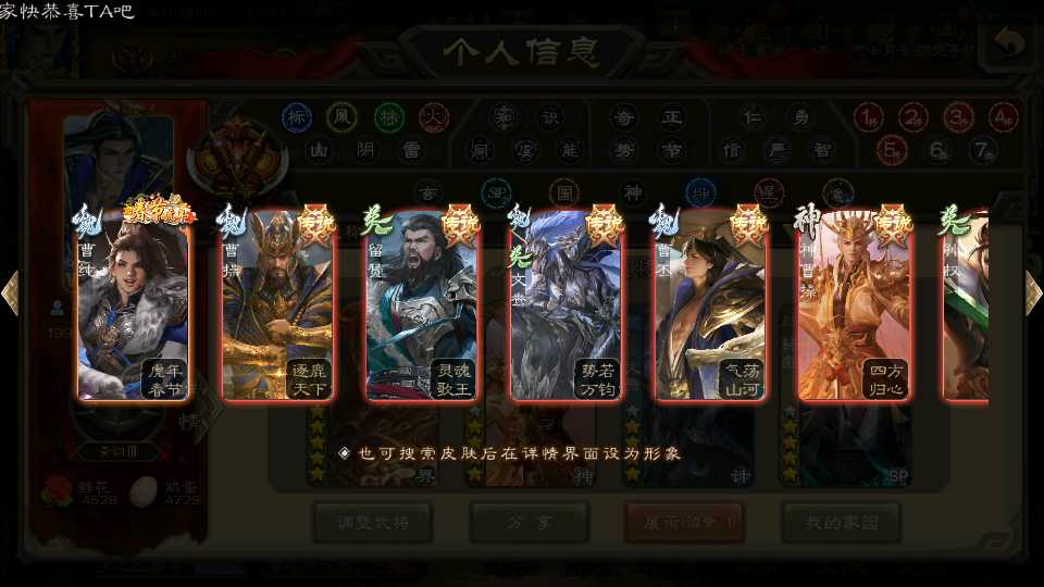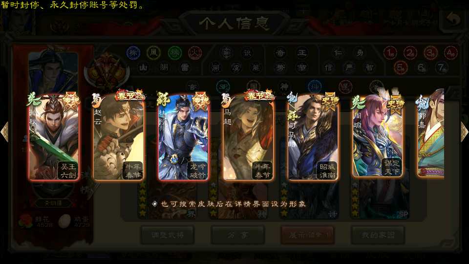 商品编号22266 全部皮肤454,动态皮肤53,全部武将395,排位武将106,国战武将91,史诗武将49,友徐庶,界钟会回廊,神曹操回廊,神孙策动皮,杨彪动皮,麴义动皮,文鸯动皮,杜预动皮,宝珠53,将魂8.2k