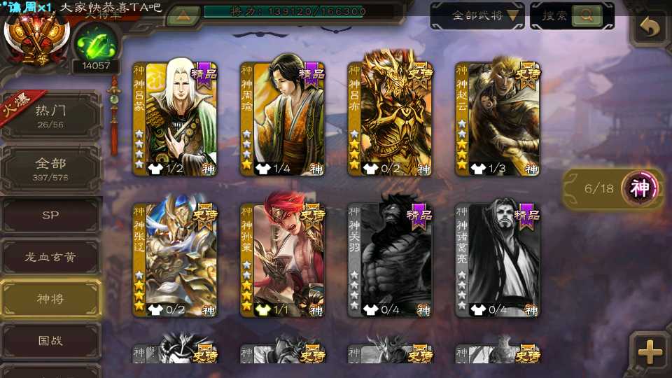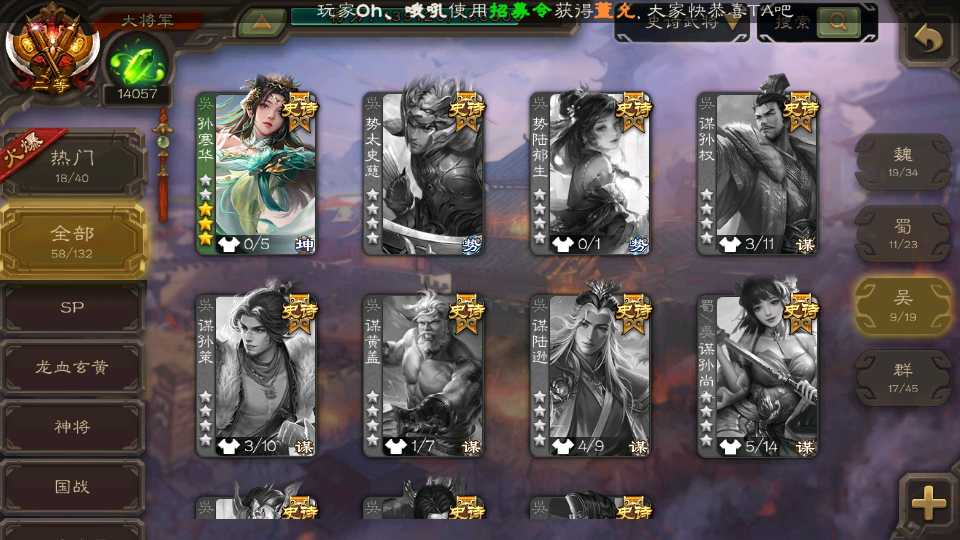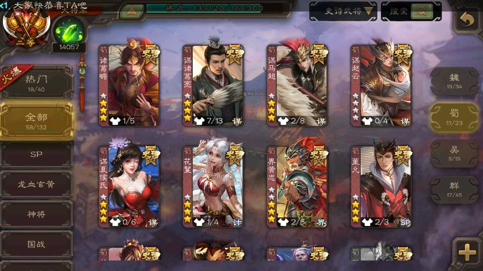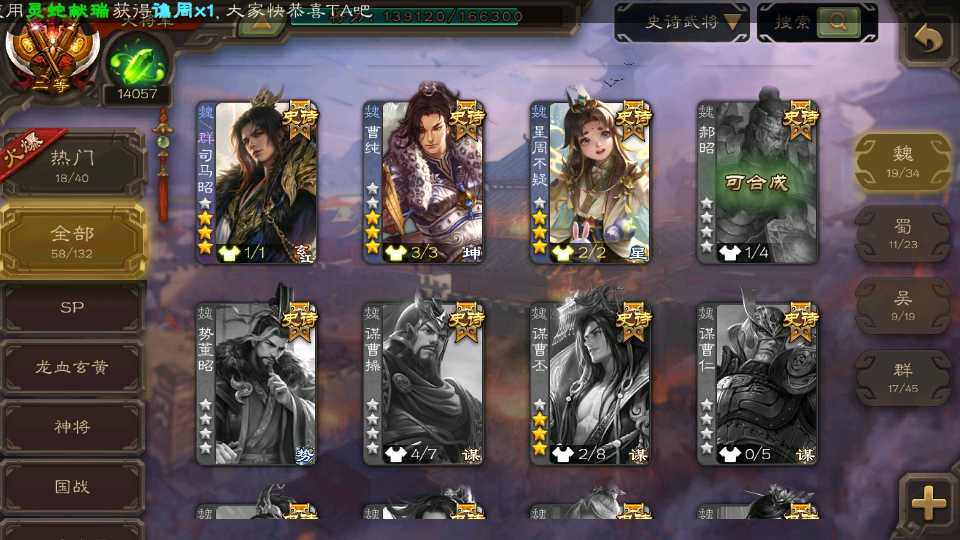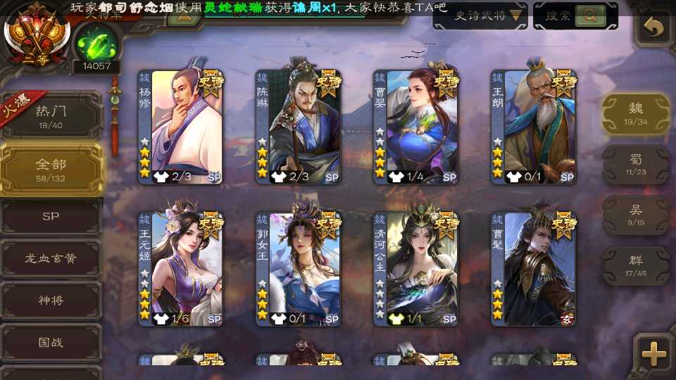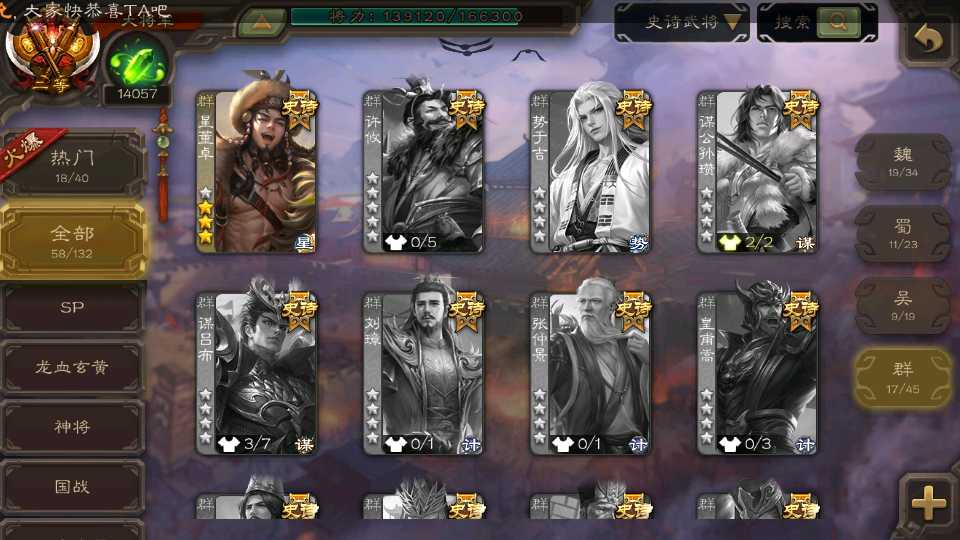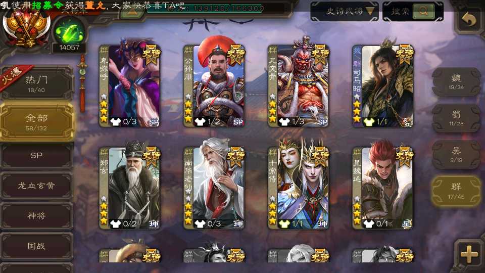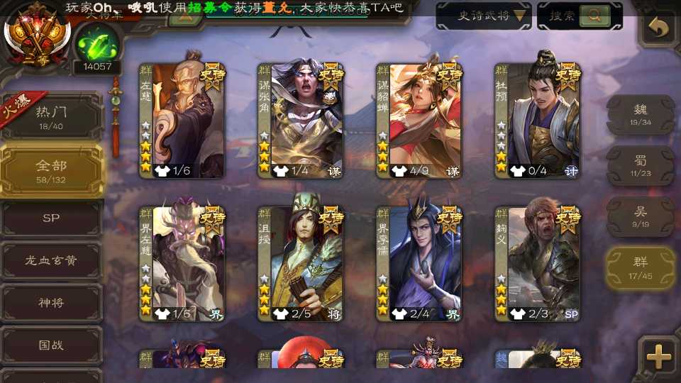 (群雄):杜预,界左慈,南华老仙,麴义,十常侍,星董卓,谋貂蝉,司马昭,界李儒,卑弥呼,星魏延,谋张角,公孙康,郑玄,左慈,沮授,兀突骨