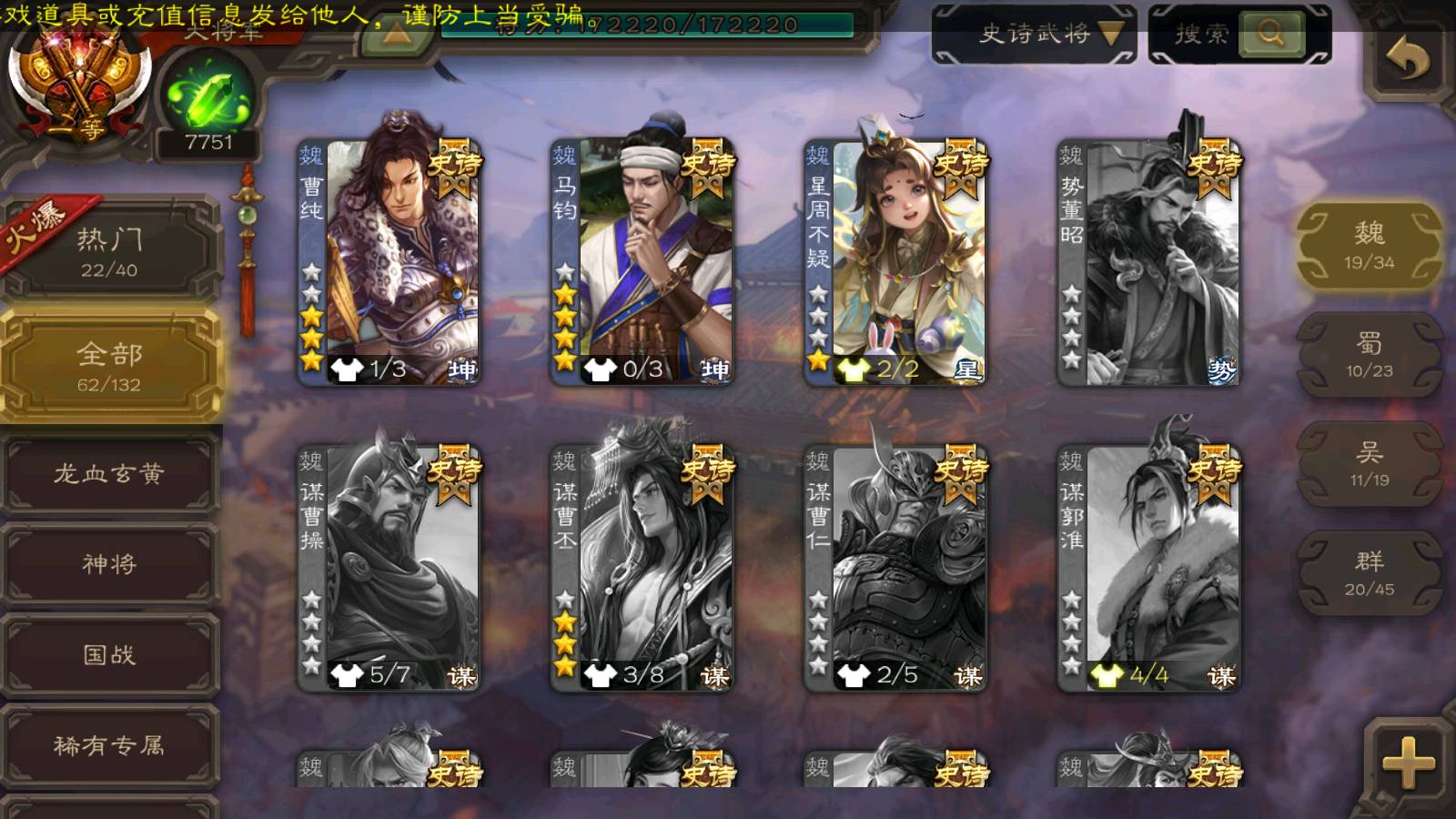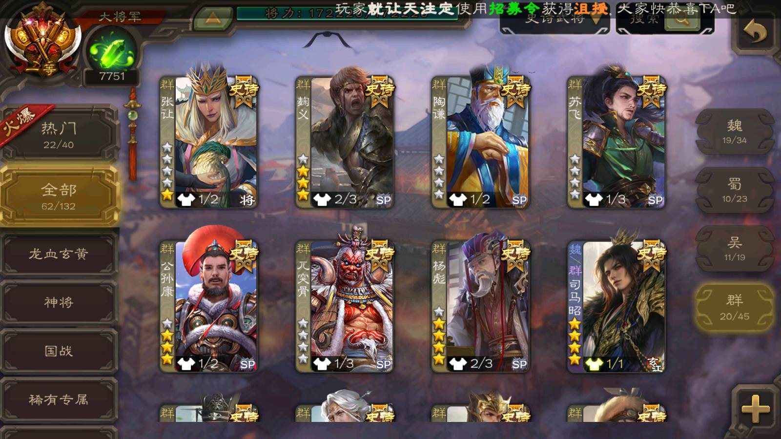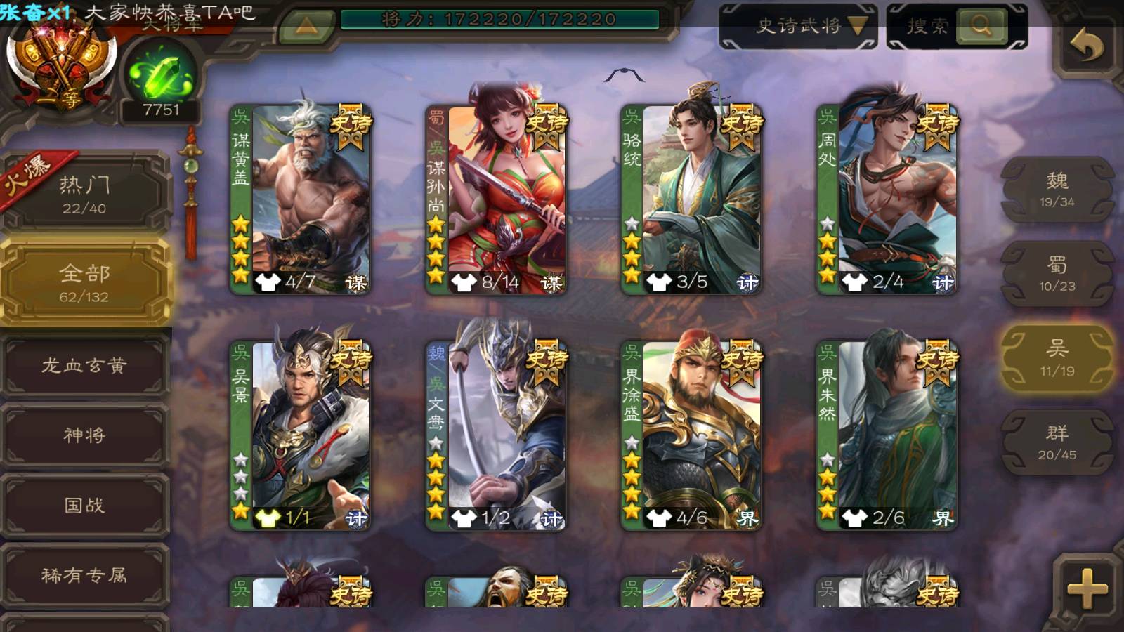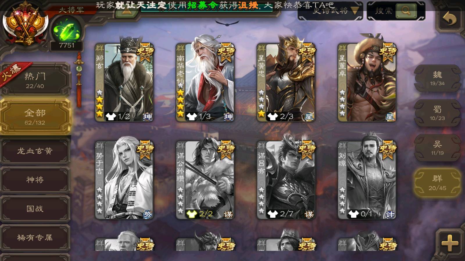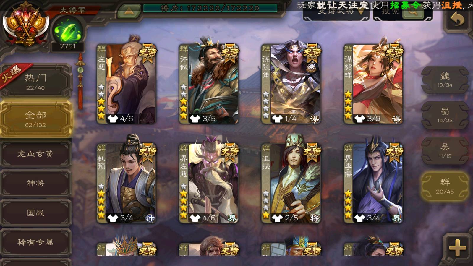 (群雄):杨彪,杜预,谋貂蝉,界左慈,张让,界李儒,苏飞,麴义,许攸,司马昭,南华老仙,谋张角,陶谦,公孙康,郑玄,星黄忠,星董卓,左慈,沮授,兀突骨