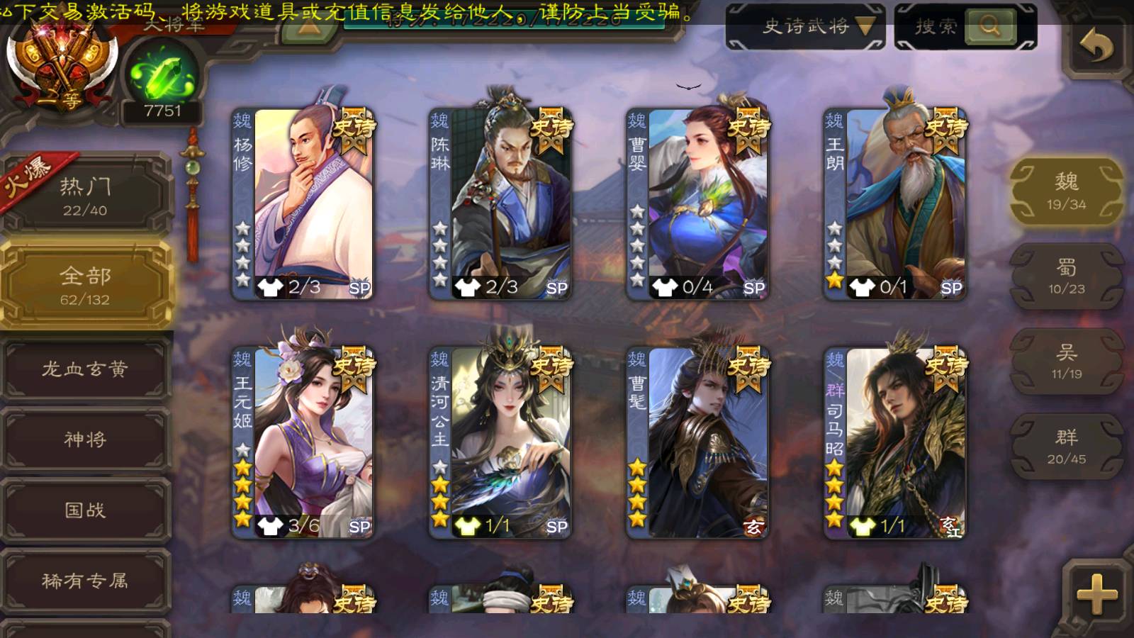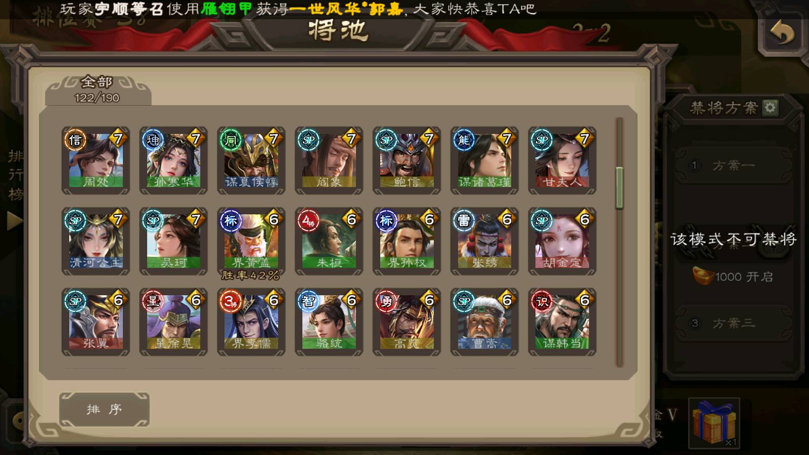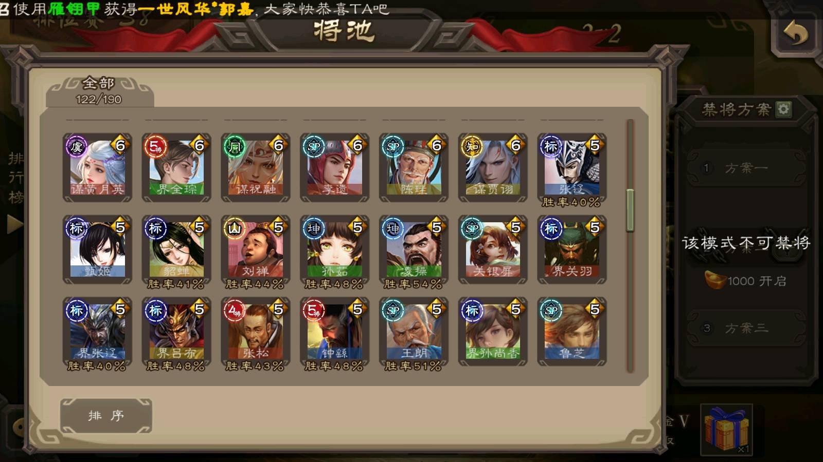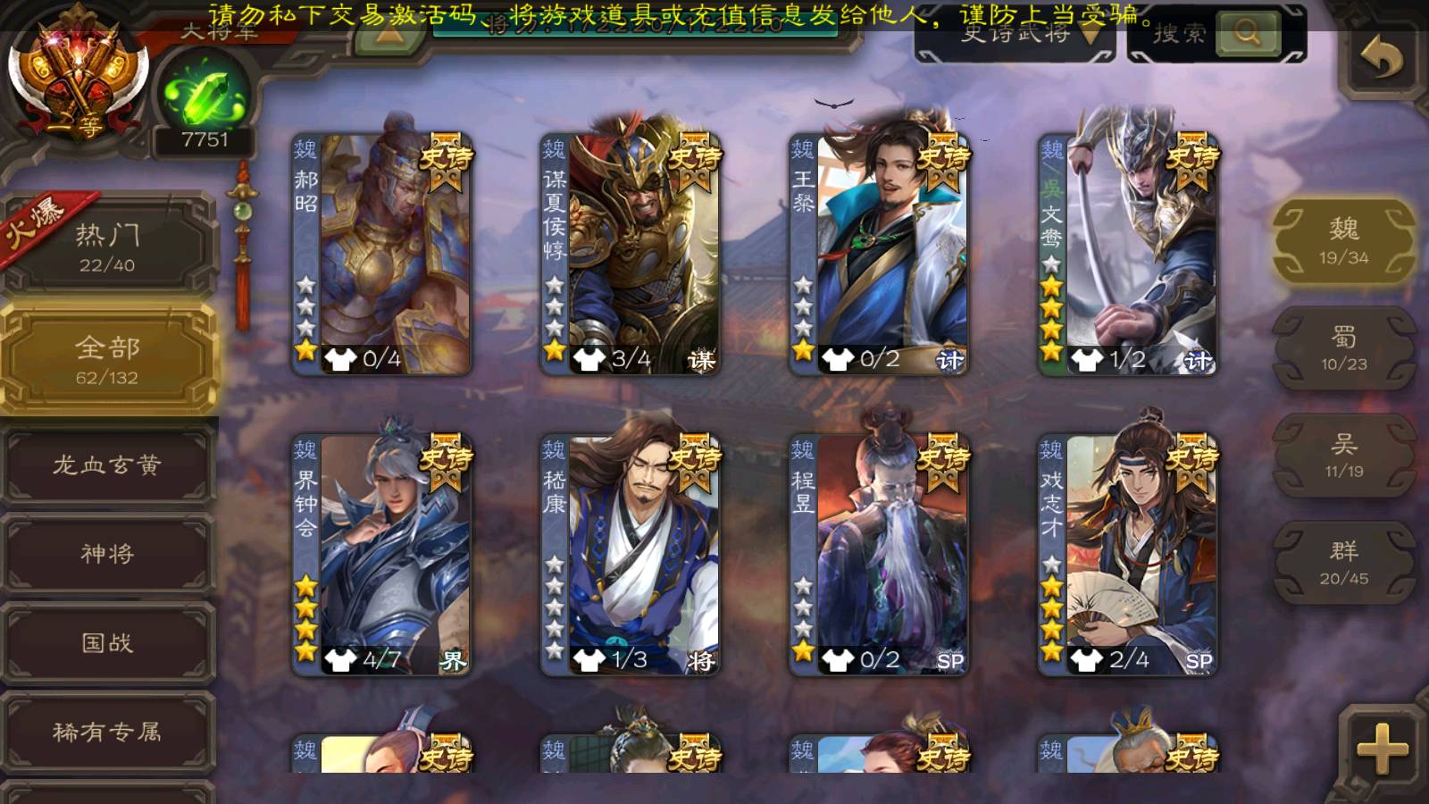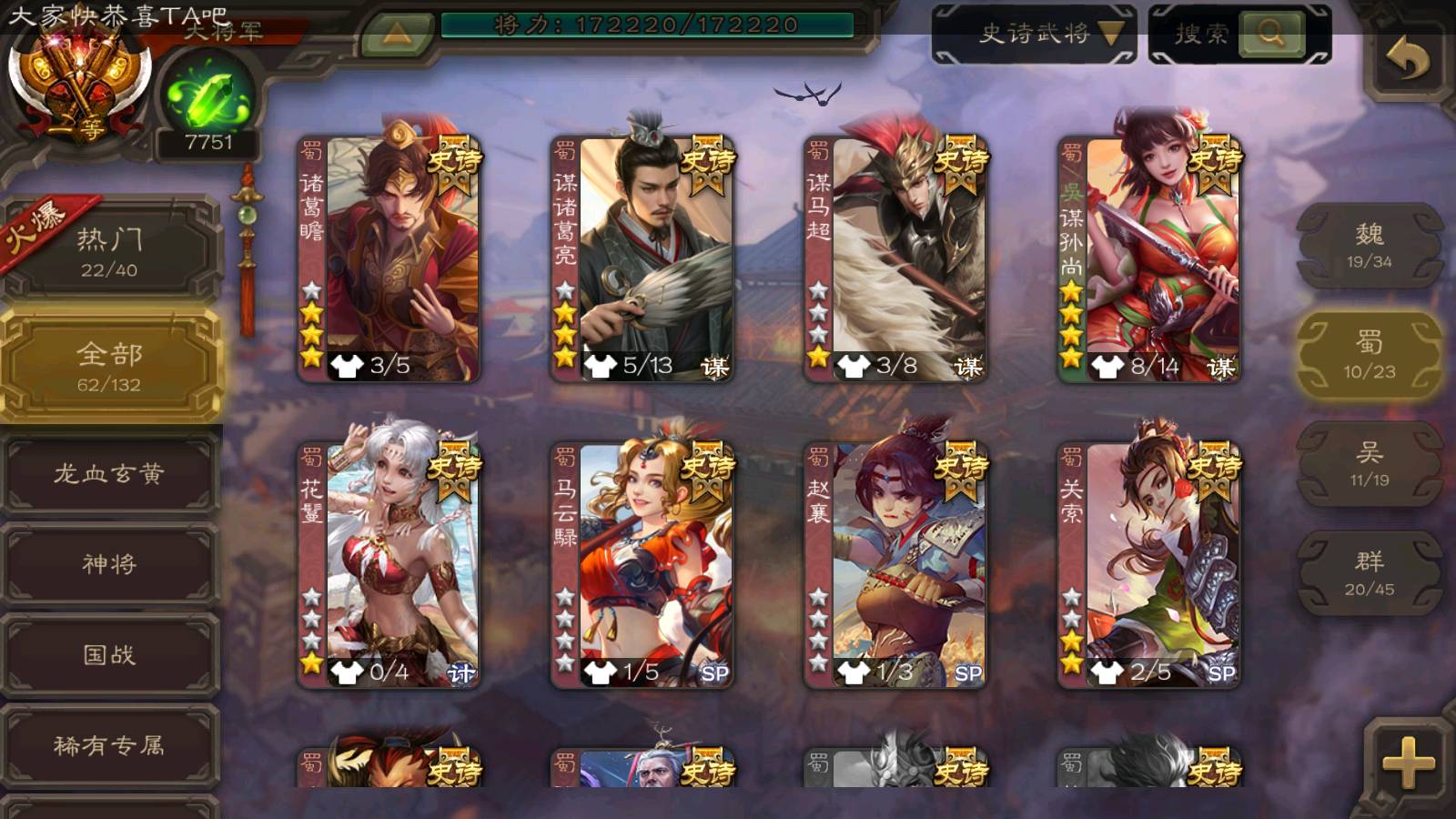 (群雄):杨彪,杜预,谋貂蝉,界左慈,张让,界李儒,苏飞,麴义,许攸,司马昭,南华老仙,谋张角,陶谦,公孙康,郑玄,星黄忠,星董卓,左慈,沮授,兀突骨