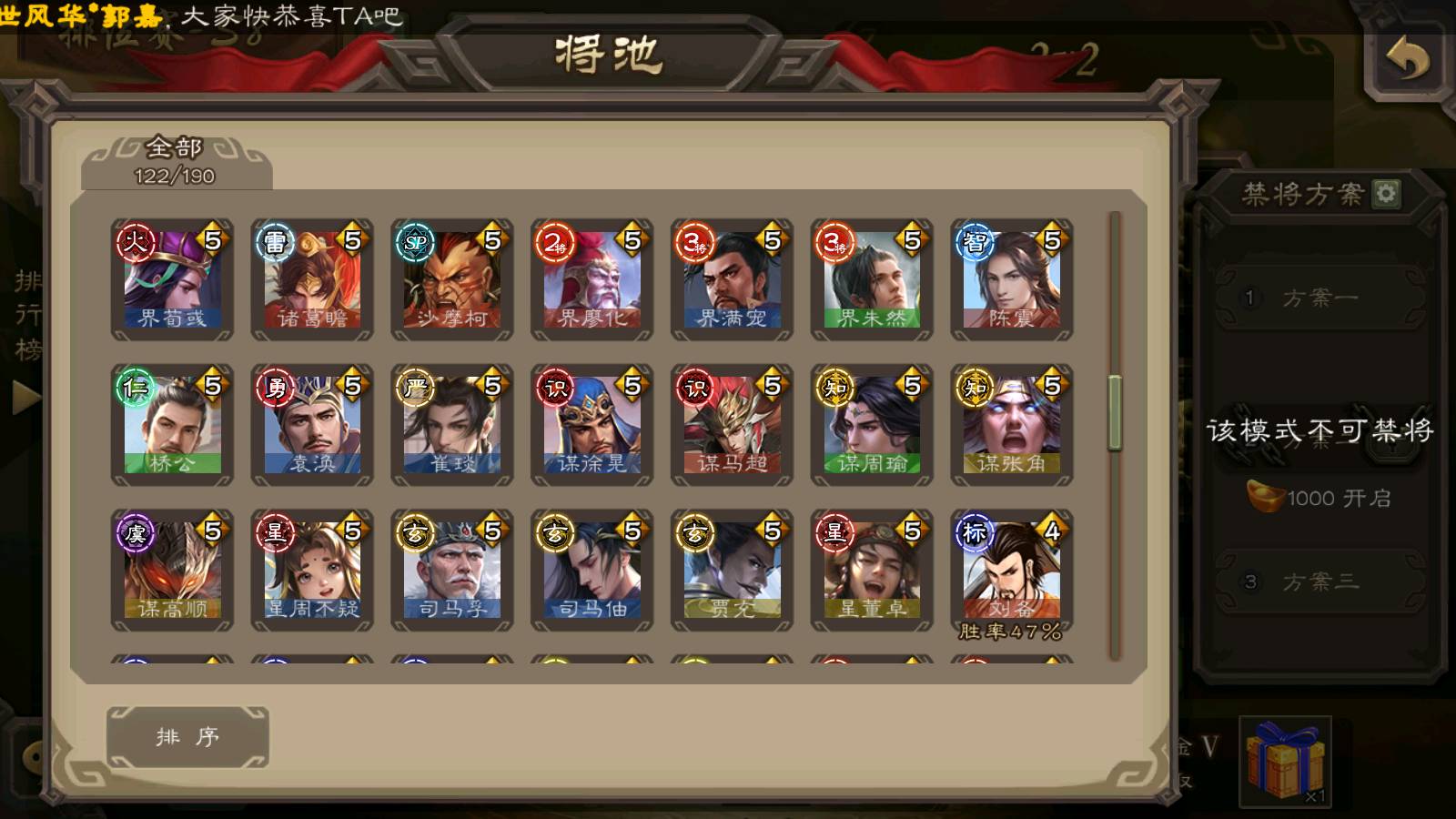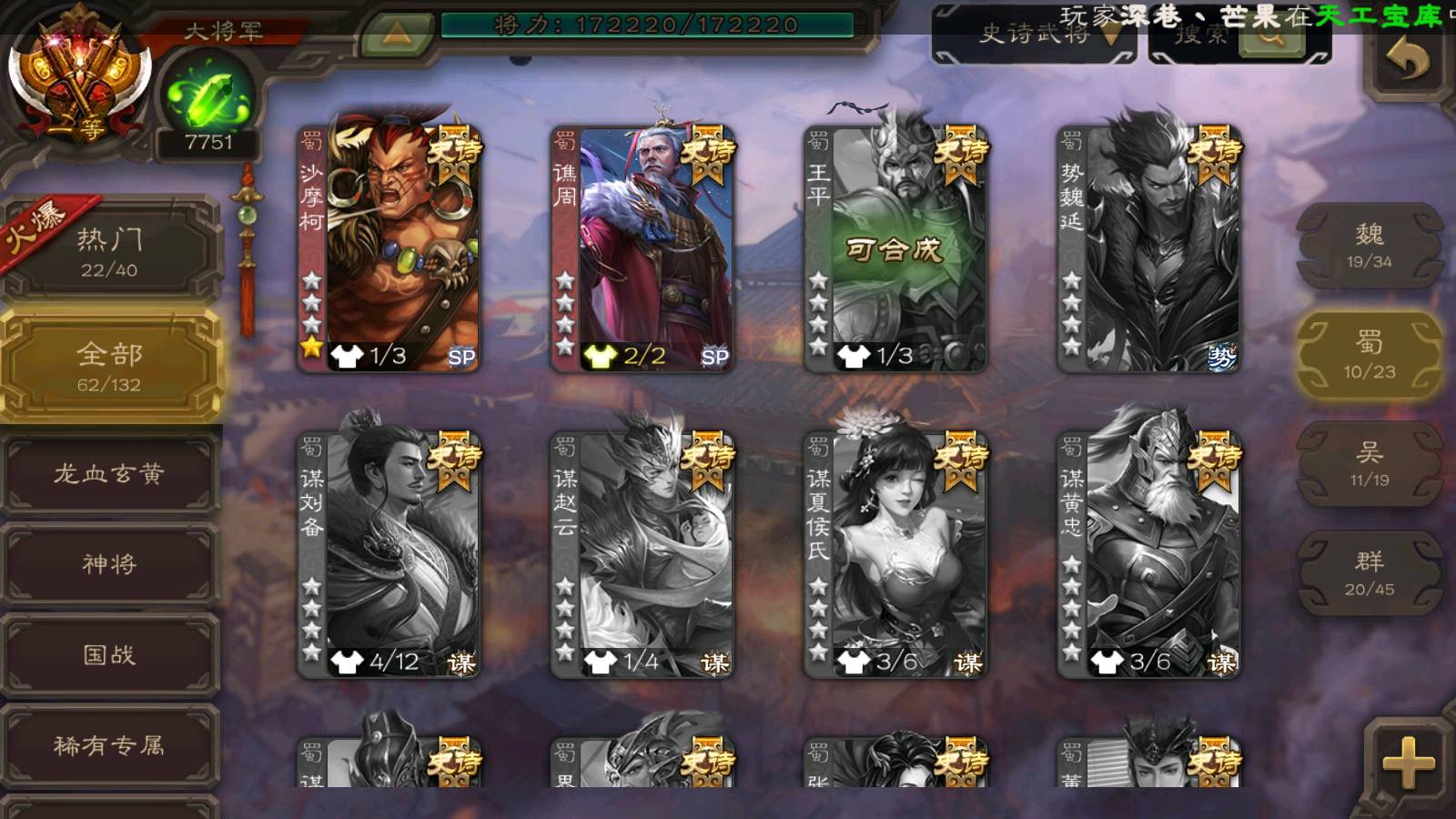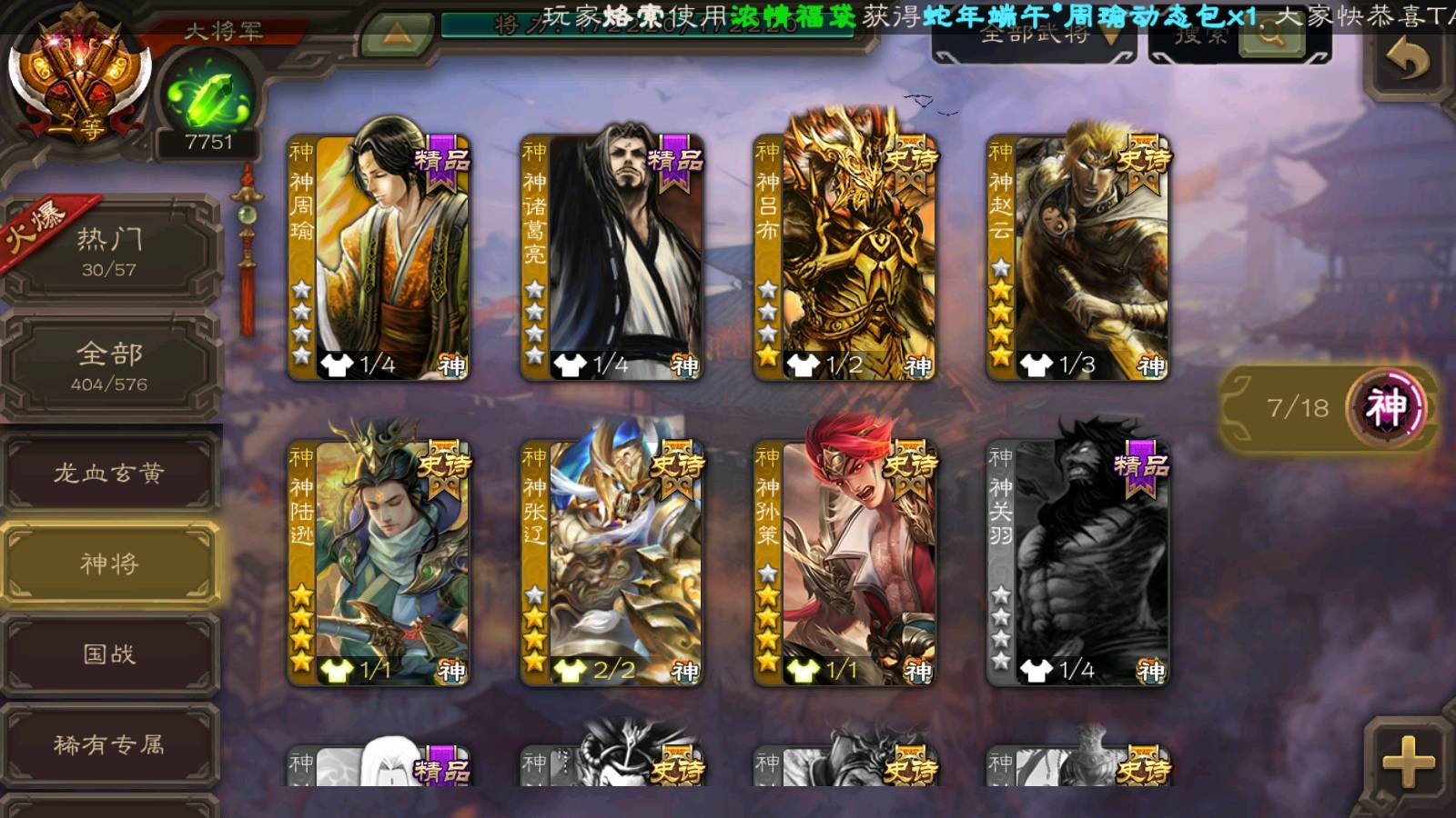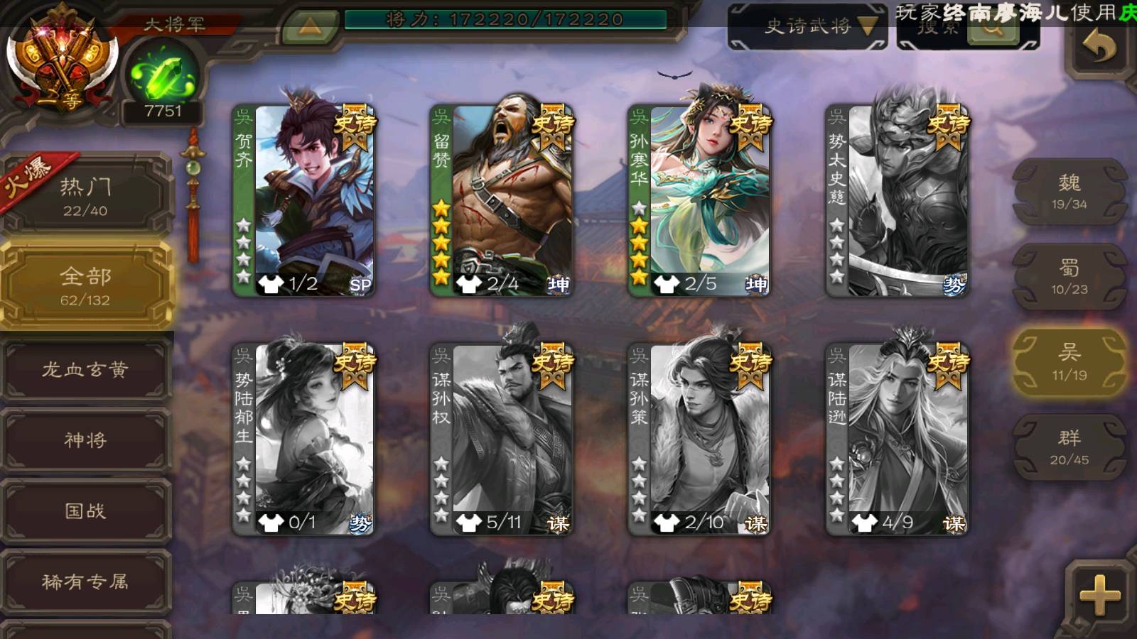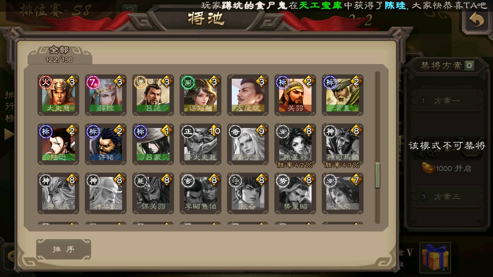 (群雄):杨彪,杜预,谋貂蝉,界左慈,张让,界李儒,苏飞,麴义,许攸,司马昭,南华老仙,谋张角,陶谦,公孙康,郑玄,星黄忠,星董卓,左慈,沮授,兀突骨