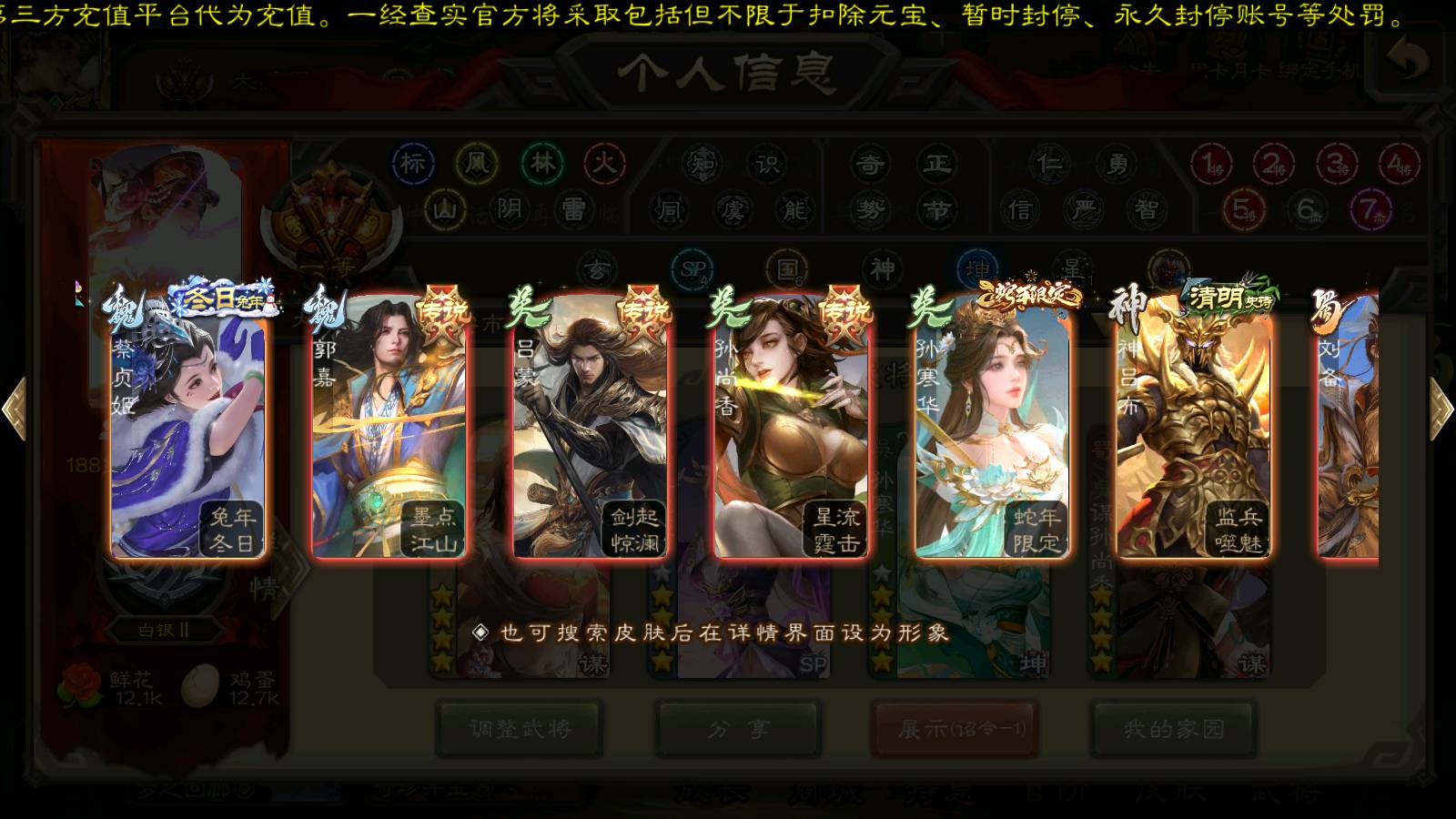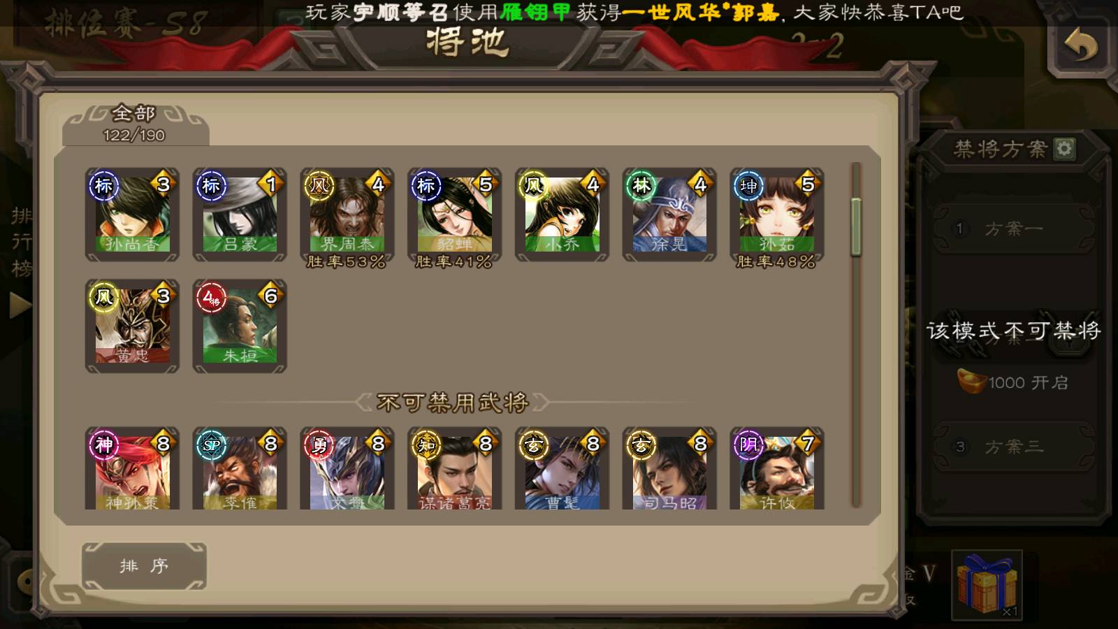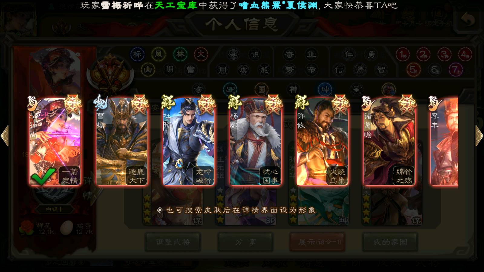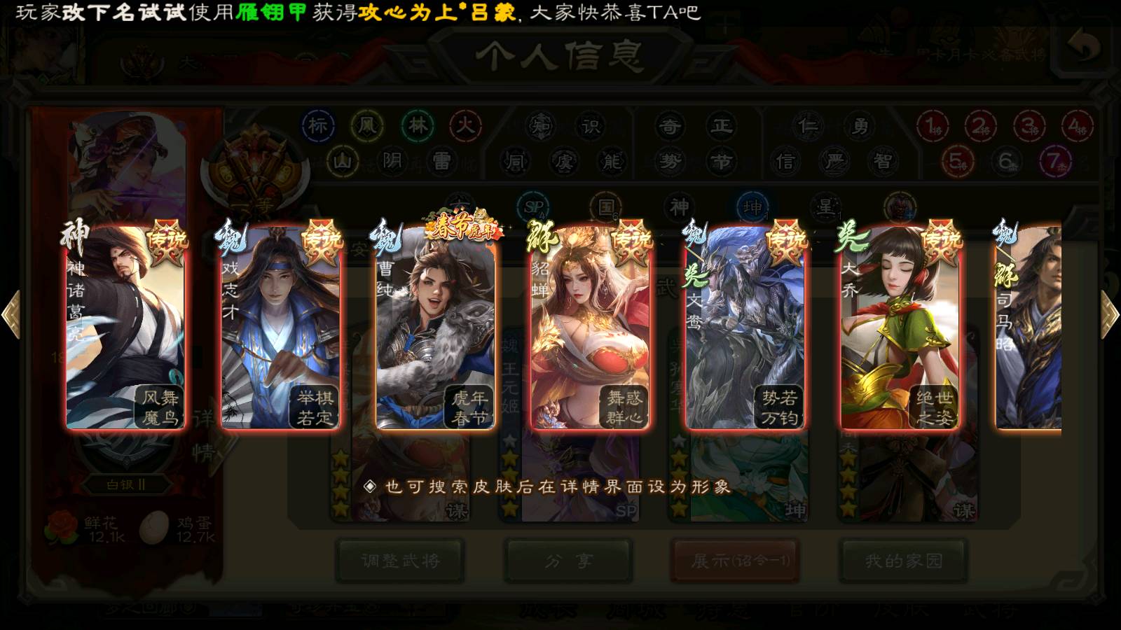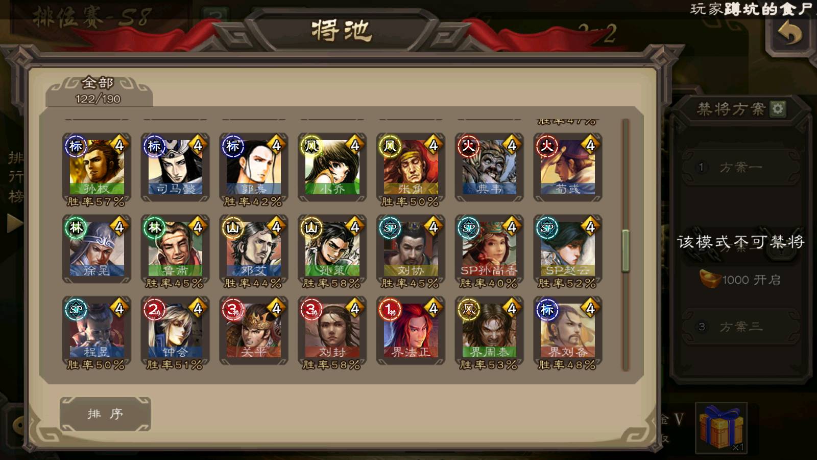 (群雄):杨彪,杜预,谋貂蝉,界左慈,张让,界李儒,苏飞,麴义,许攸,司马昭,南华老仙,谋张角,陶谦,公孙康,郑玄,星黄忠,星董卓,左慈,沮授,兀突骨