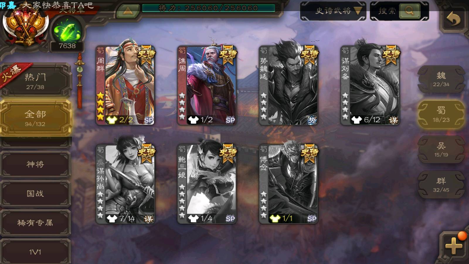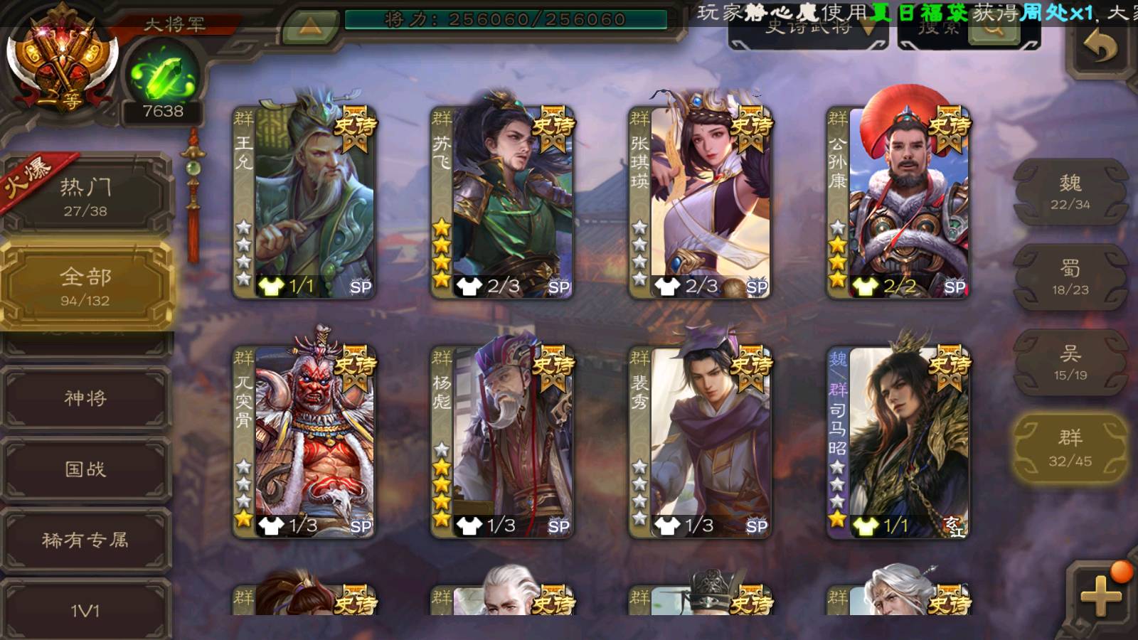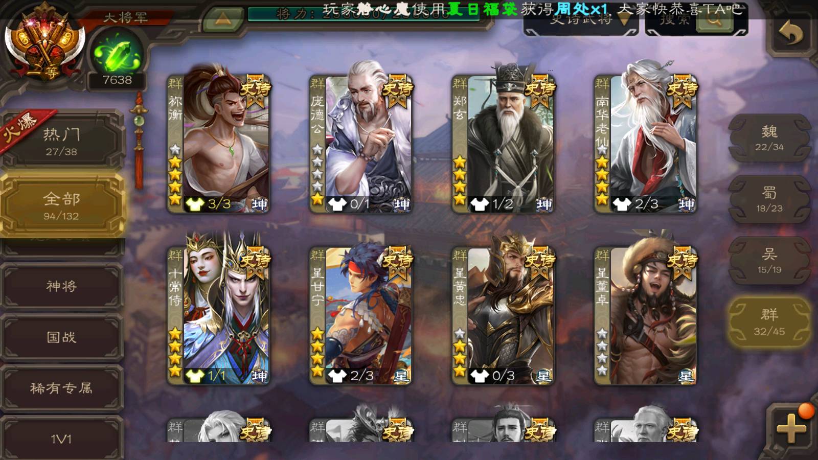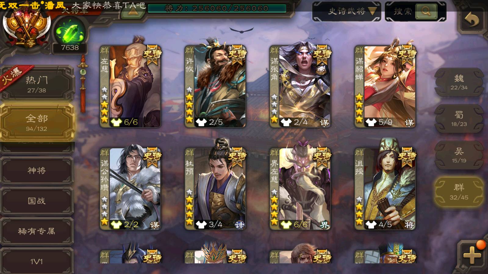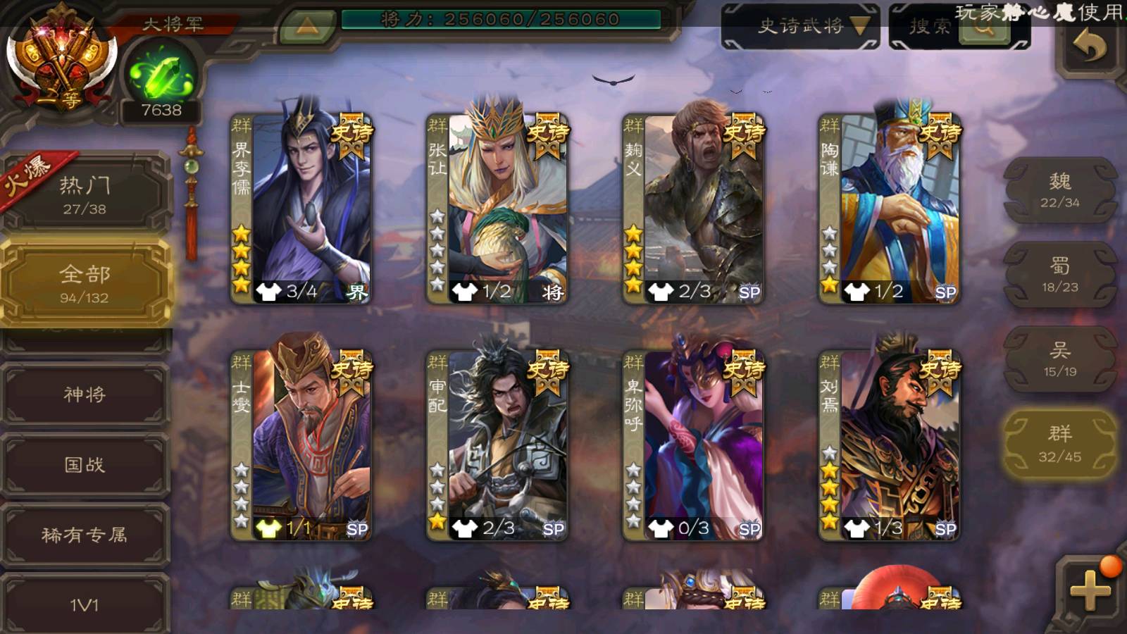(群雄):刘焉,杨彪,杜预,祢衡,界左慈,南华老仙,麴义,许攸,十常侍,星董卓,谋貂蝉,司马昭,张让,界李儒,苏飞,庞德公,星甘宁,谋公孙瓒,张琪瑛,裴秀,卑弥呼,士燮,谋张角,王允,公孙康,郑玄,陶谦,审配,星黄忠,左慈,沮授,兀突骨