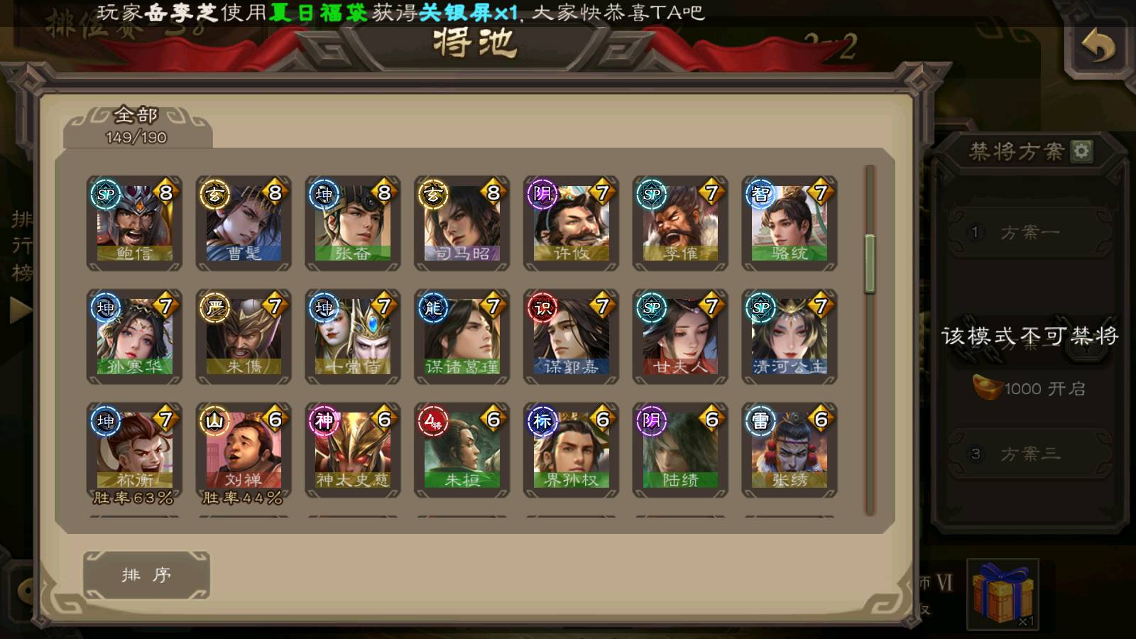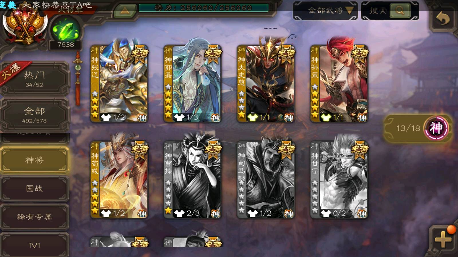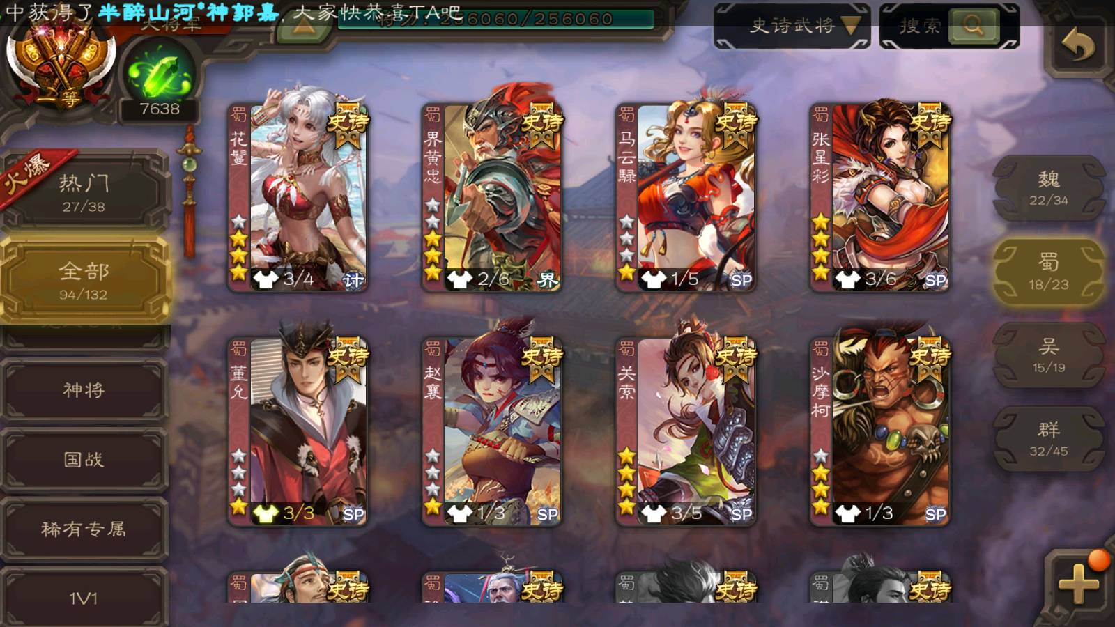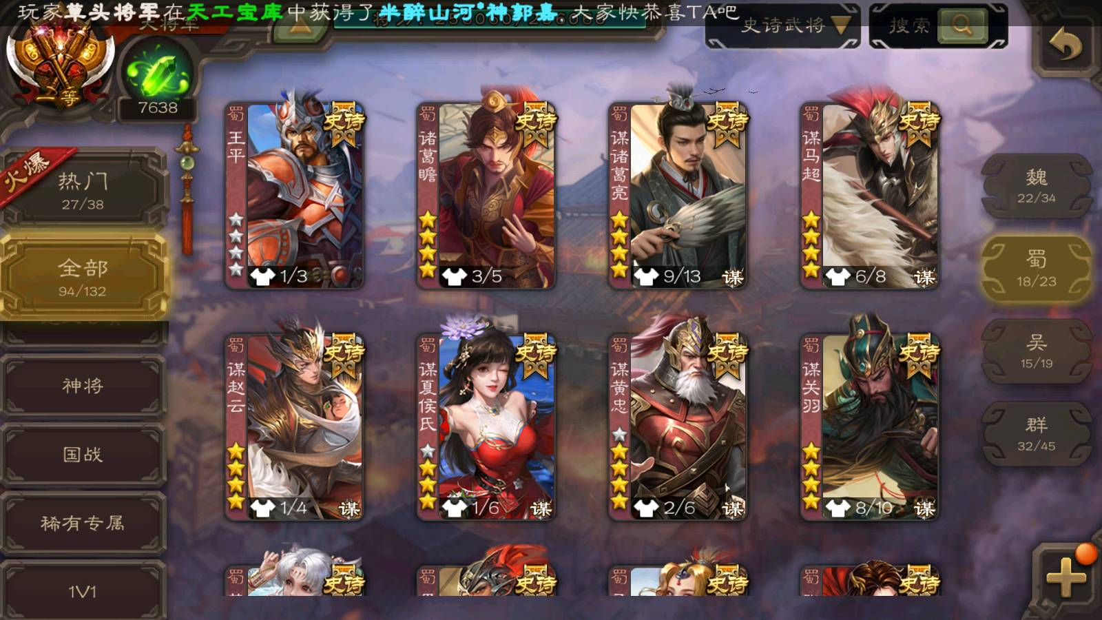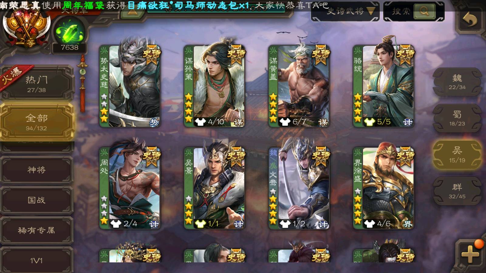 (群雄):刘焉,杨彪,杜预,祢衡,界左慈,南华老仙,麴义,许攸,十常侍,星董卓,谋貂蝉,司马昭,张让,界李儒,苏飞,庞德公,星甘宁,谋公孙瓒,张琪瑛,裴秀,卑弥呼,士燮,谋张角,王允,公孙康,郑玄,陶谦,审配,星黄忠,左慈,沮授,兀突骨