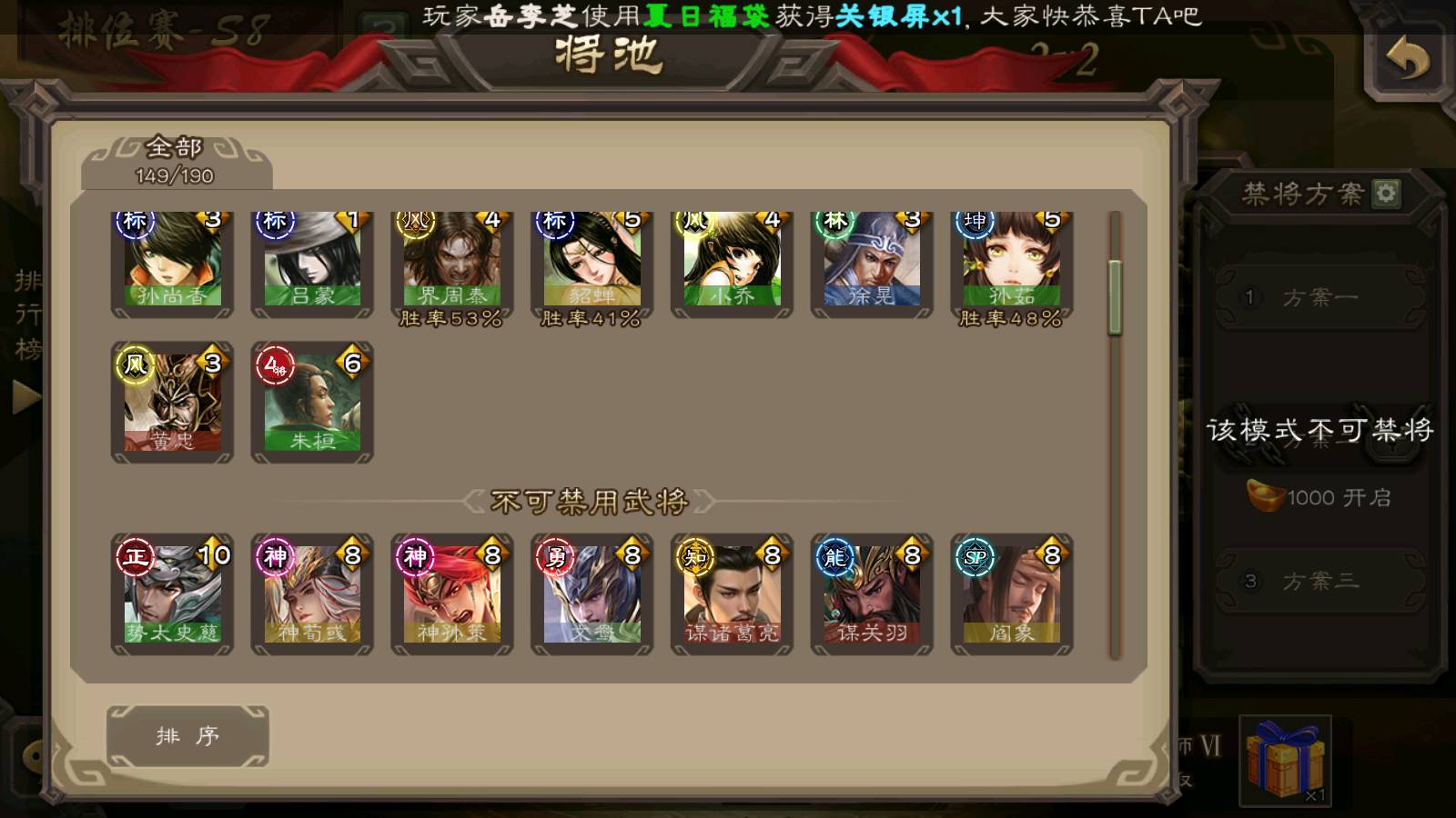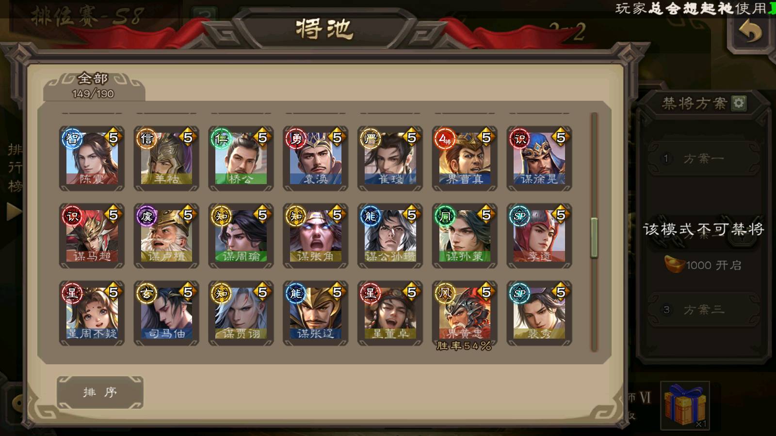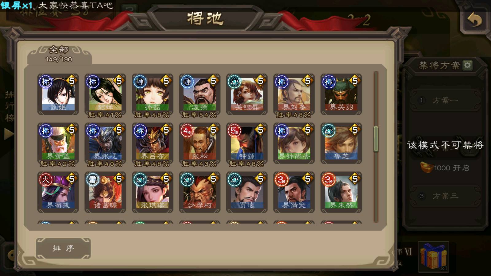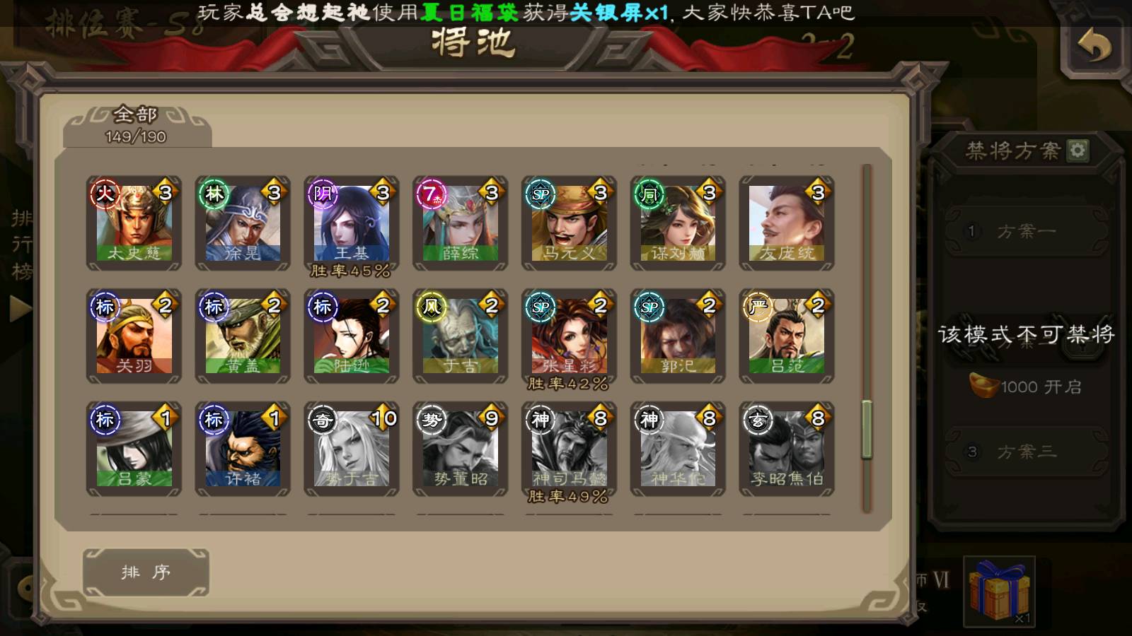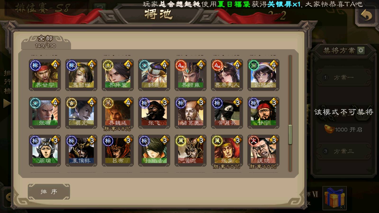 (群雄):刘焉,杨彪,杜预,祢衡,界左慈,南华老仙,麴义,许攸,十常侍,星董卓,谋貂蝉,司马昭,张让,界李儒,苏飞,庞德公,星甘宁,谋公孙瓒,张琪瑛,裴秀,卑弥呼,士燮,谋张角,王允,公孙康,郑玄,陶谦,审配,星黄忠,左慈,沮授,兀突骨
