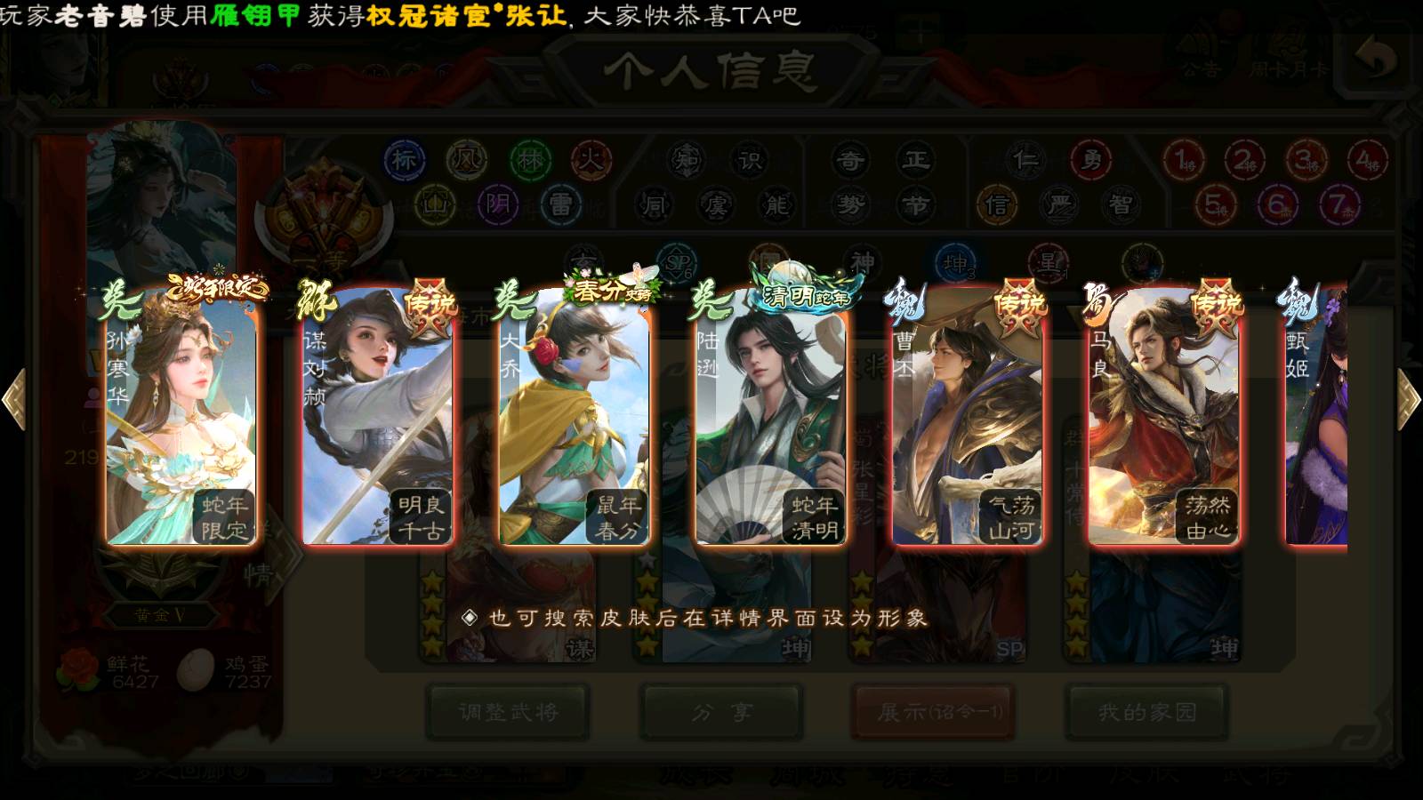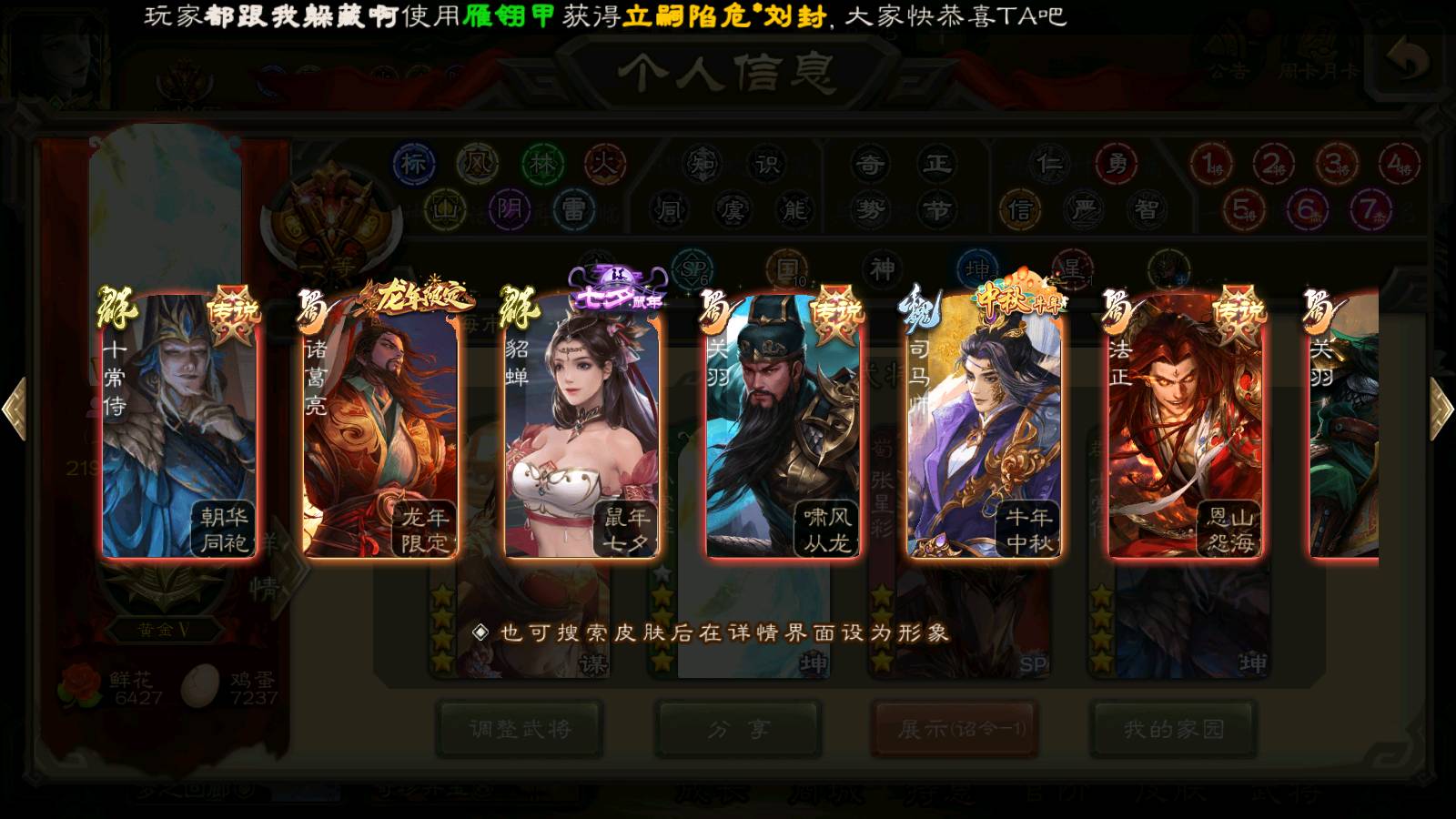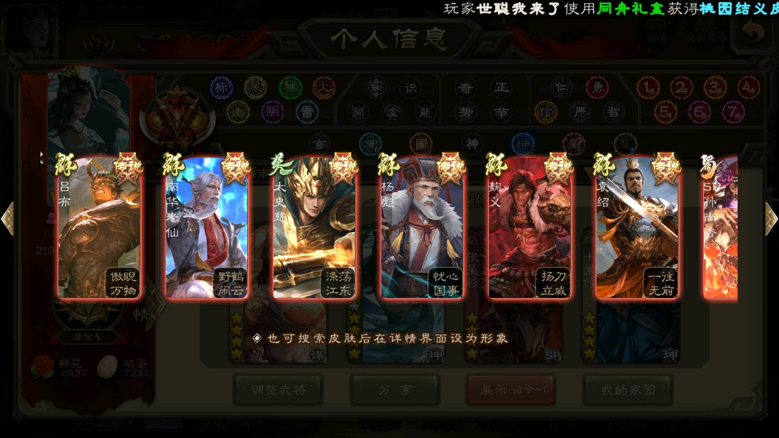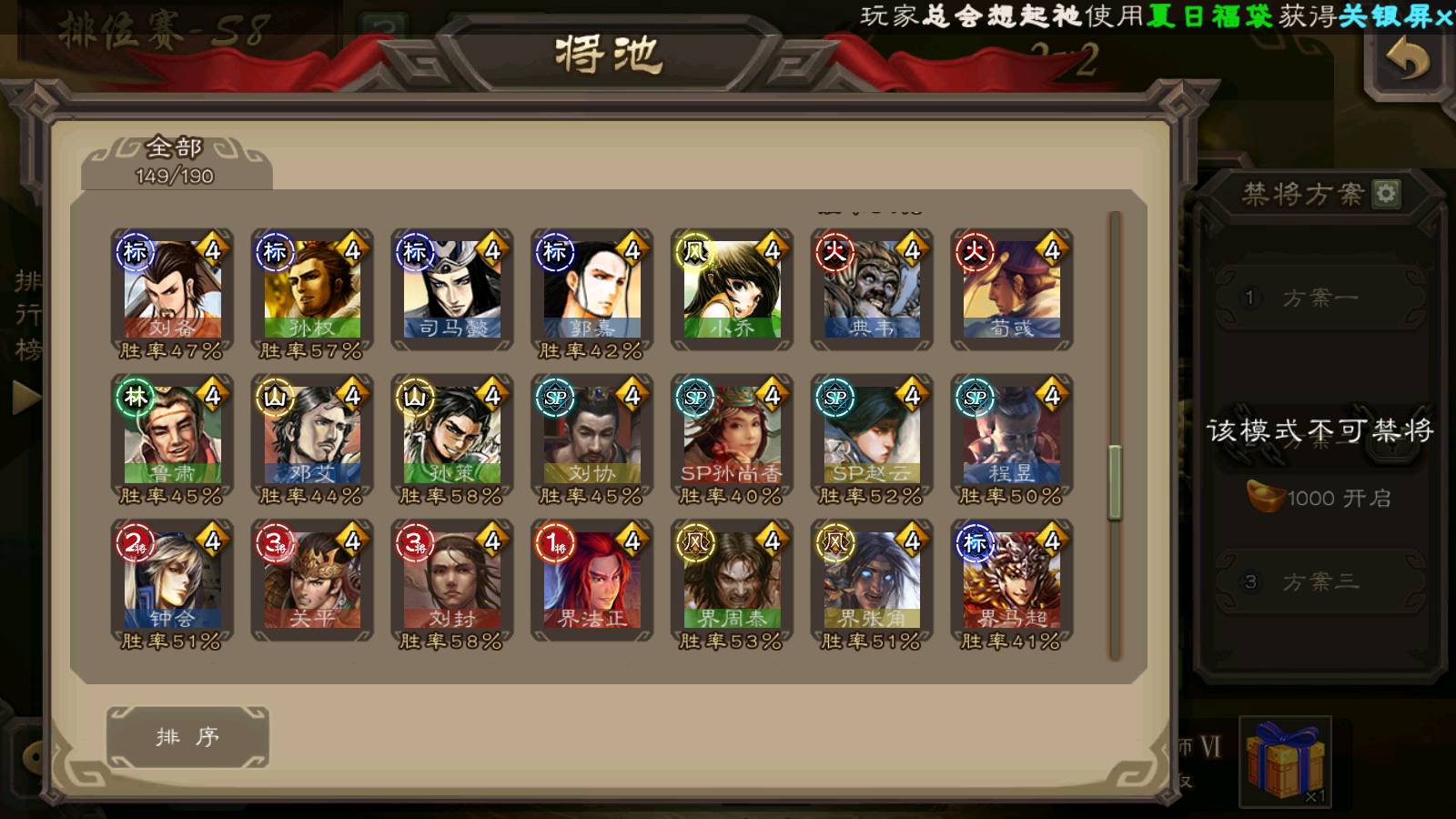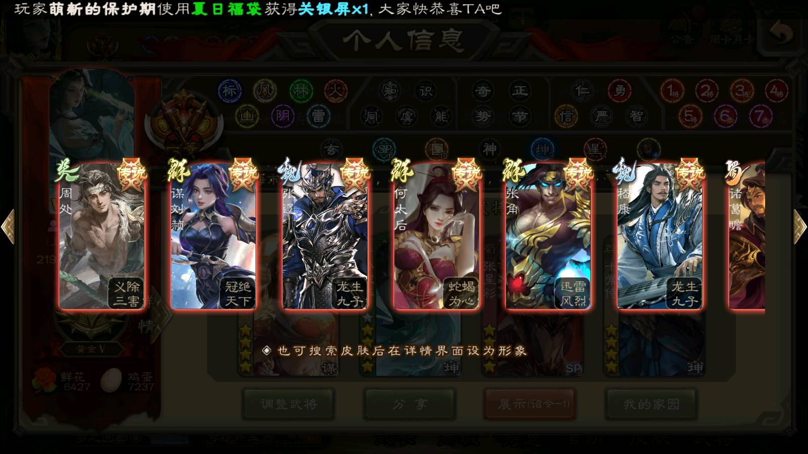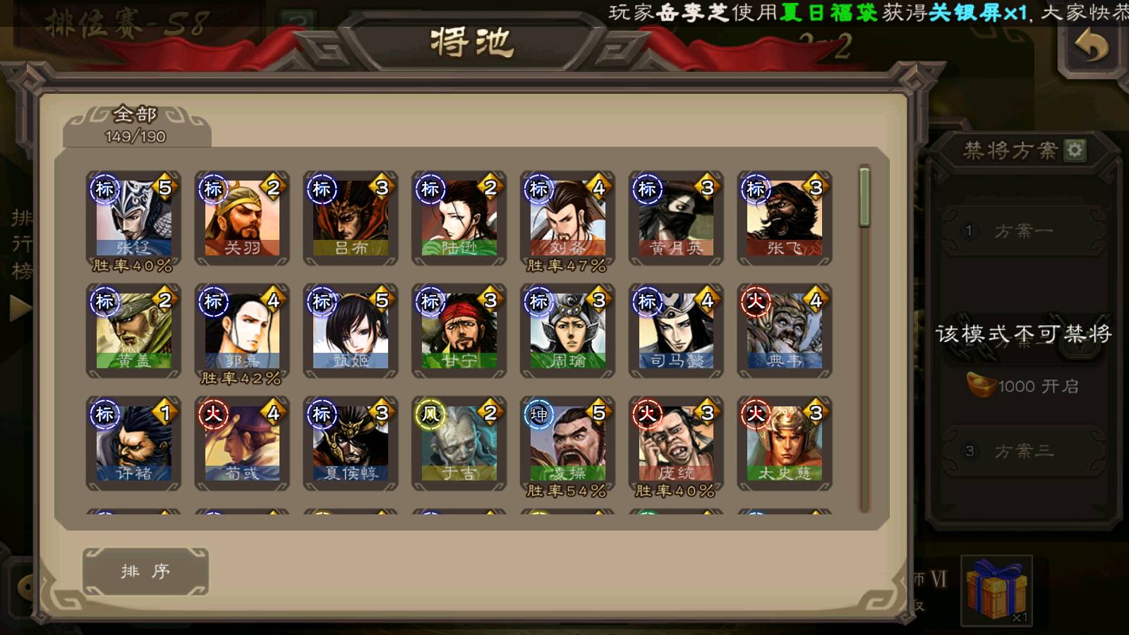 (群雄):刘焉,杨彪,杜预,祢衡,界左慈,南华老仙,麴义,许攸,十常侍,星董卓,谋貂蝉,司马昭,张让,界李儒,苏飞,庞德公,星甘宁,谋公孙瓒,张琪瑛,裴秀,卑弥呼,士燮,谋张角,王允,公孙康,郑玄,陶谦,审配,星黄忠,左慈,沮授,兀突骨
