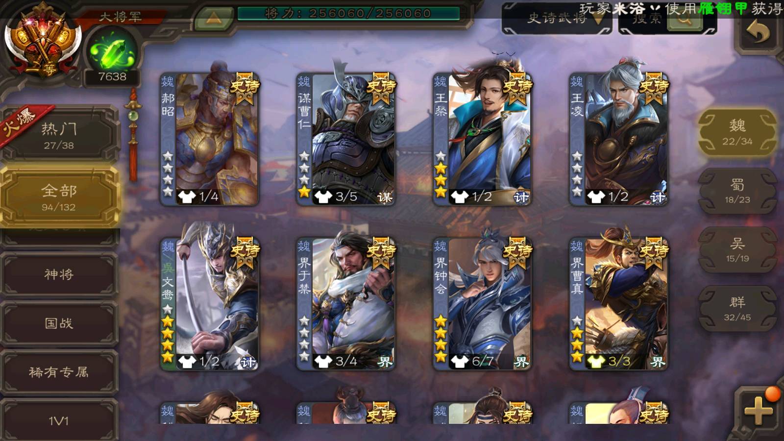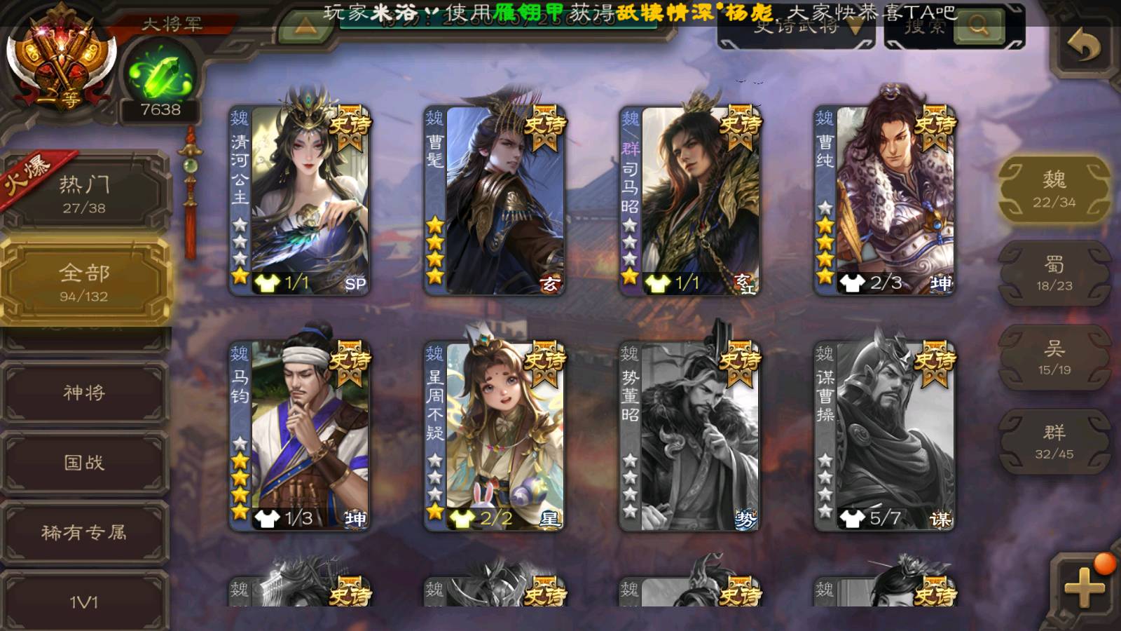 (魏国):曹婴,马钧,文鸯,戏志才,界钟会,曹髦,SP司马昭,谋曹仁,清河公主,界于禁,郝昭,王粲,界曹真,王凌,星周不疑,程昱,曹纯,杨修,陈琳,嵇康,刘晔