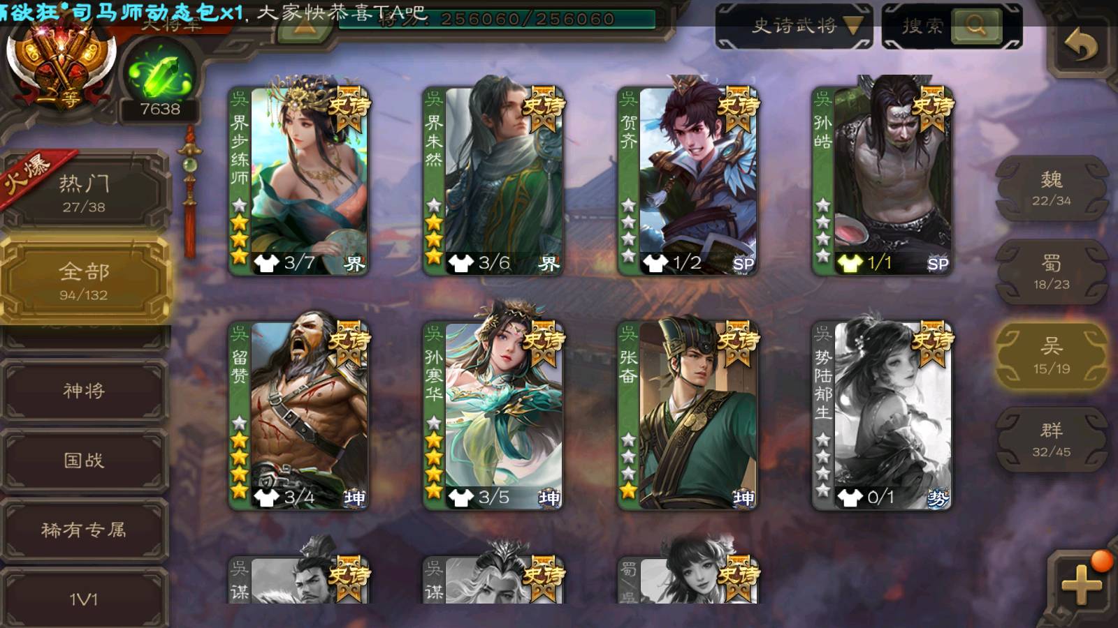 (吴国):界徐盛,留赞,孙寒华,谋黄盖,张奋,势太史慈,周处,骆统,谋孙策,界朱然,界步练师,吴景,贺齐,孙皓