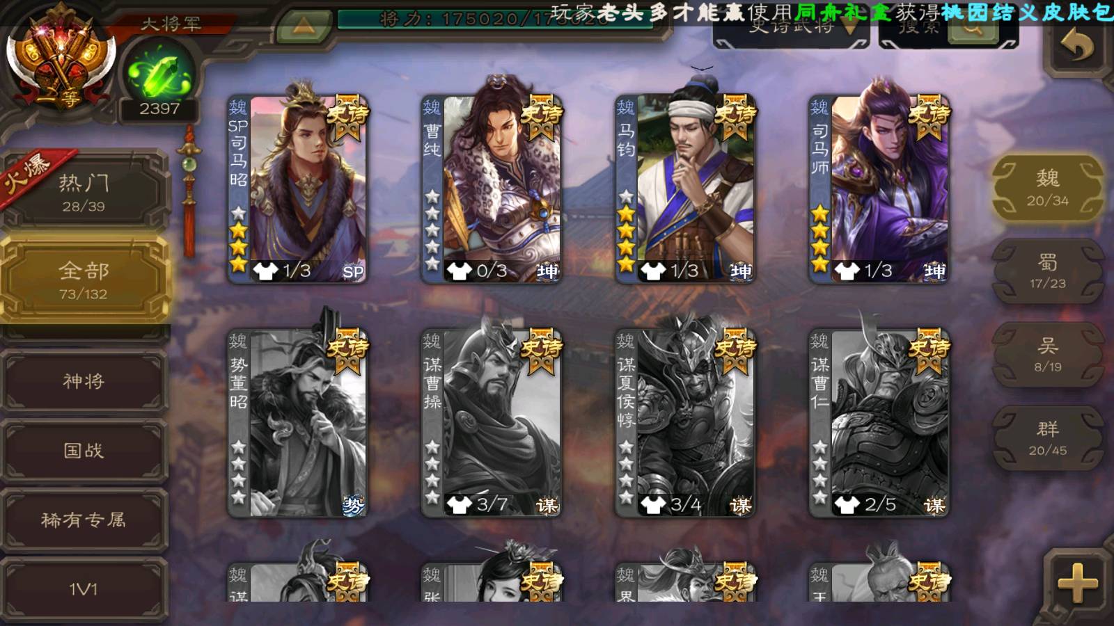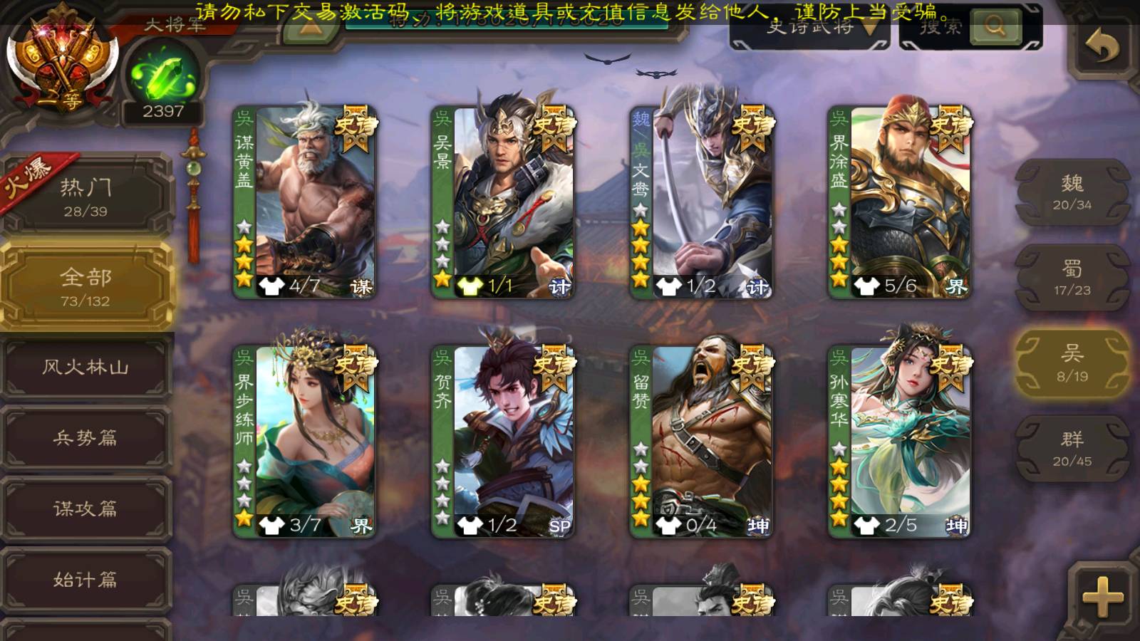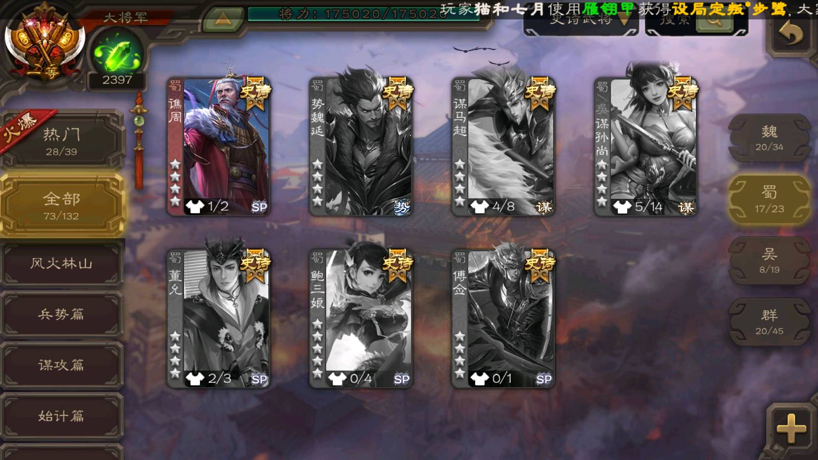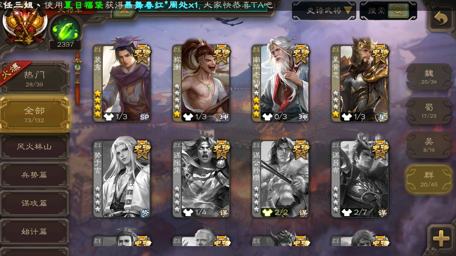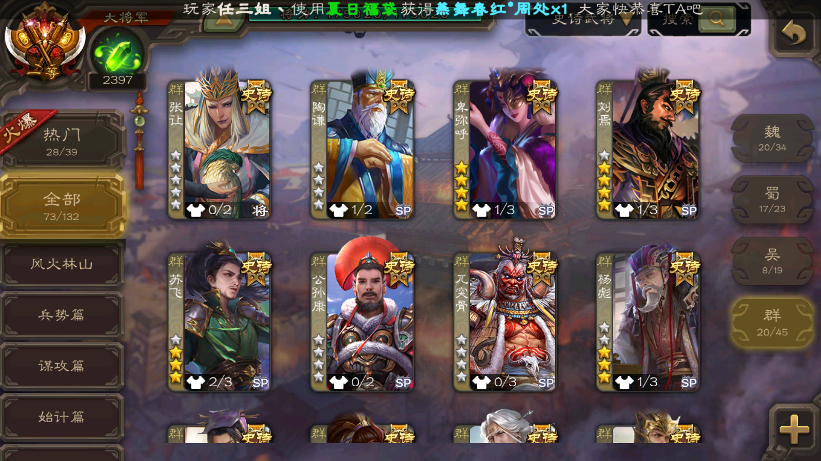 (群雄):刘焉,杨彪,杜预,祢衡,界左慈,界沮授,南华老仙,许攸,谋貂蝉,张让,界李儒,苏飞,裴秀,卑弥呼,公孙康,陶谦,星黄忠,左慈,沮授,兀突骨