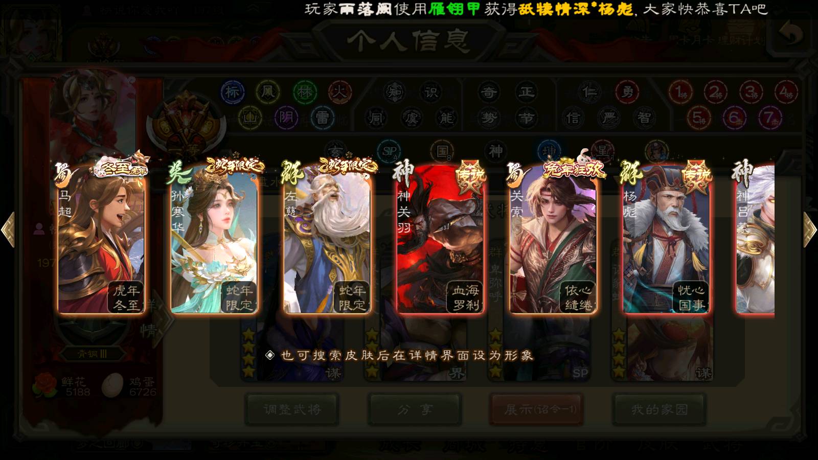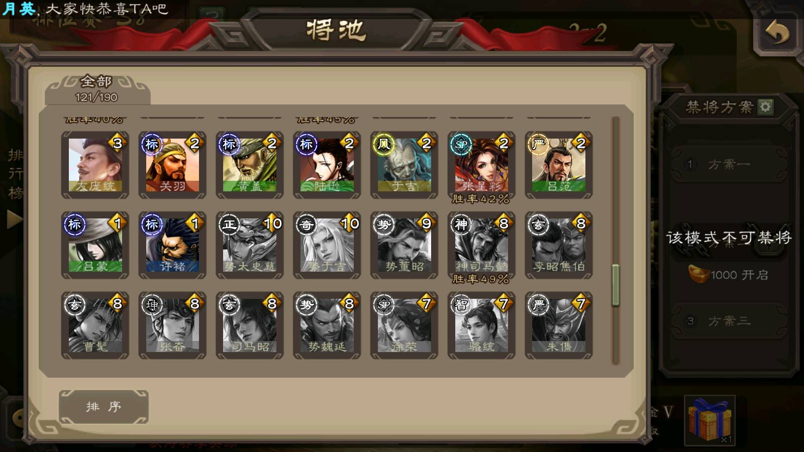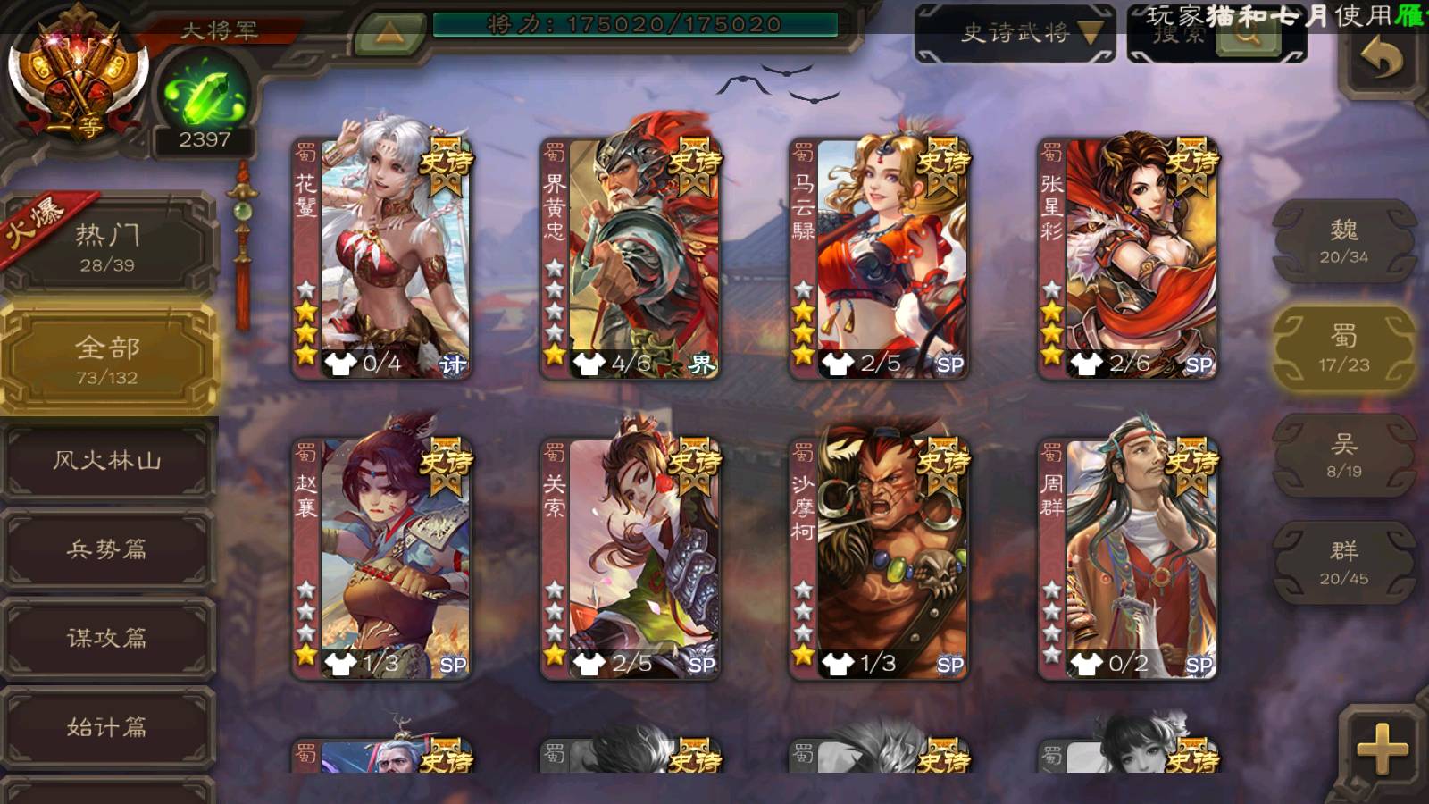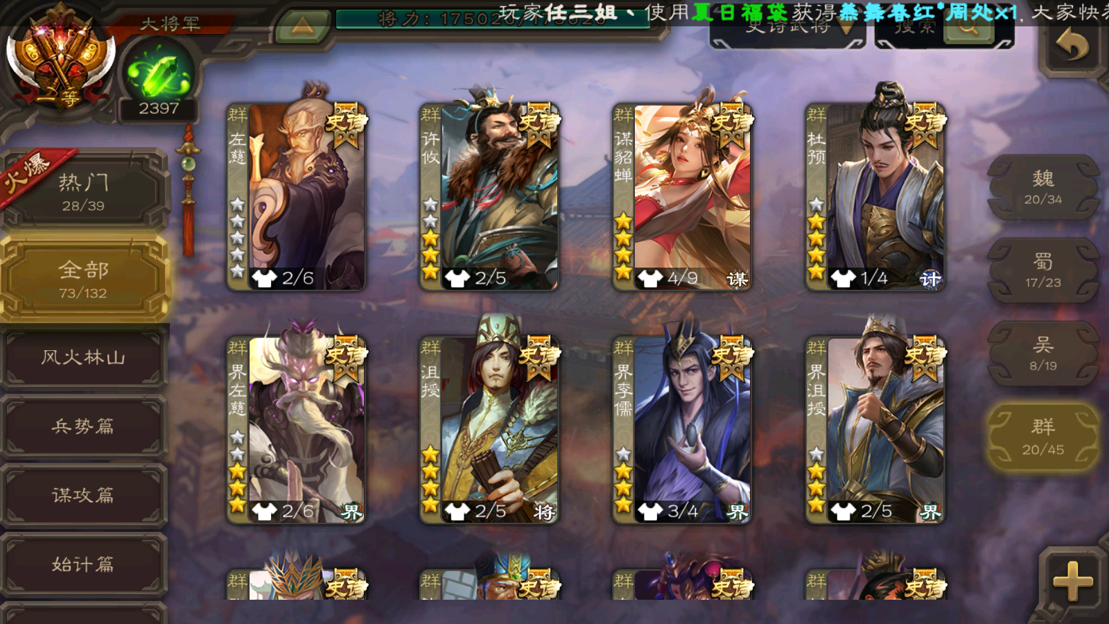 (群雄):刘焉,杨彪,杜预,祢衡,界左慈,界沮授,南华老仙,许攸,谋貂蝉,张让,界李儒,苏飞,裴秀,卑弥呼,公孙康,陶谦,星黄忠,左慈,沮授,兀突骨