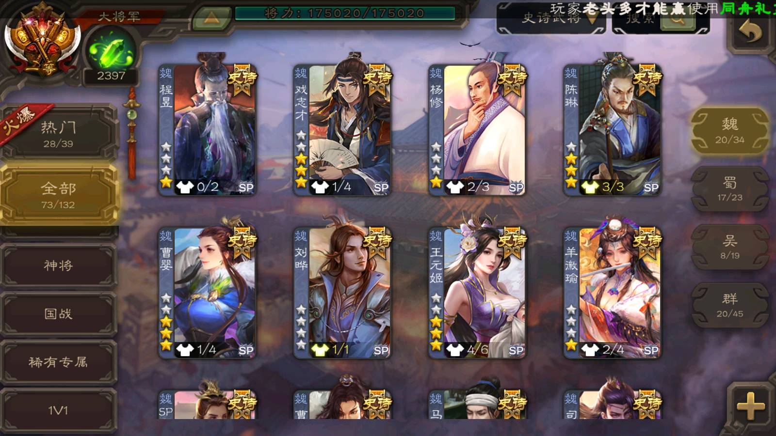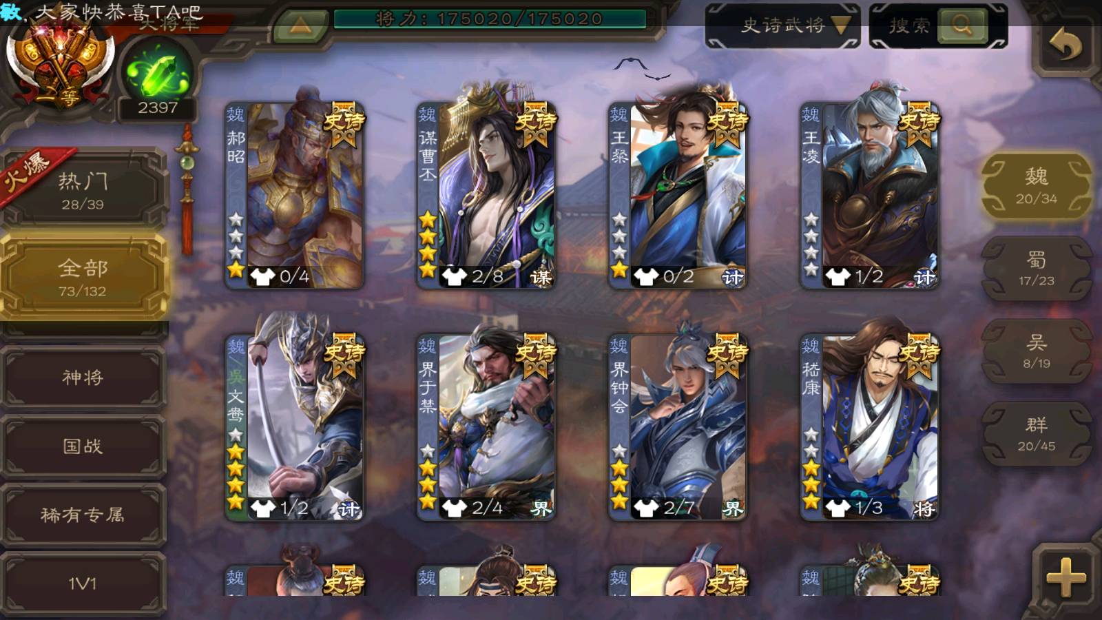 (魏国):曹婴,马钧,王元姬,羊徽瑜,文鸯,戏志才,界钟会,谋曹丕,SP司马昭,司马师,界于禁,郝昭,王粲,王凌,程昱,曹纯,杨修,陈琳,嵇康,刘晔
