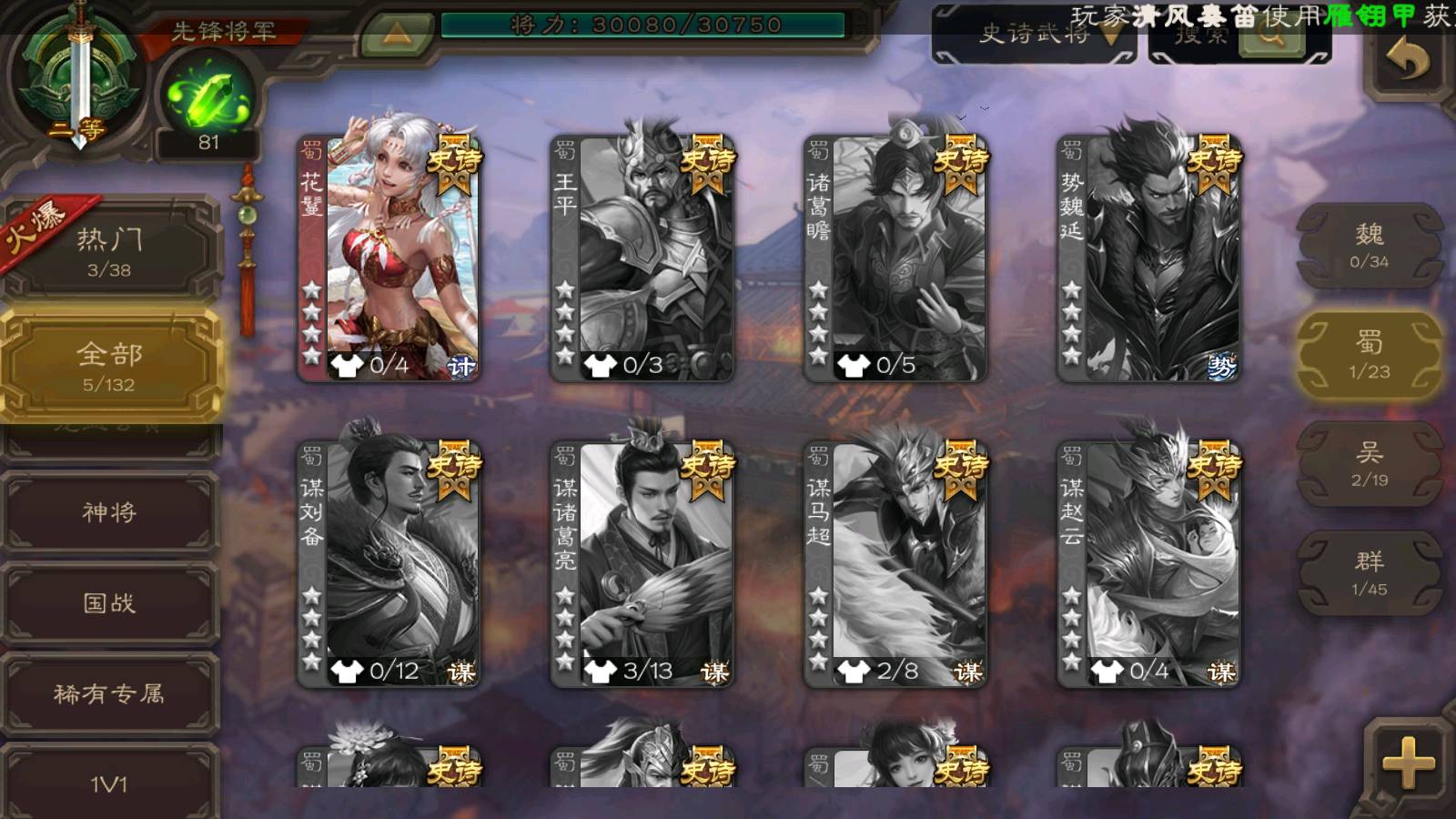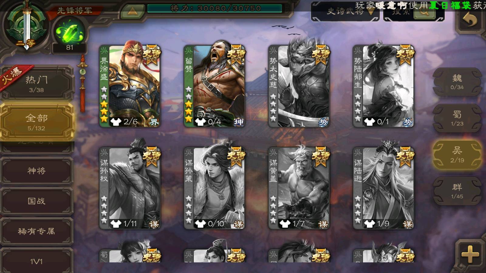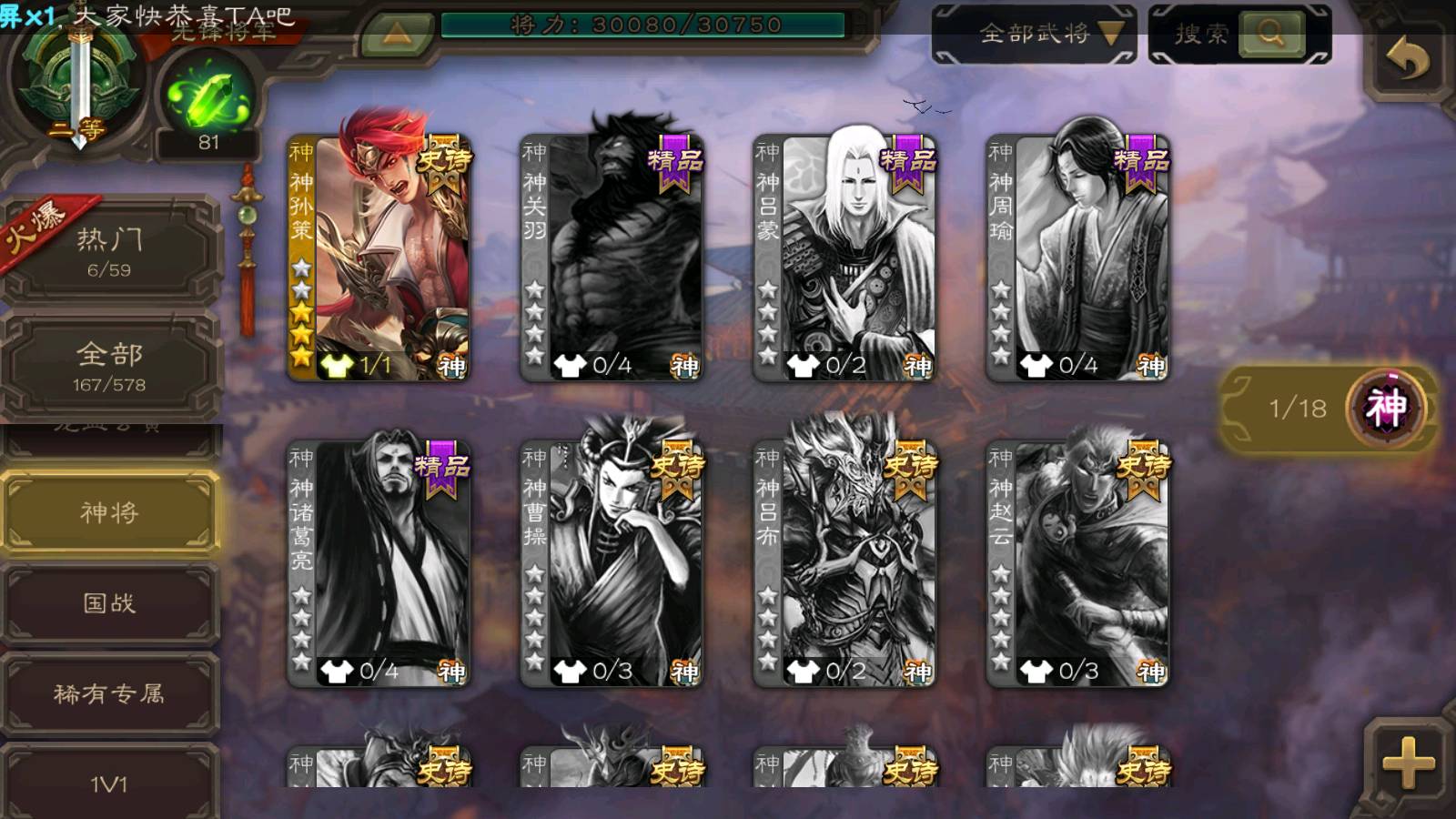 商品编号22311 全部皮肤95,动态皮肤5,全部武将167,排位武将57,国战武将59,史诗武将5,神孙策动皮