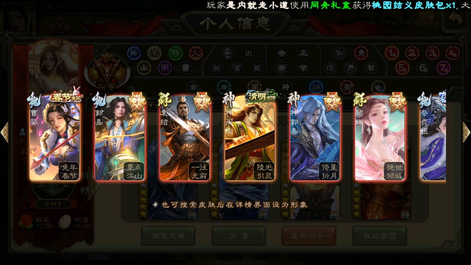 商品编号22324 全部皮肤503,动态皮肤53,全部武将431,排位武将116,国战武将97,史诗武将59,神郭嘉回廊,界钟会回廊,神荀彧动皮,谋貂蝉回廊,神孙策动皮,杜预动皮,许攸动皮,宝珠85,雁翎4.6w,将魂9.4k