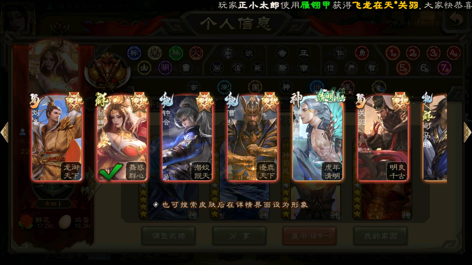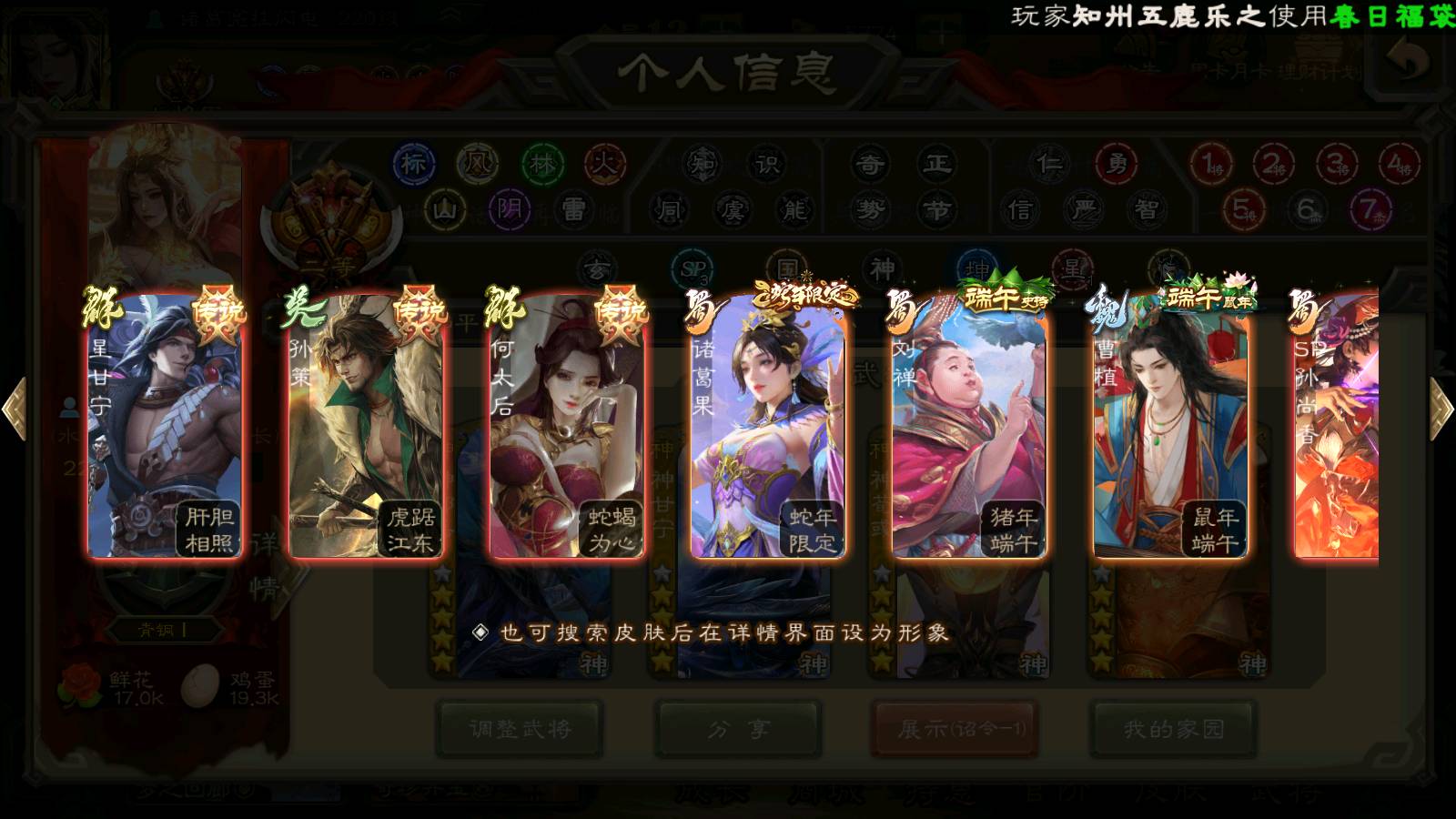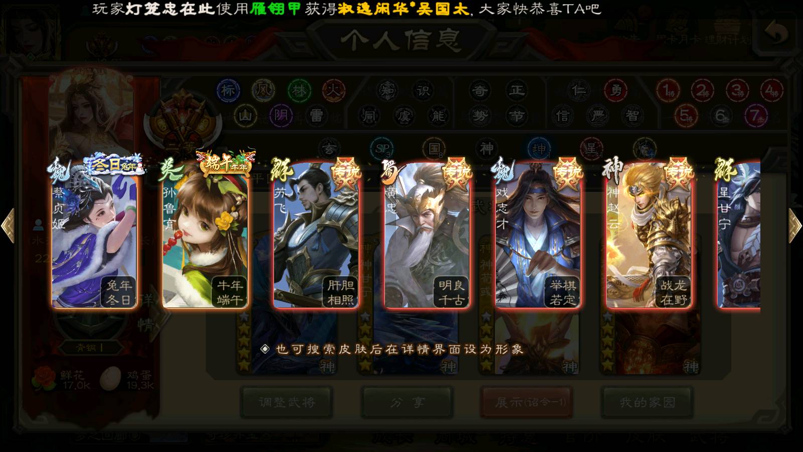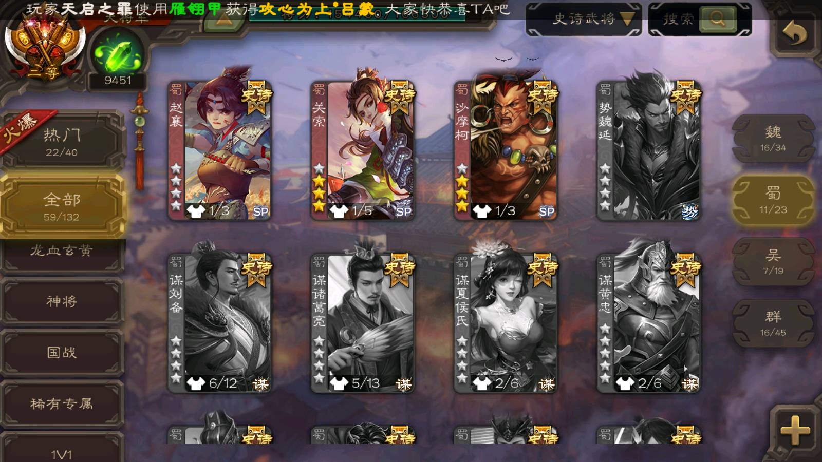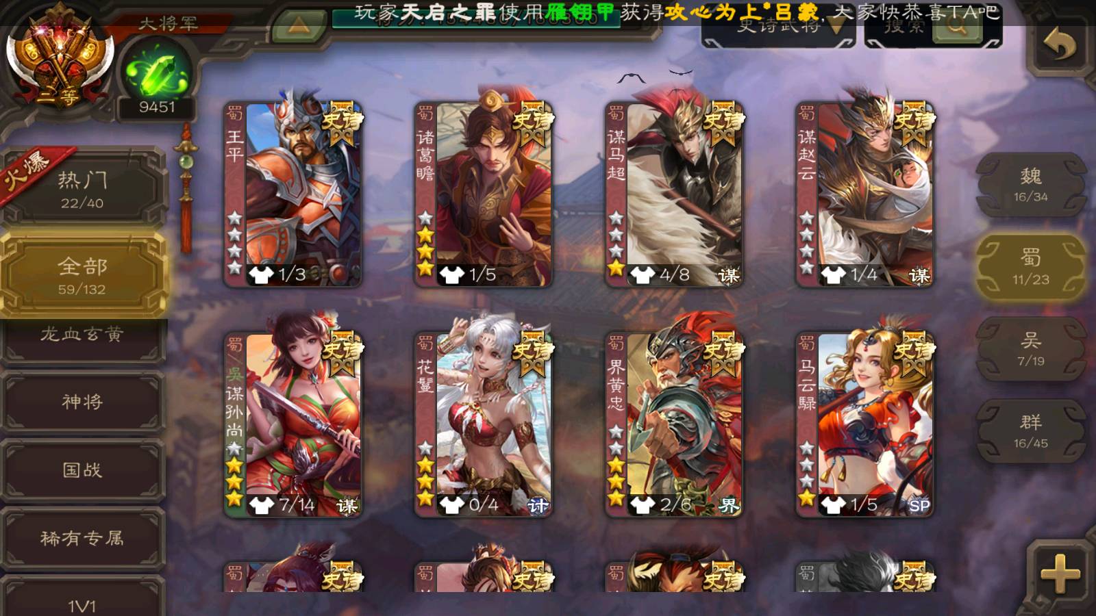 (蜀国):界黄忠,谋孙尚香,诸葛瞻,谋赵云,花鬘,沙摩柯,谋马超,关索,王平,马云騄,赵襄