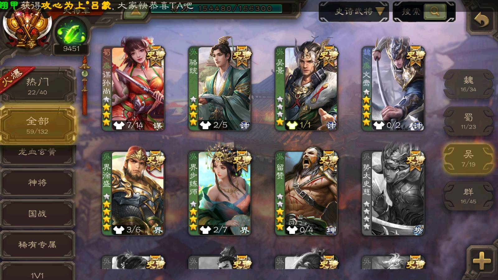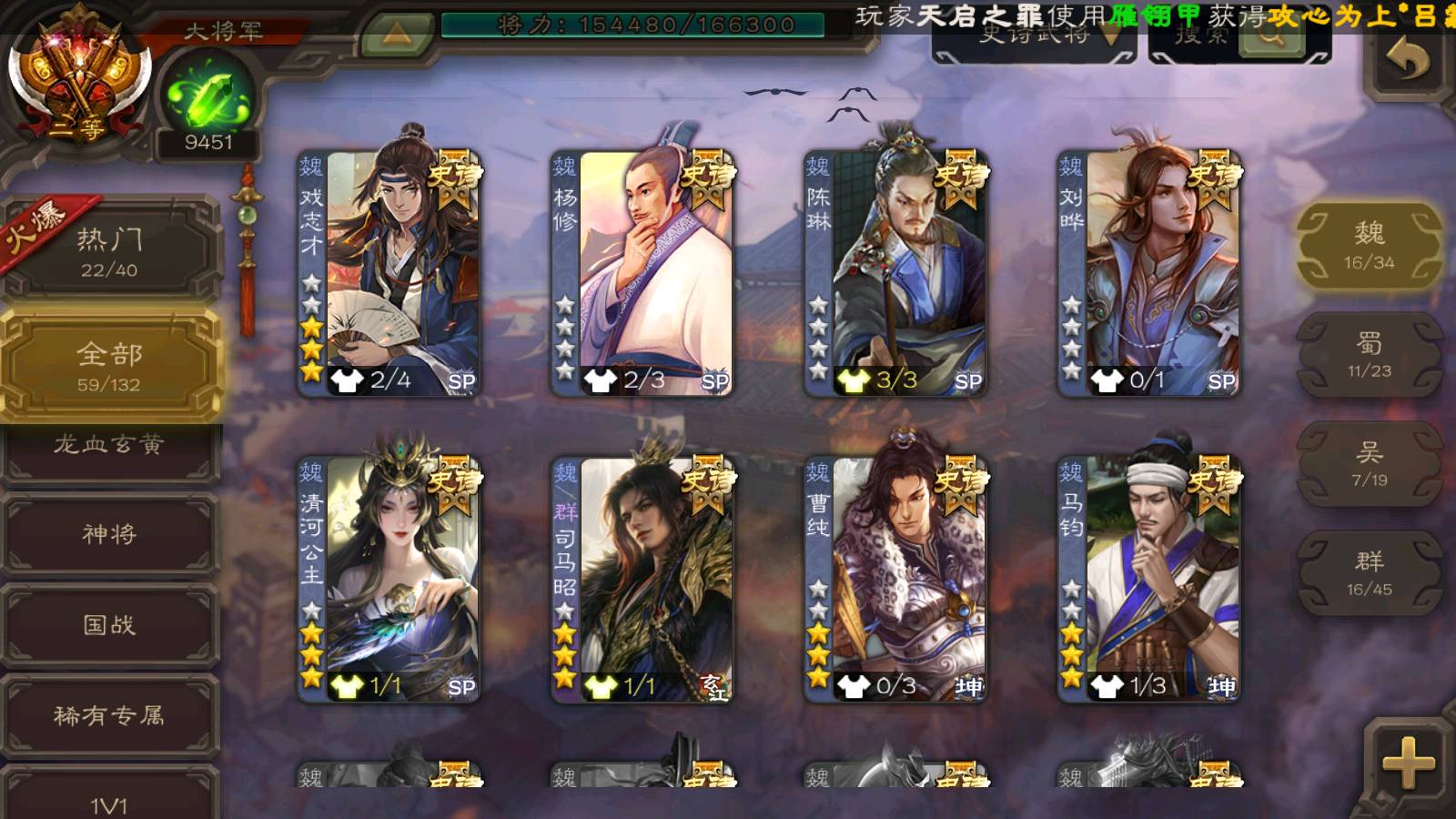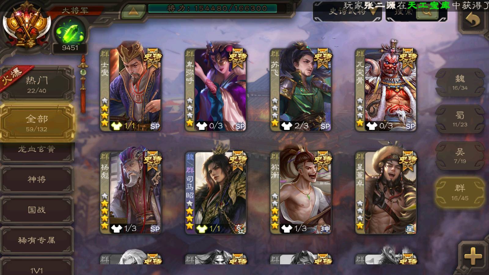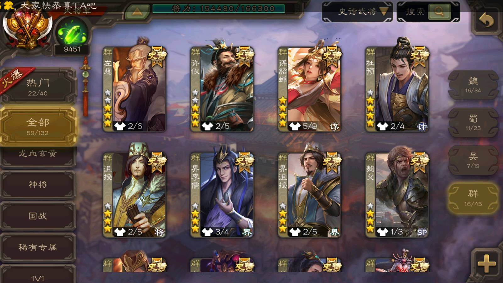 (群雄):杨彪,杜预,祢衡,界沮授,麴义,许攸,星董卓,谋貂蝉,司马昭,界李儒,苏飞,卑弥呼,士燮,左慈,沮授,兀突骨