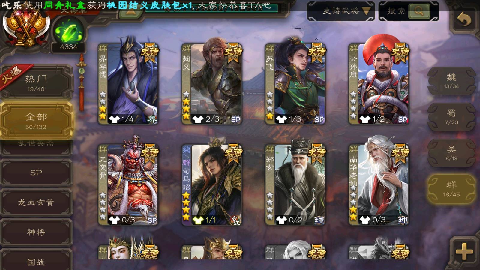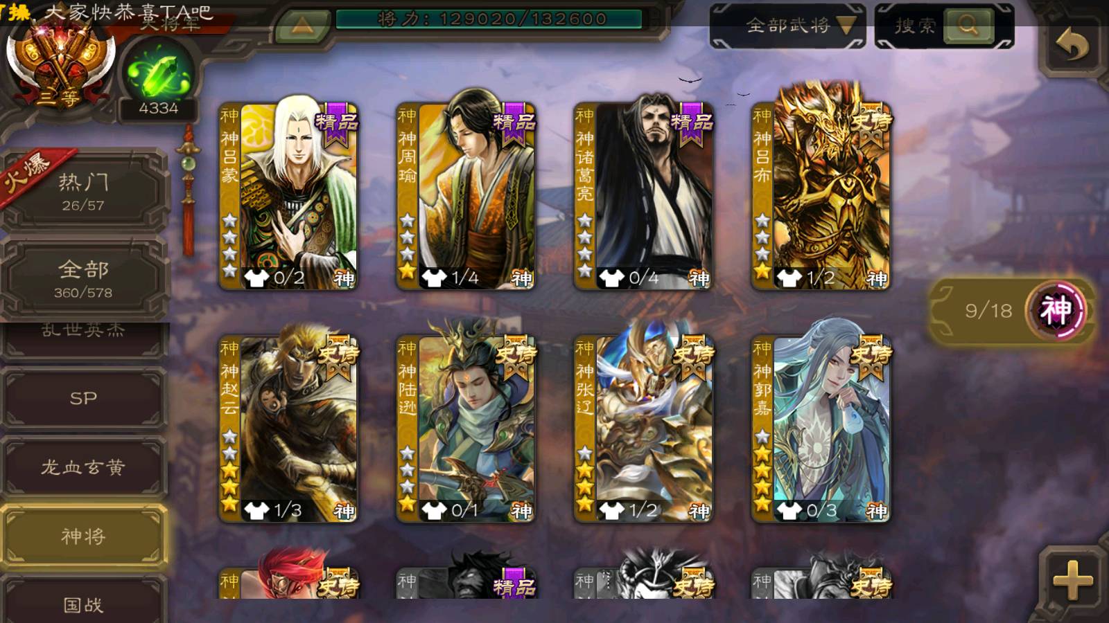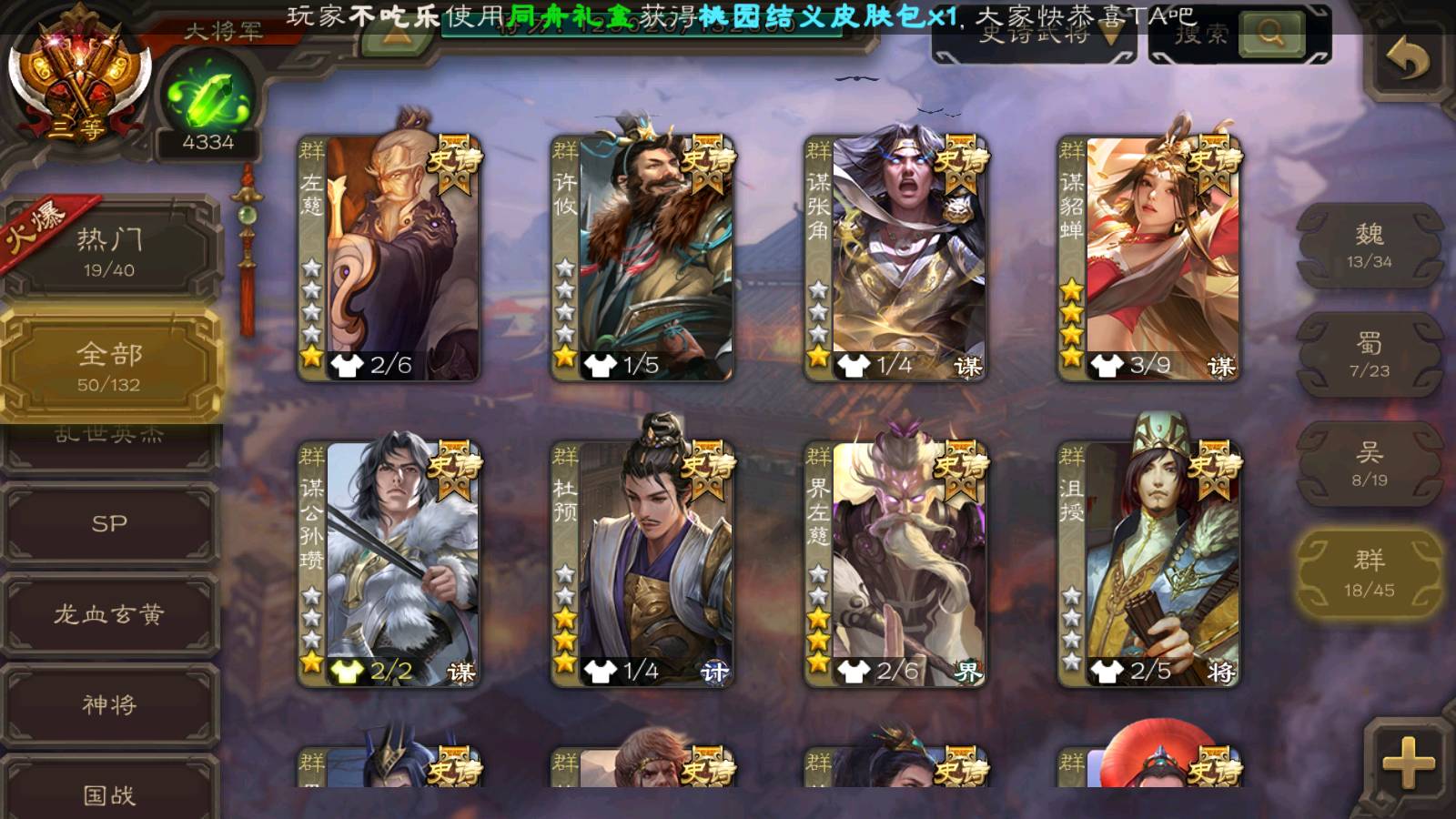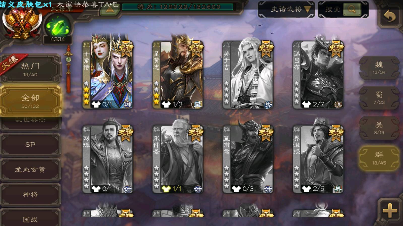(群雄):杜预,南华老仙,十常侍,谋貂蝉,界左慈,司马昭,谋公孙瓒,麴义,许攸,界李儒,苏飞,谋张角,公孙康,郑玄,星黄忠,左慈,沮授,兀突骨