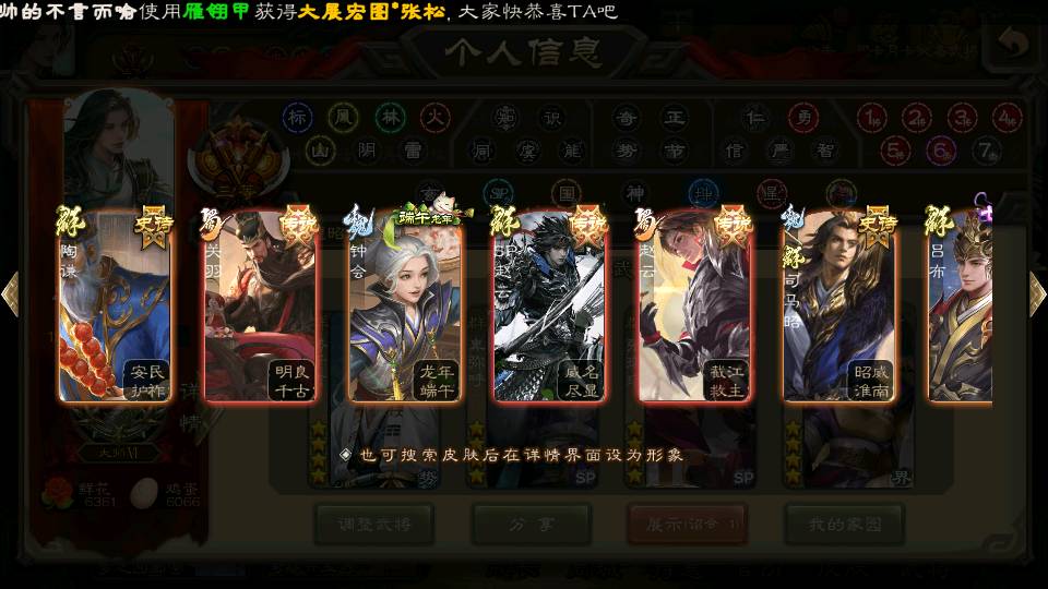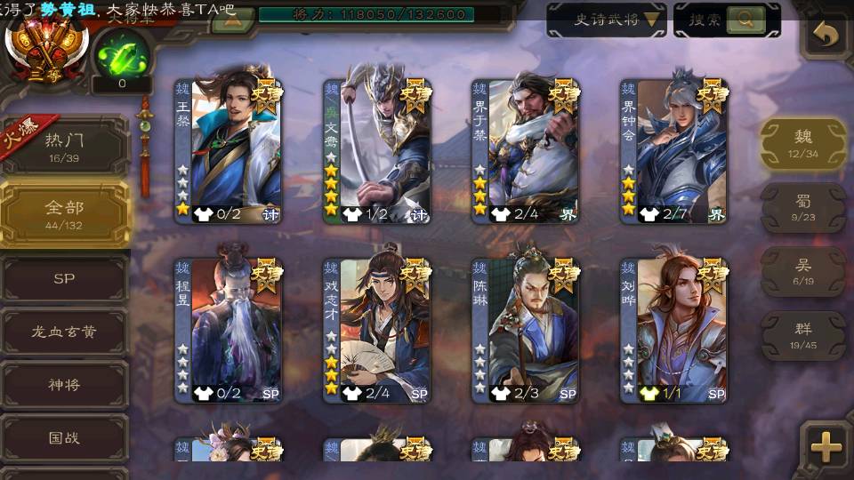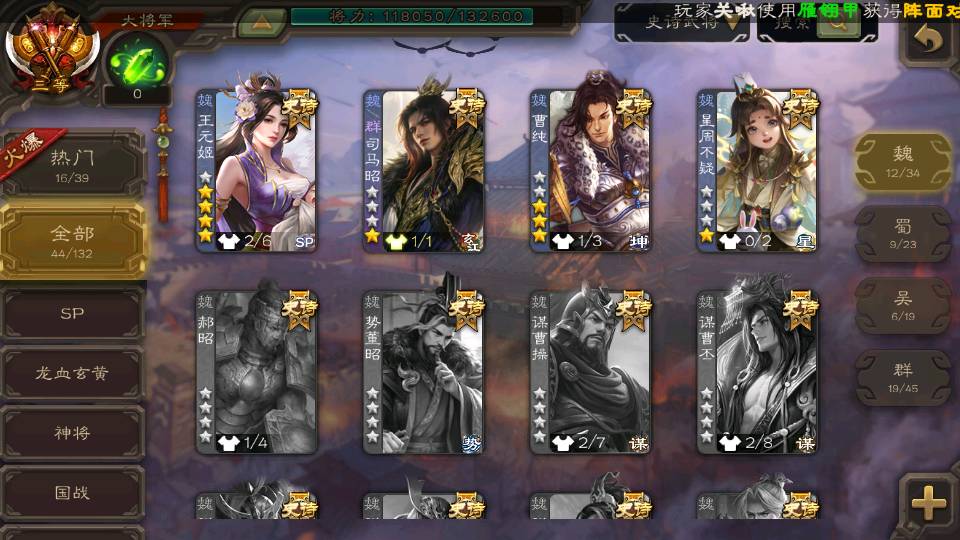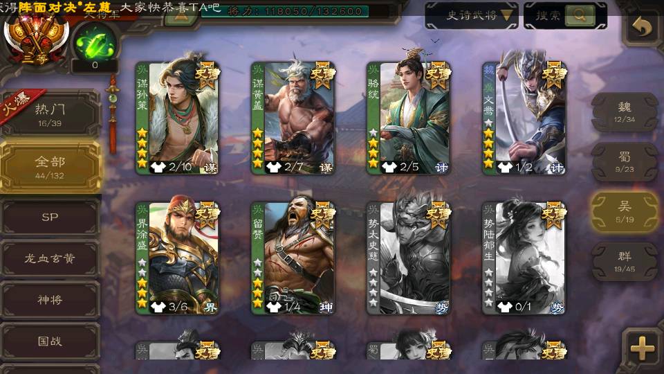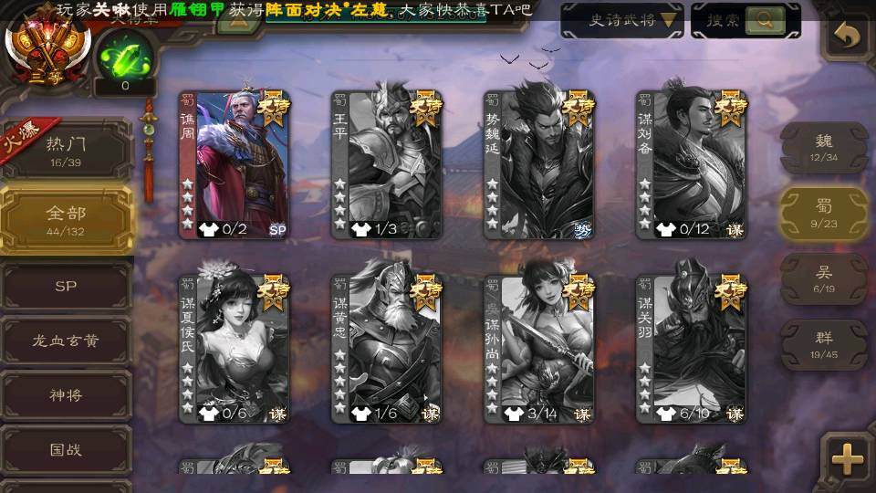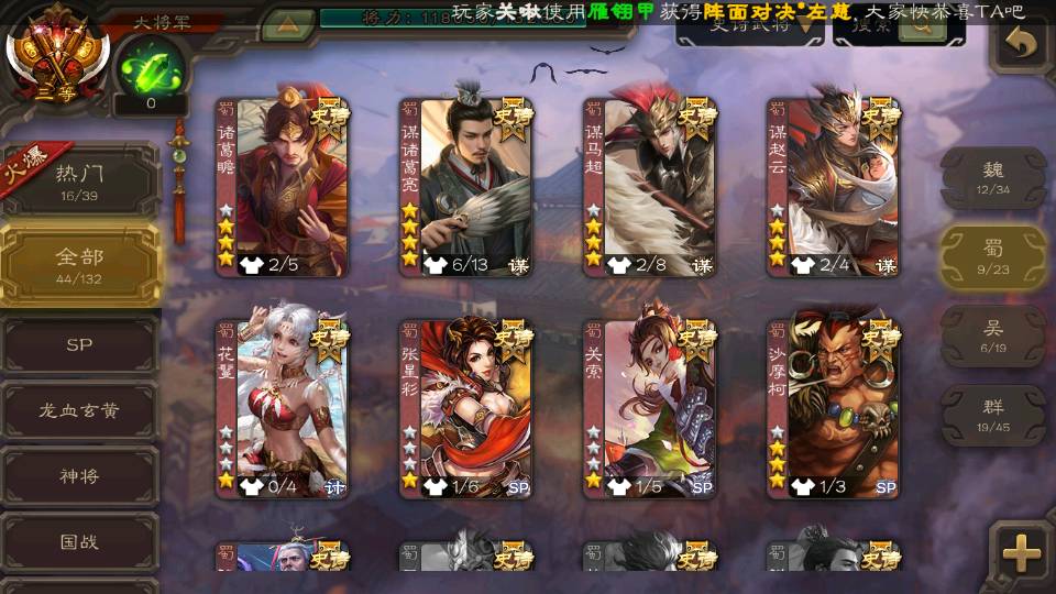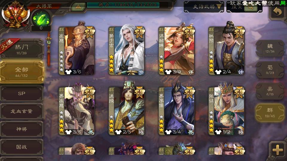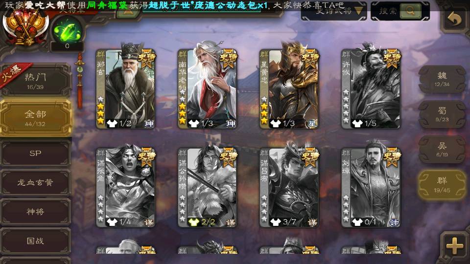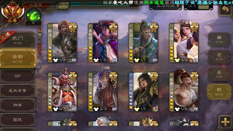 (群雄):杨彪,杜预,祢衡,界左慈,南华老仙,麴义,谋貂蝉,司马昭,张让,界李儒,势于吉,张琪瑛,卑弥呼,王允,郑玄,星黄忠,左慈,沮授,兀突骨
