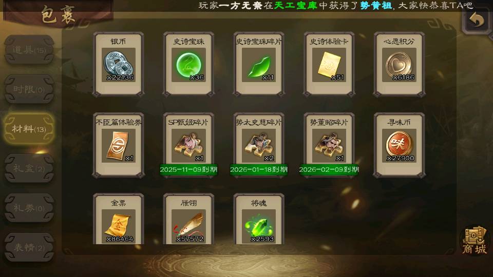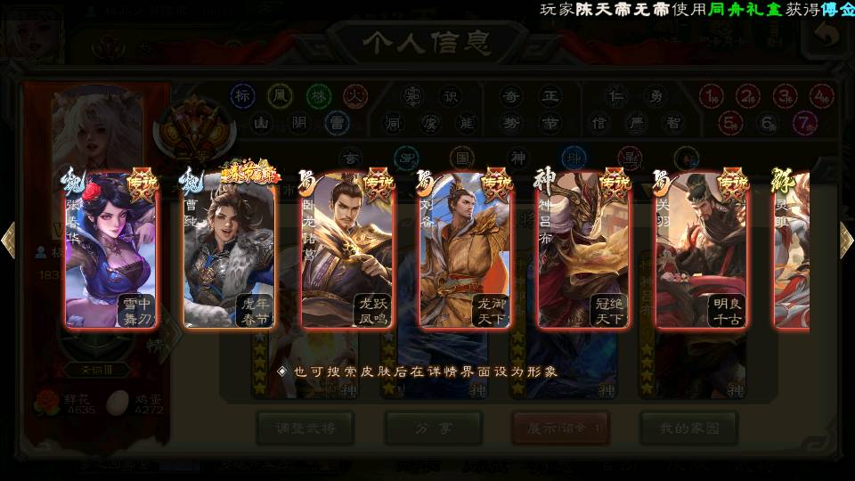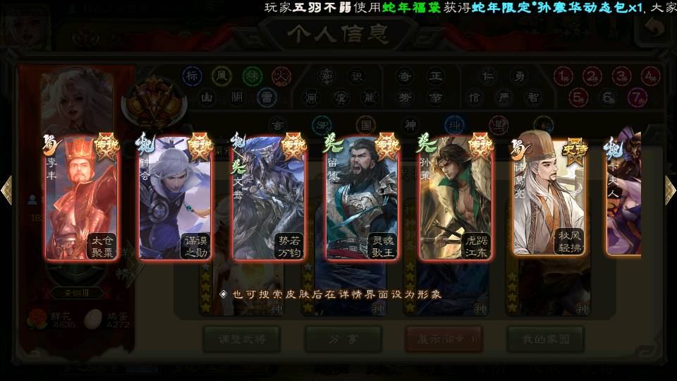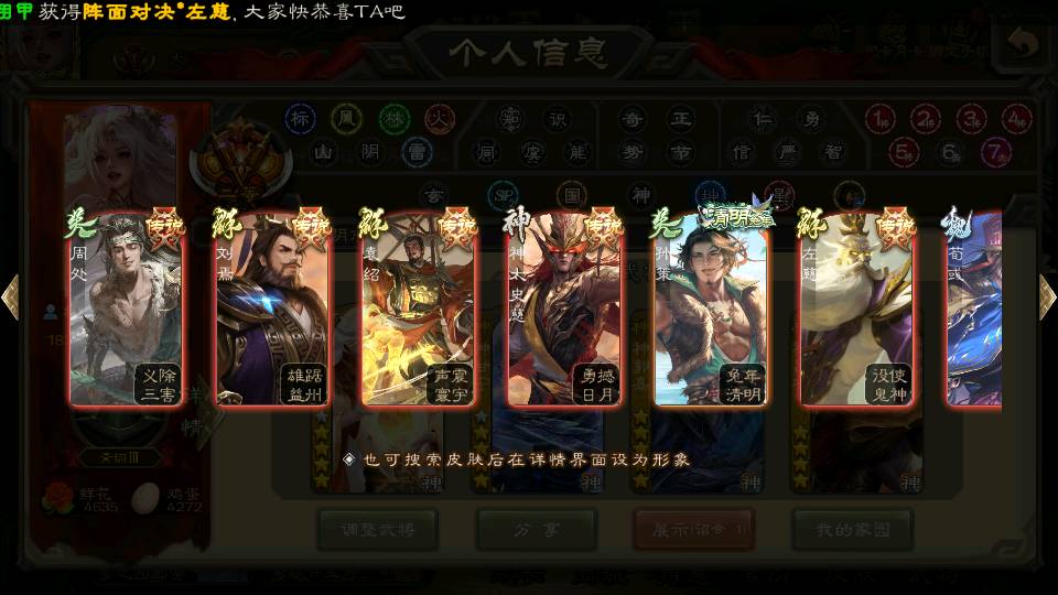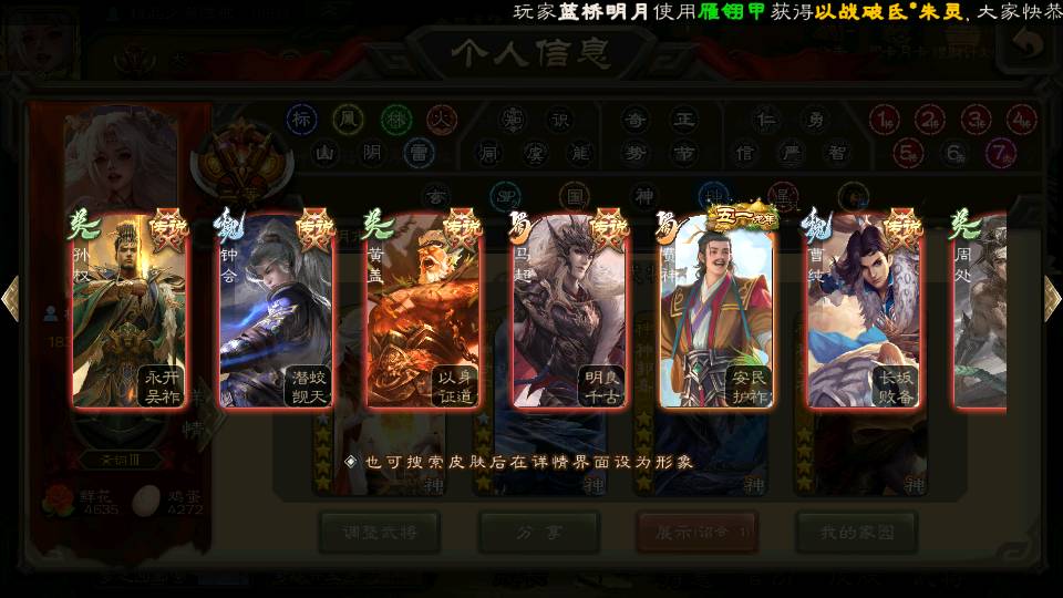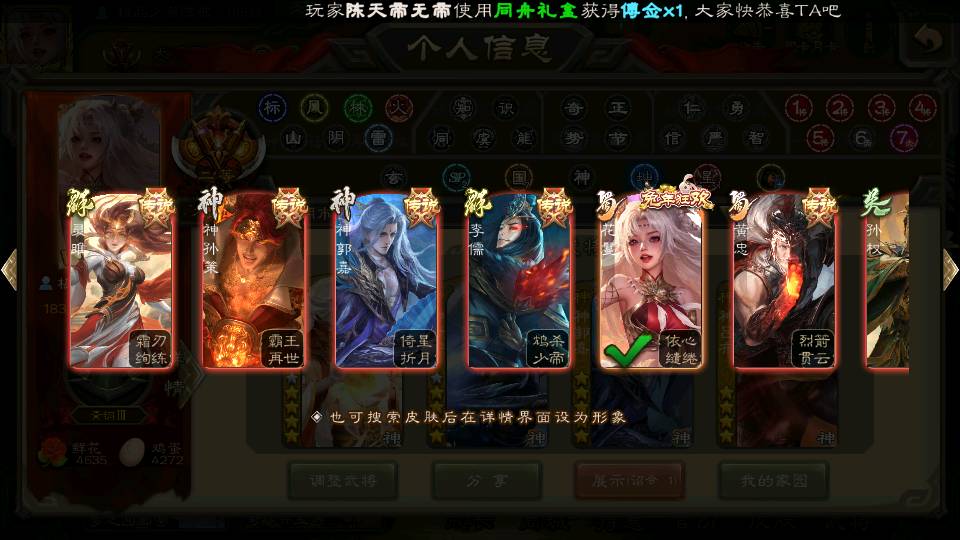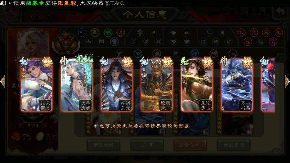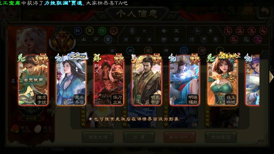 商品编号22360 全部皮肤448,动态皮肤49,全部武将388,排位武将107,国战武将93,史诗武将54,神郭嘉回廊,界钟会回廊,神孙策动皮,谋黄忠动皮,谋黄盖动皮,文鸯动皮,麴义动皮,宝珠36,金票8.6w,雁翎5.7w