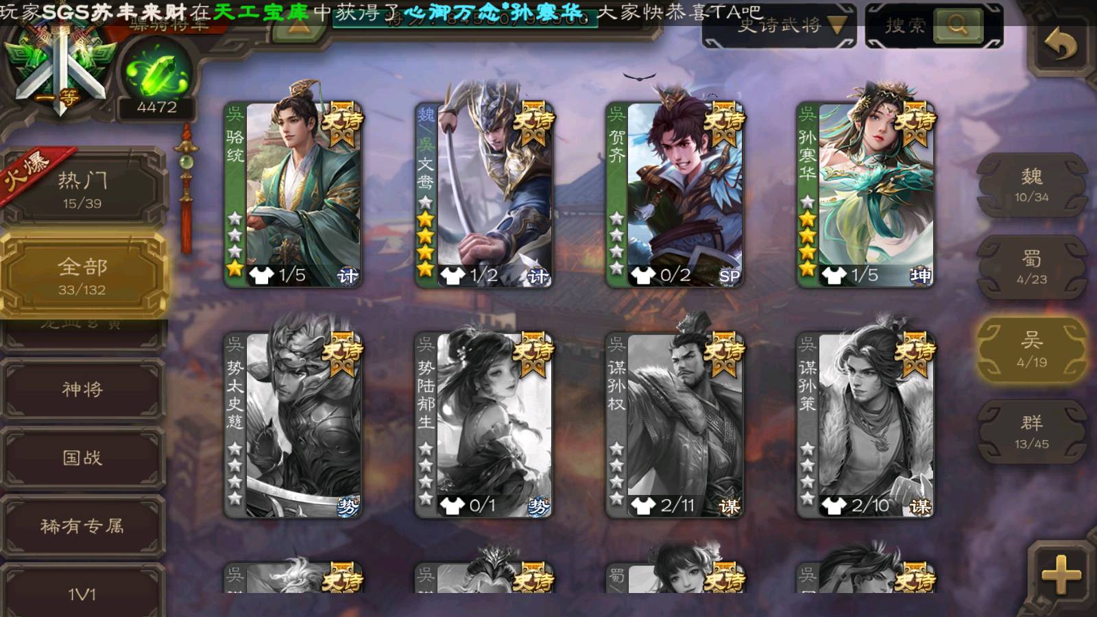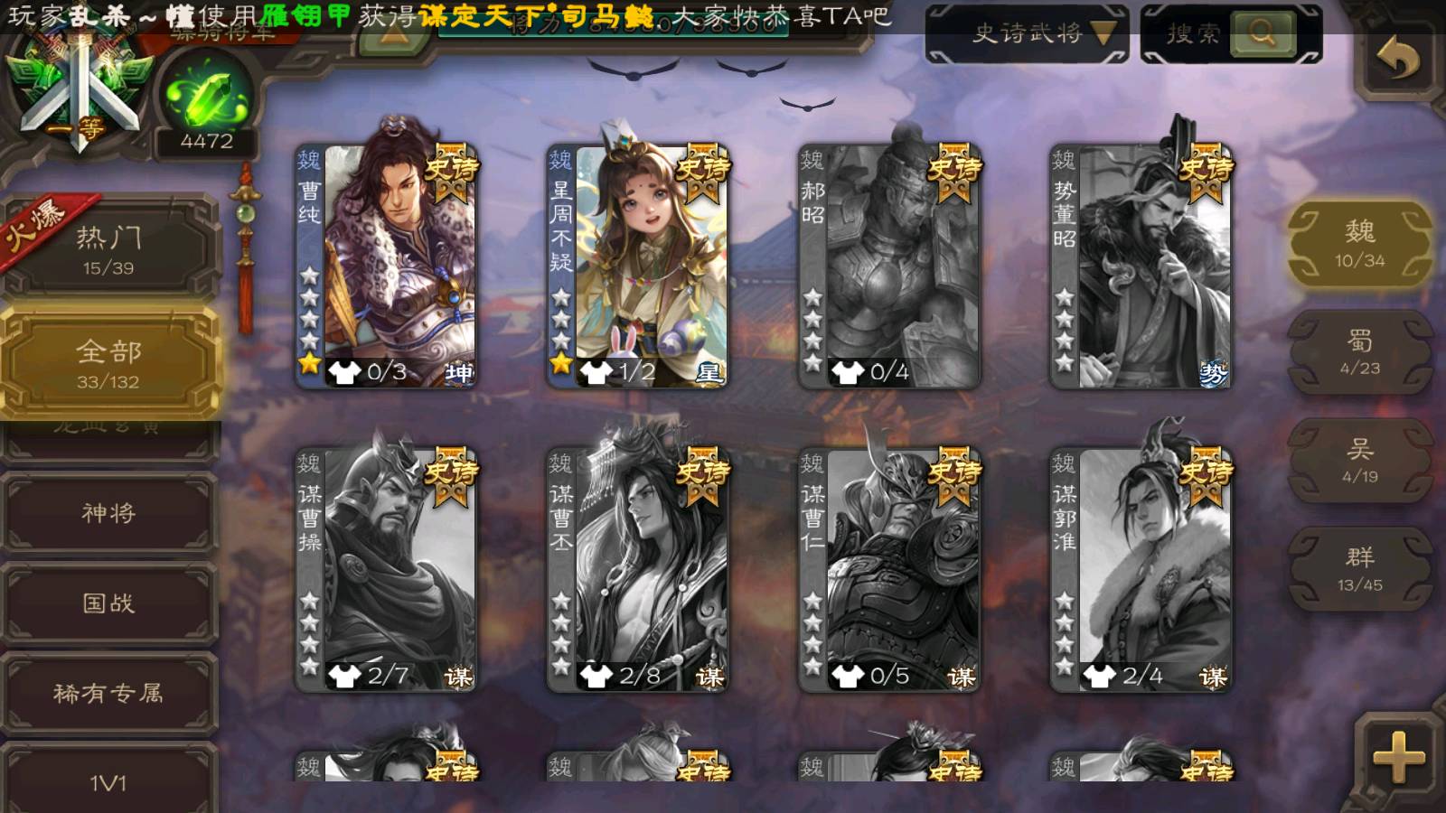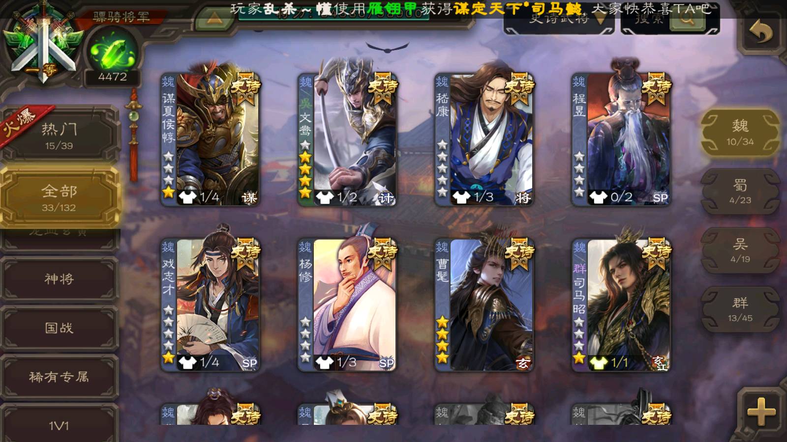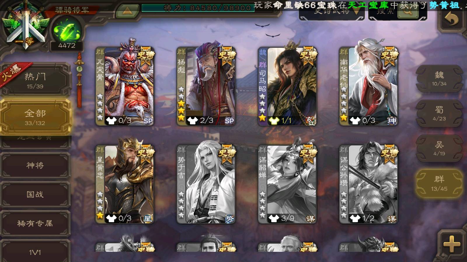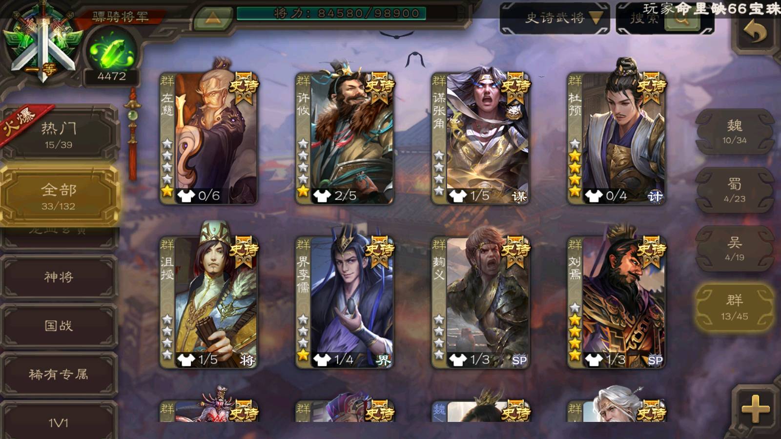 (群雄):刘焉,杨彪,杜预,麴义,许攸,南华老仙,界李儒,司马昭,谋张角,星黄忠,左慈,沮授,兀突骨