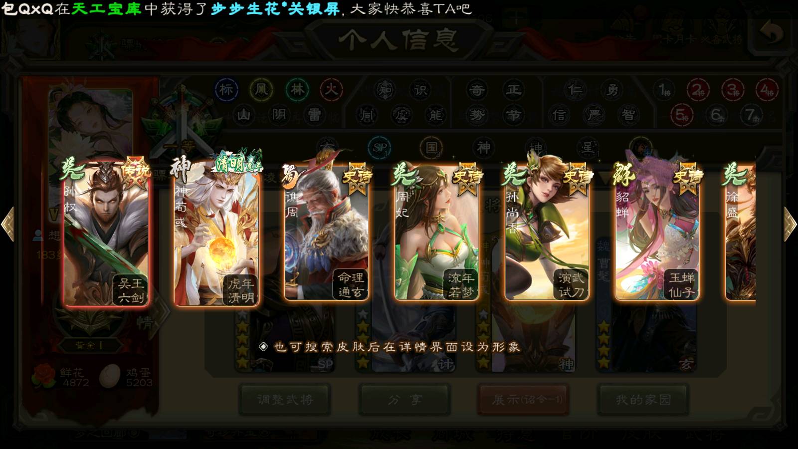商品编号22362 全部皮肤319,动态皮肤19,全部武将304,排位武将83,国战武将78,史诗武将33,文鸯新回廊,神荀彧动皮,孙寒华动皮,杨彪动皮,雁翎5.4w,将魂4.4k