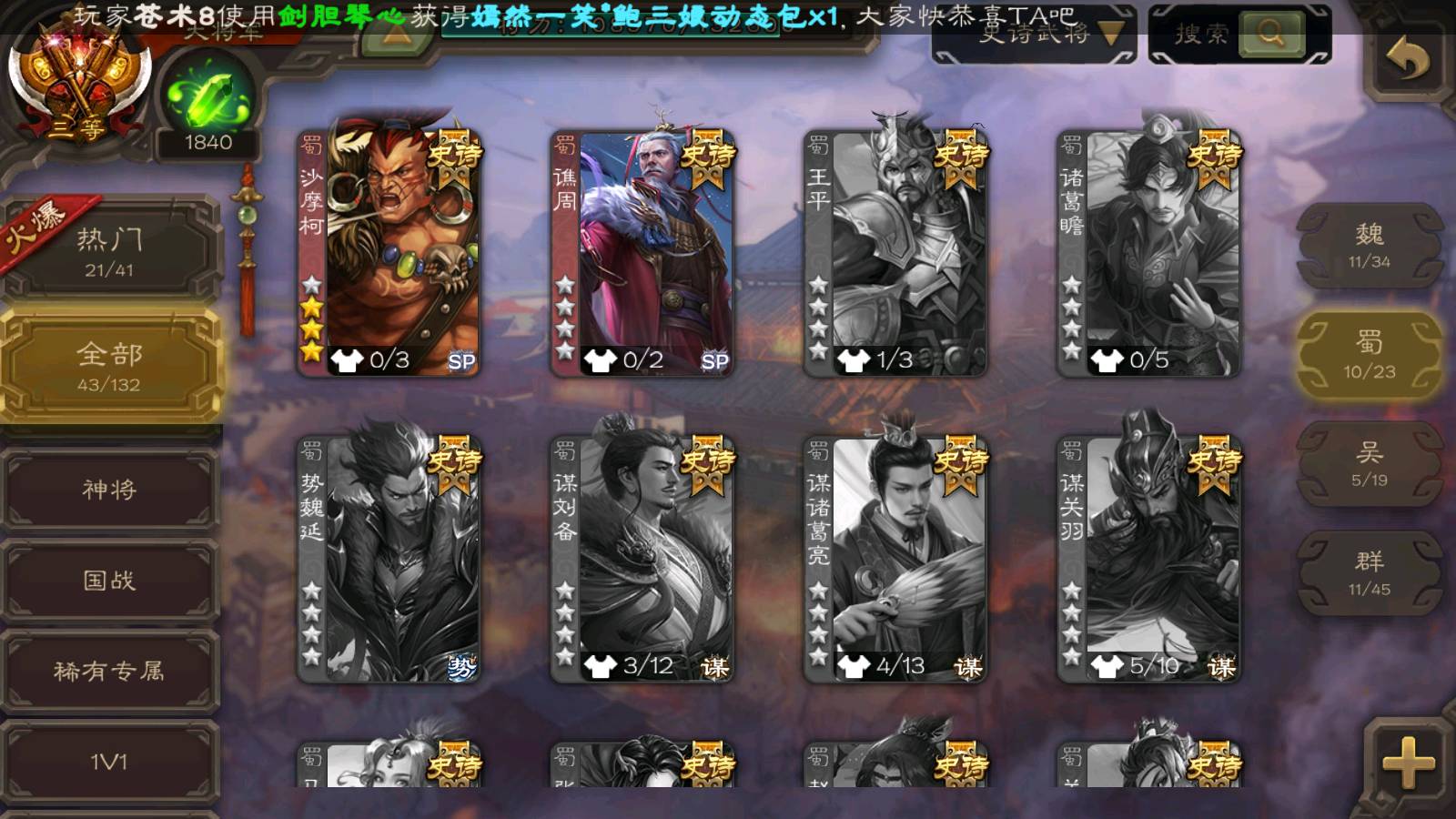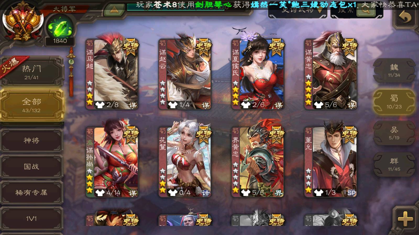 (蜀国):谋黄忠,谋孙尚香,界黄忠,沙摩柯,花鬘,谯周,谋赵云,谋马超,谋夏侯氏,董允
