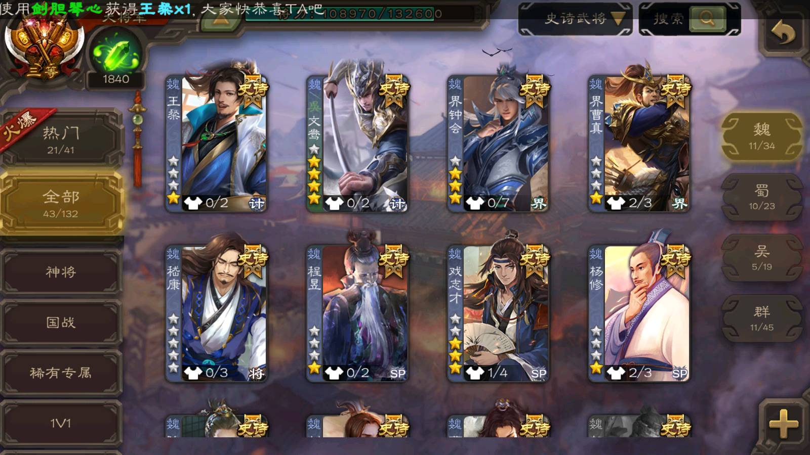 (魏国):文鸯,戏志才,界钟会,王粲,界曹真,程昱,曹纯,杨修,陈琳,嵇康,刘晔