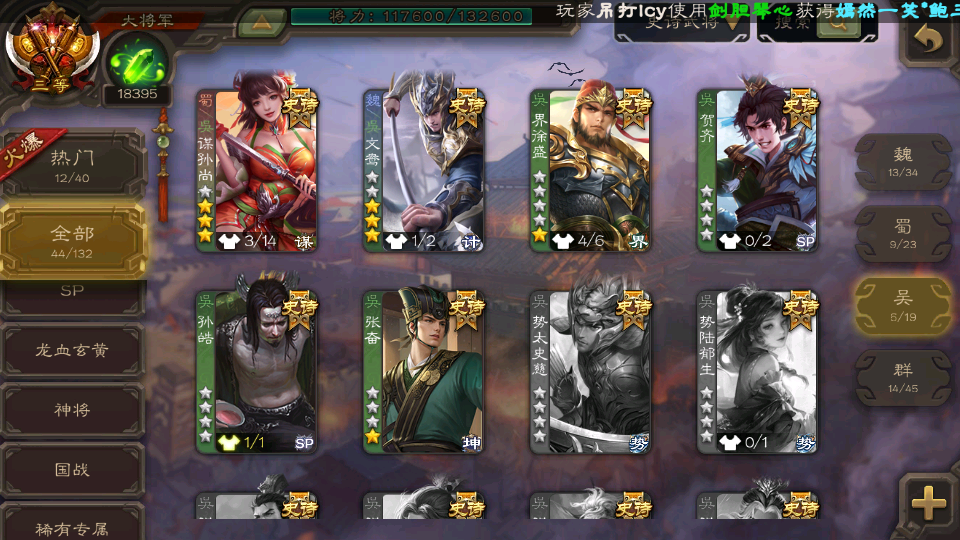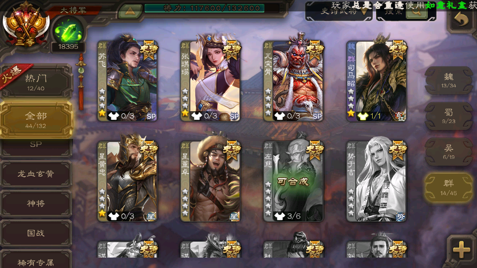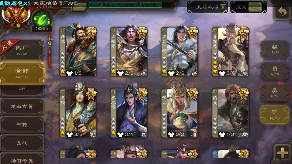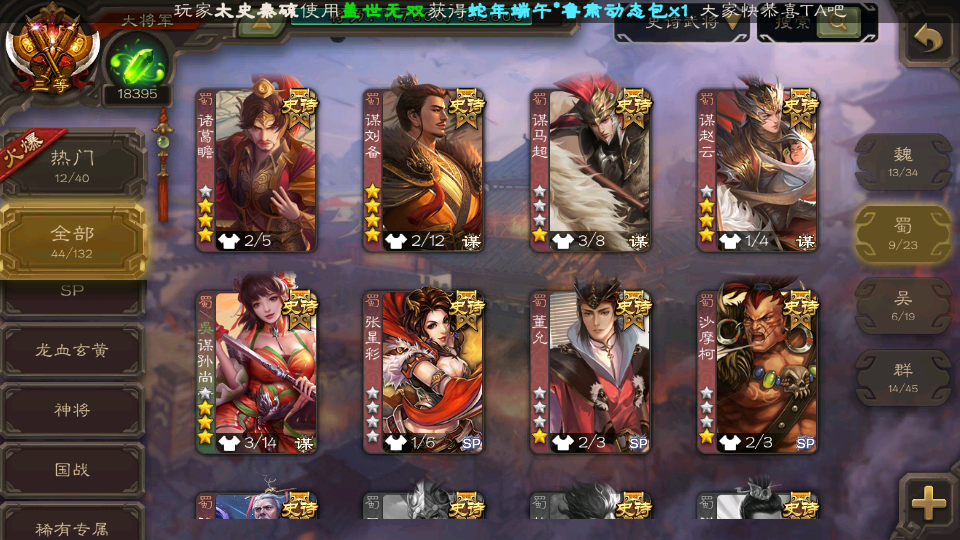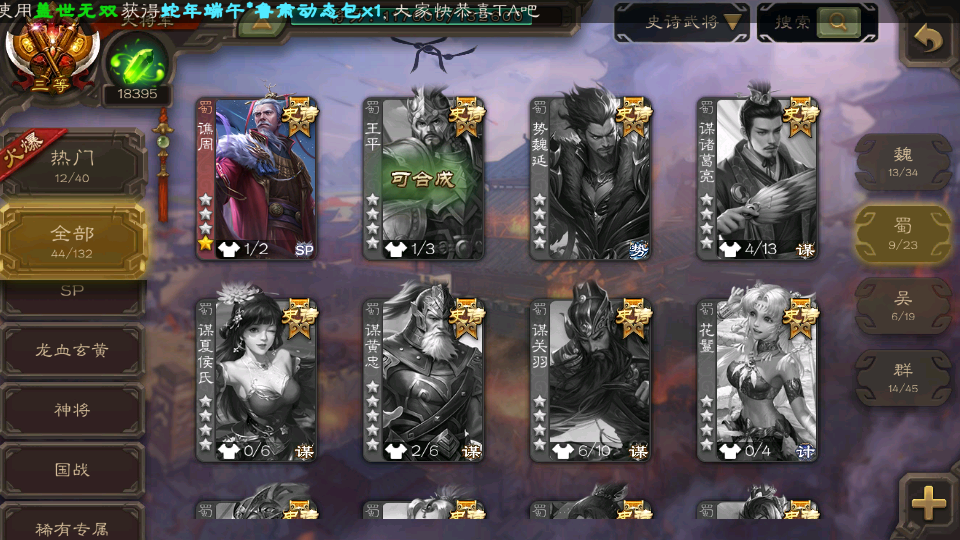 (群雄):界左慈,麴义,许攸,星董卓,司马昭,张让,界李儒,苏飞,谋公孙瓒,张琪瑛,谋张角,星黄忠,沮授,兀突骨